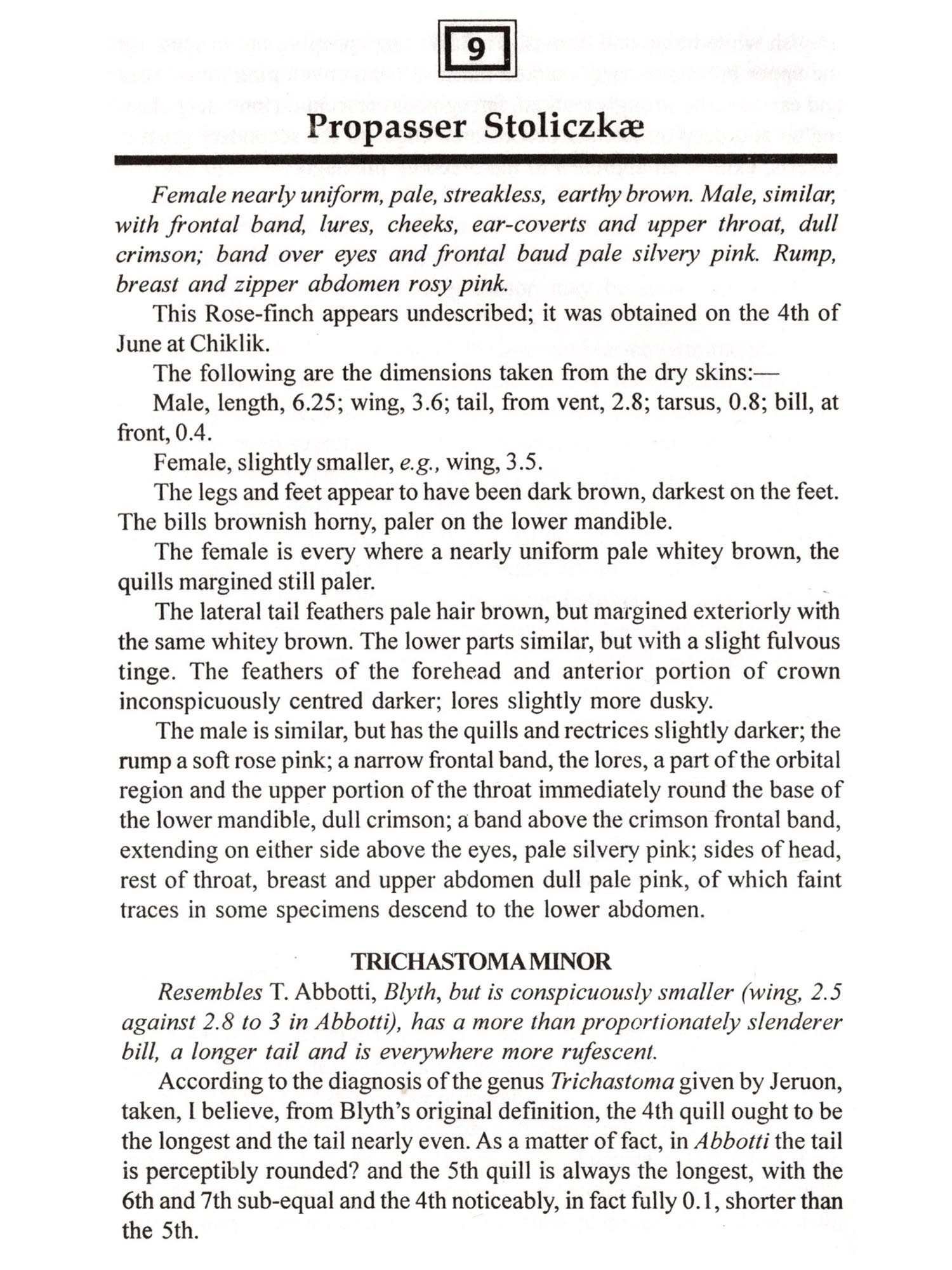 "Allan Octavian Hume was an administrator with a deep insight and understanding of the problems of rural India. He was a friend of Indian Peasantry, the champion of the aspirations of the Indian people for self-government and the foremost advocated of India's unity and nationhood." Allan Octavian Hume (June 6,1829-July 31,1912) was a Scottish Civil Servant, political reformer and the founder of the Indian National Congress. He was described by Dr. Salim Ali as 'Father' of Indian Ornithology. A. O. Hume was probably born at St. Mary Cray, Kent, (some sources point to Montrose, Angus, Scotland as his birthplace), the son of Joseph Hume, the Radical M.R. He was educated at Haileybury Training College and then University College Hospital, studying medicine and surgery. In 1849 he sailed to India and joined the Bengal Civil Service at Etawah in Uttar Pradesh. He soon rose to become District Officer, Introducing free primary education and creating a local vernacular newspaper, 'Lokmitra'. He married Mary Ann Grindall in 1853. In 1867 he became Commissioner of Customs for the North West Province and in 1870 became attached to the central government as Director-General of Agriculture. In 1879 he returned to Provincial Government at Allahabad. Hume retired from the civil service in 1882. In 1883 he wrote an open letter to the graduates of Calcutta University, calling upon them to form their own national Political movement. This led in 1885 to the first session of the Indian National Congress held in Bombay. Hume served as its General Secretary until 1908. Hume left India in 1894 and settled at Upper Norwood in London. He is buried in Brook ward Cemetery. During his career in India he started with a systematic plan to survey and document the birds of the Indian subcontinent and in the process he accumulated the largest collection of Asiatic birds in the world, housed in a museum and library at his home in Rothney Castle on Jakhu Hill, Shimla (Himachal Pradesh). Hume used this vast bird collection to produce a publication on all the birds of India. This work was lost in 1885 when all his manuscripts were sold by a servant as waste paper. A landslip caused by heavy rains in Shimla damaged his personal museum and specimens.