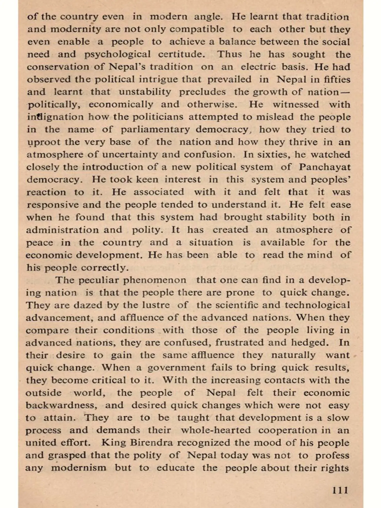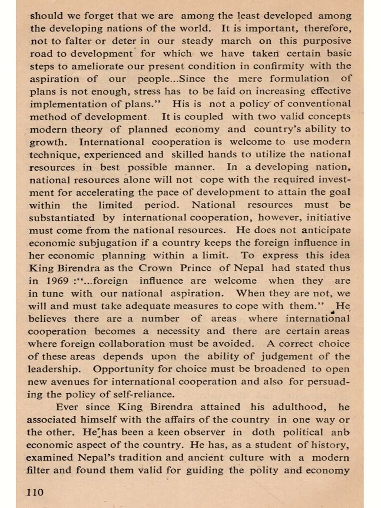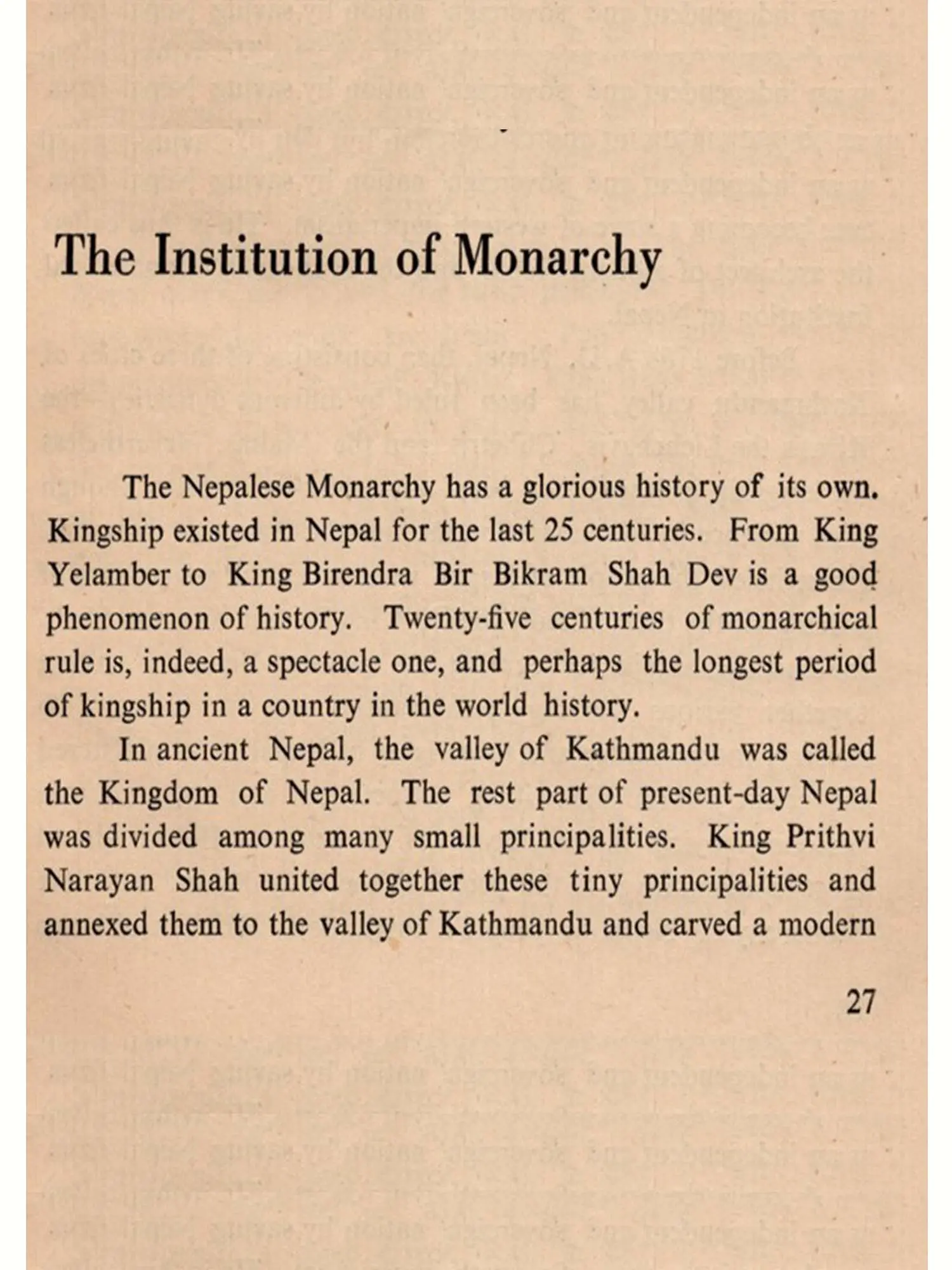 For a casual observer of the world map, Nepal, a tiny Himalayan kingdom nesting on the lap of the Great Himalayan ranges, may be lost between the vast lands of Indian sub-continent and the giant China. Nepal, the abode of twelve million simple, hardy, content, and peace-loving people, has, nevertheless, a very glorious past. Nepal claims her own dignified place with her ancient tradition and culture second to none. However, Nepal's significance is conveniently obliterated by the outside world in their glaring sublimity of scientific advancement and economic development. Nepal, an independent and sovereign nation on her own merit, preferred poverty