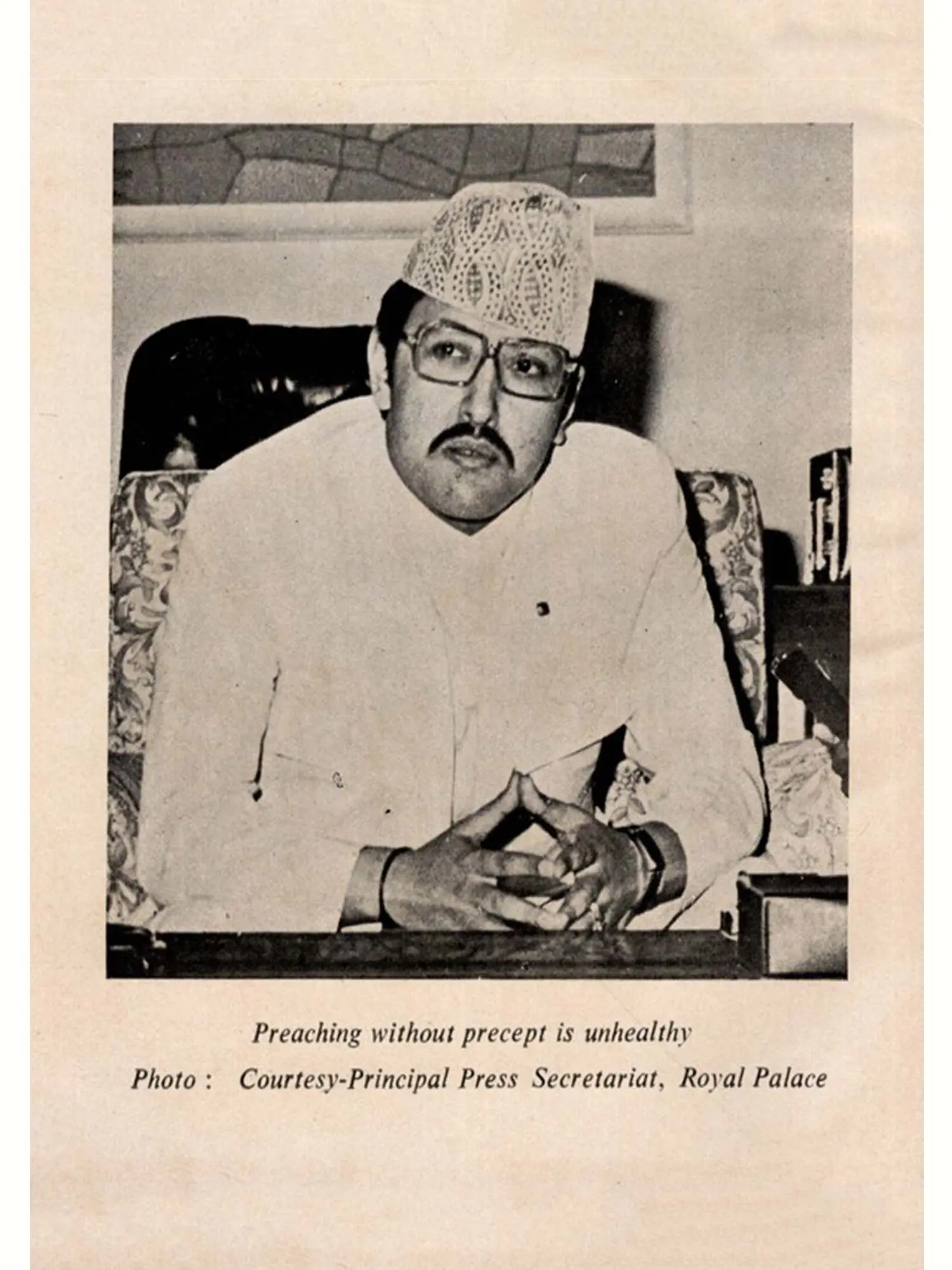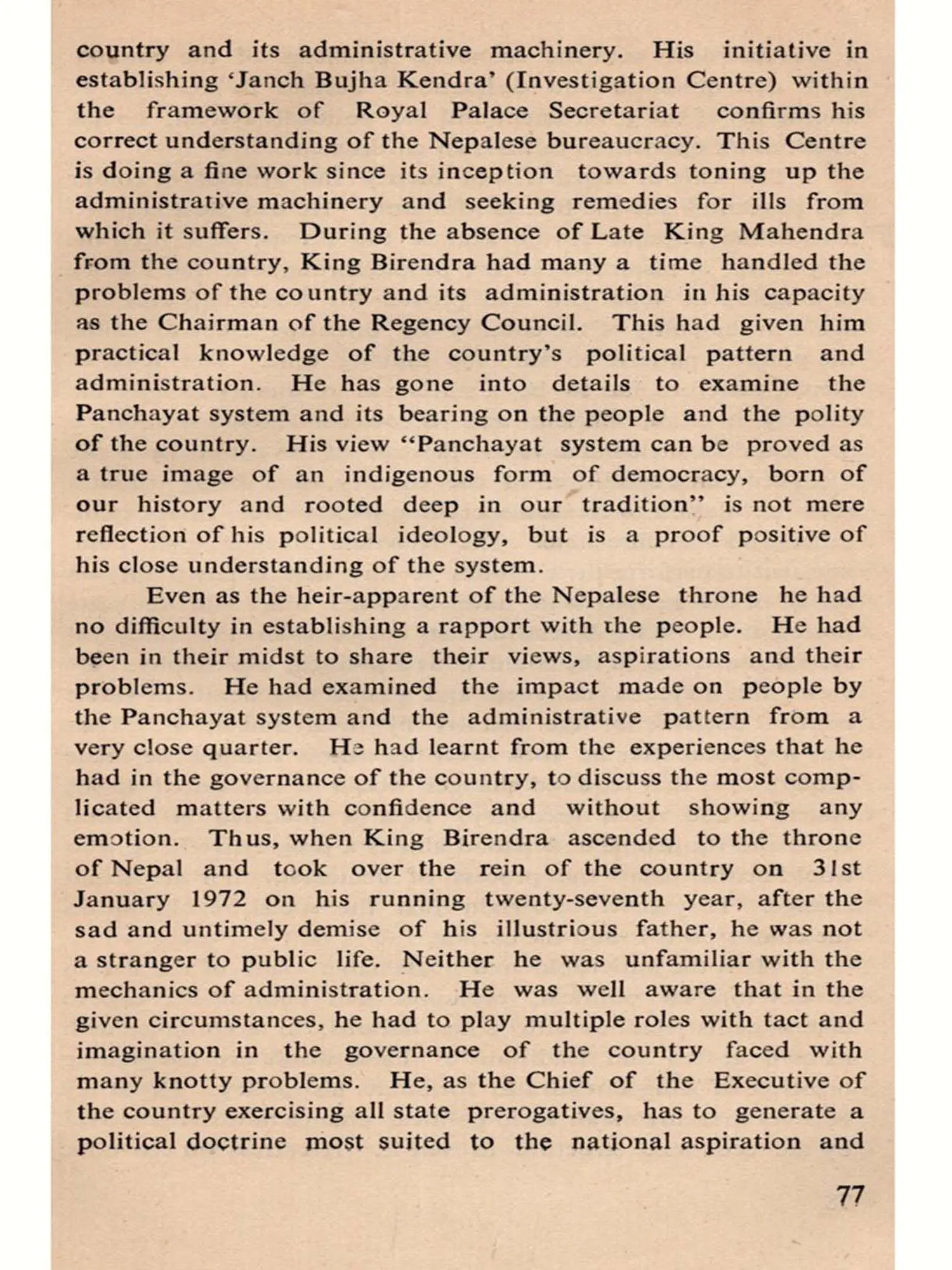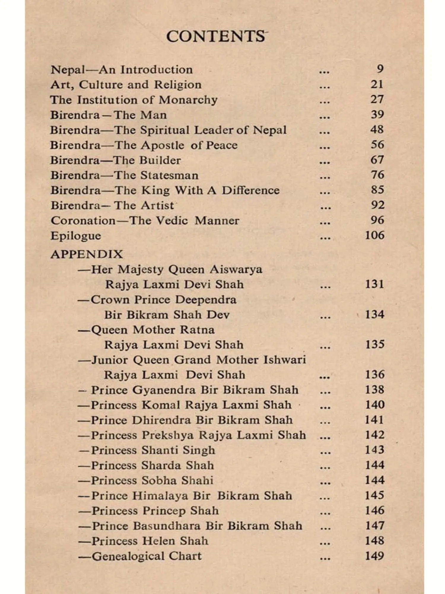 For a casual observer of the world map, Nepal, a tiny Himalayan kingdom nesting on the lap of the Great Himalayan ranges, may be lost between the vast lands of Indian sub-continent and the giant China. Nepal, the abode of twelve million simple, hardy, content, and peace-loving people, has, nevertheless, a very glorious past. Nepal claims her own dignified place with her ancient tradition and culture second to none. However, Nepal's significance is conveniently obliterated by the outside world in their glaring sublimity of scientific advancement and economic development. Nepal, an independent and sovereign nation on her own merit, preferred poverty