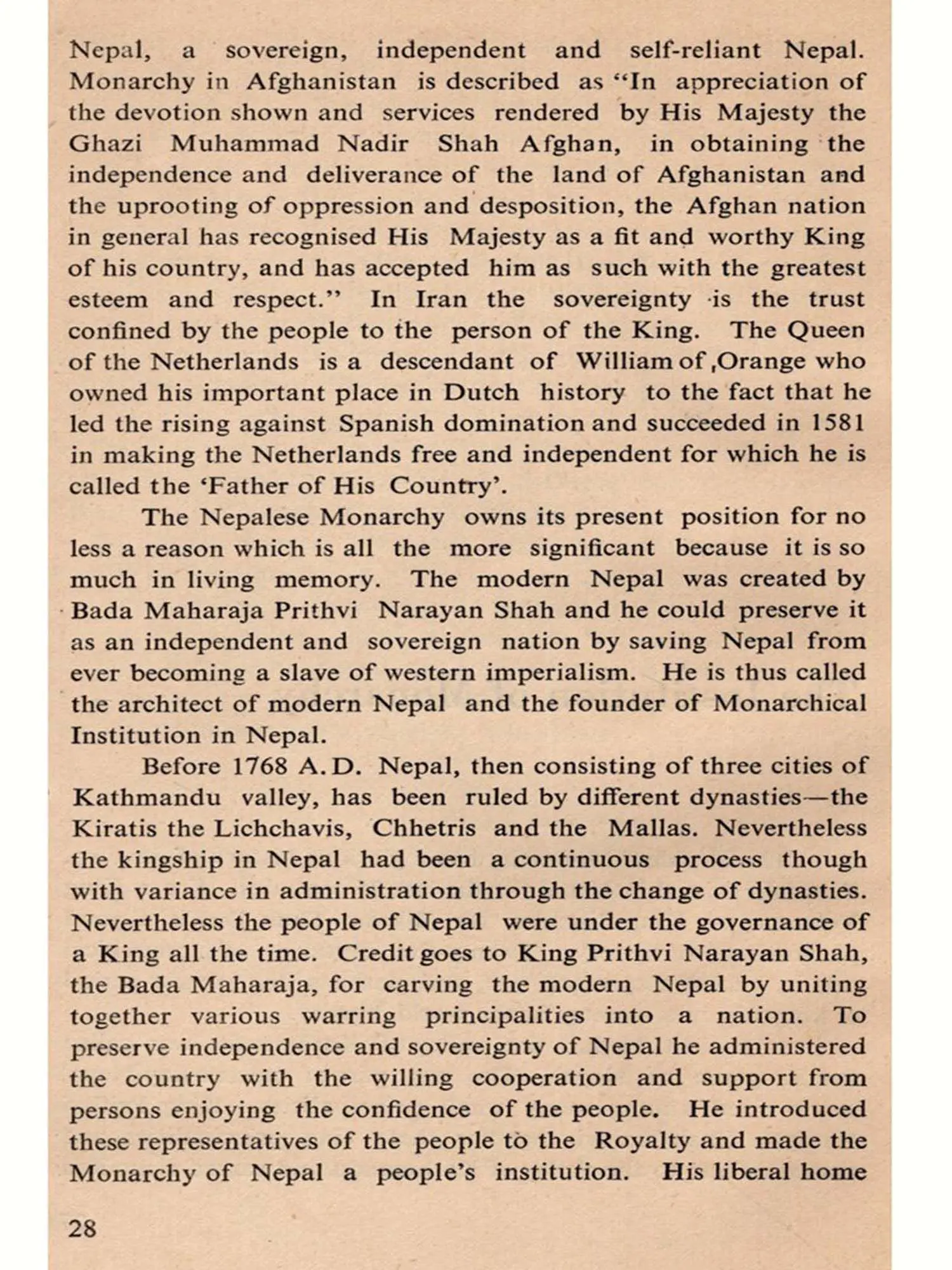 Small, yet docile, Nepal clashed many a time against the colonial ambition of the then British Empire. She stood firmly and resolutely to safeguard her independence even though she had to pay dearly for it. For the same cause, Nepal also fought with the Chinese Empire against heavy odds. All those heroic and laudable deeds of Nepal, the crest-jewel of the Himalayan states, richly deserved appreciation and these amply qualify her to be a proud, exalted and distinguished nation, though week in size backward in economic and scientific development.