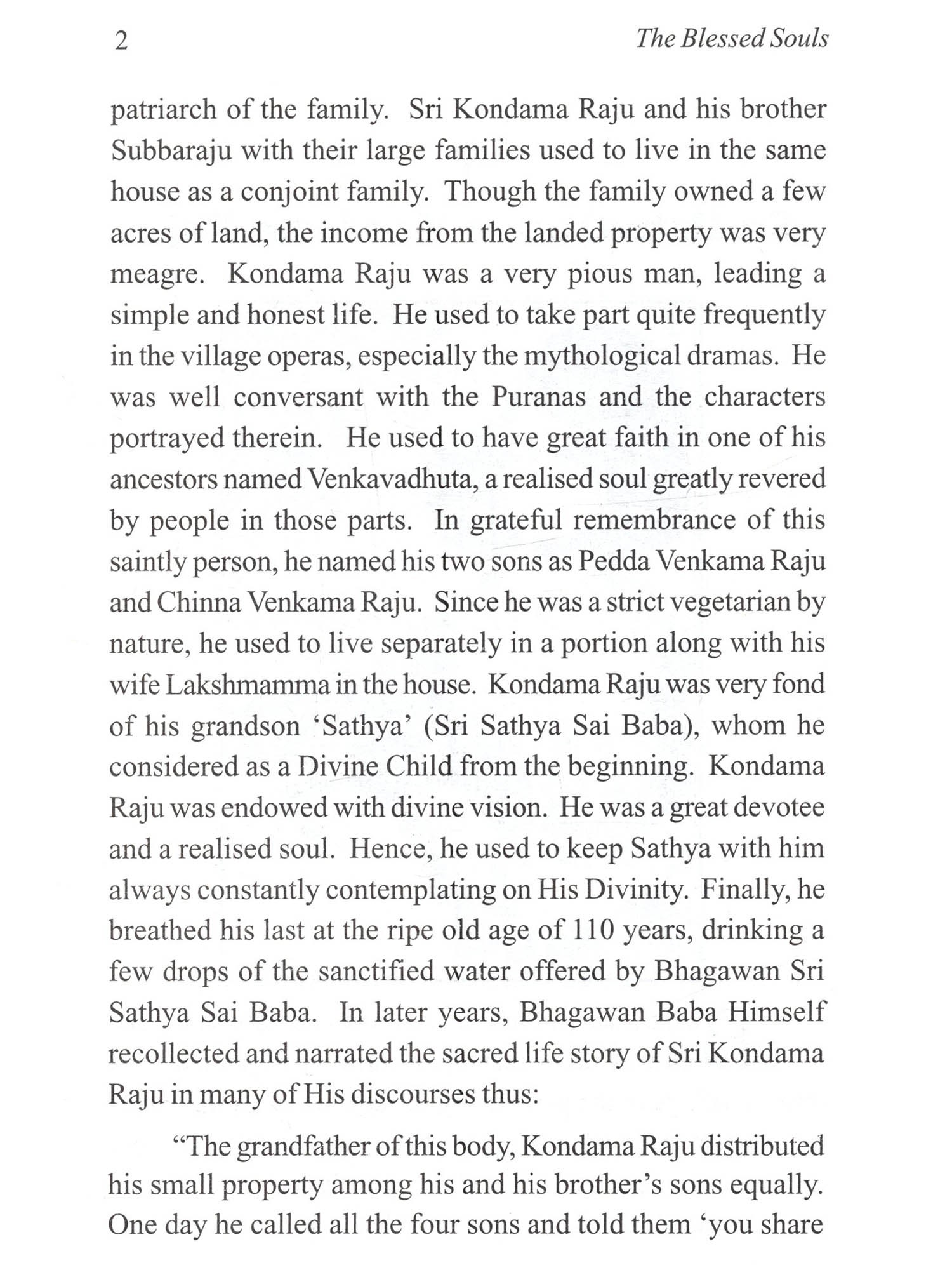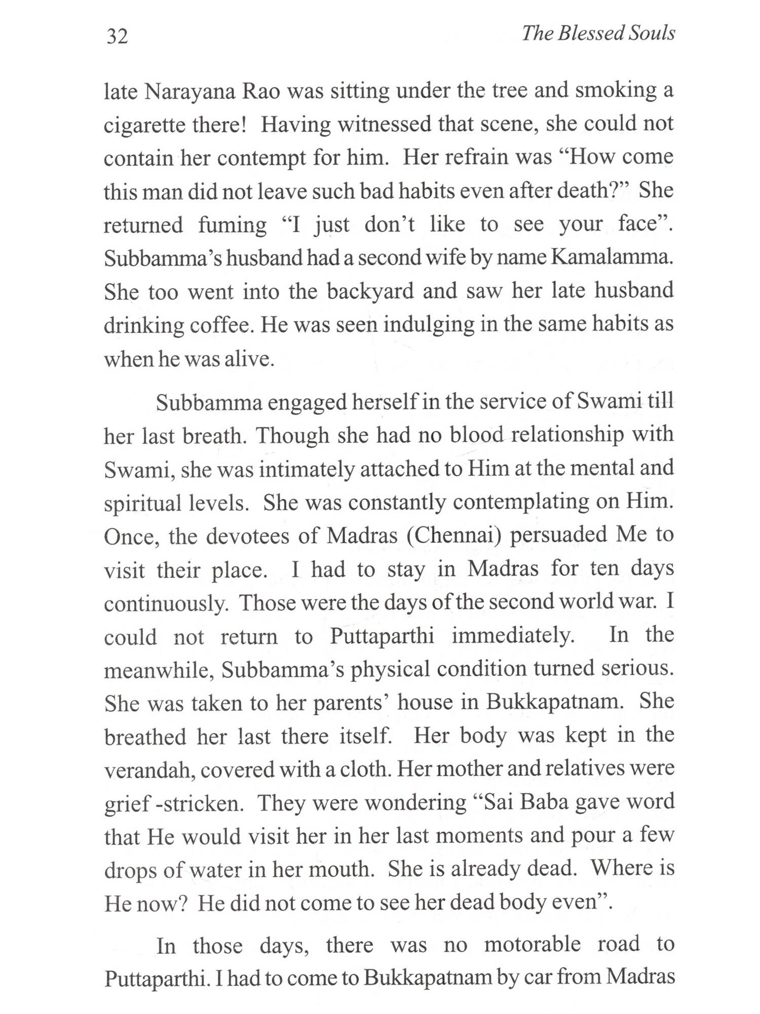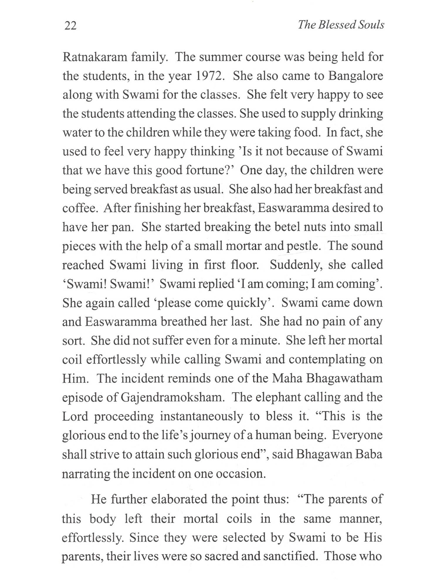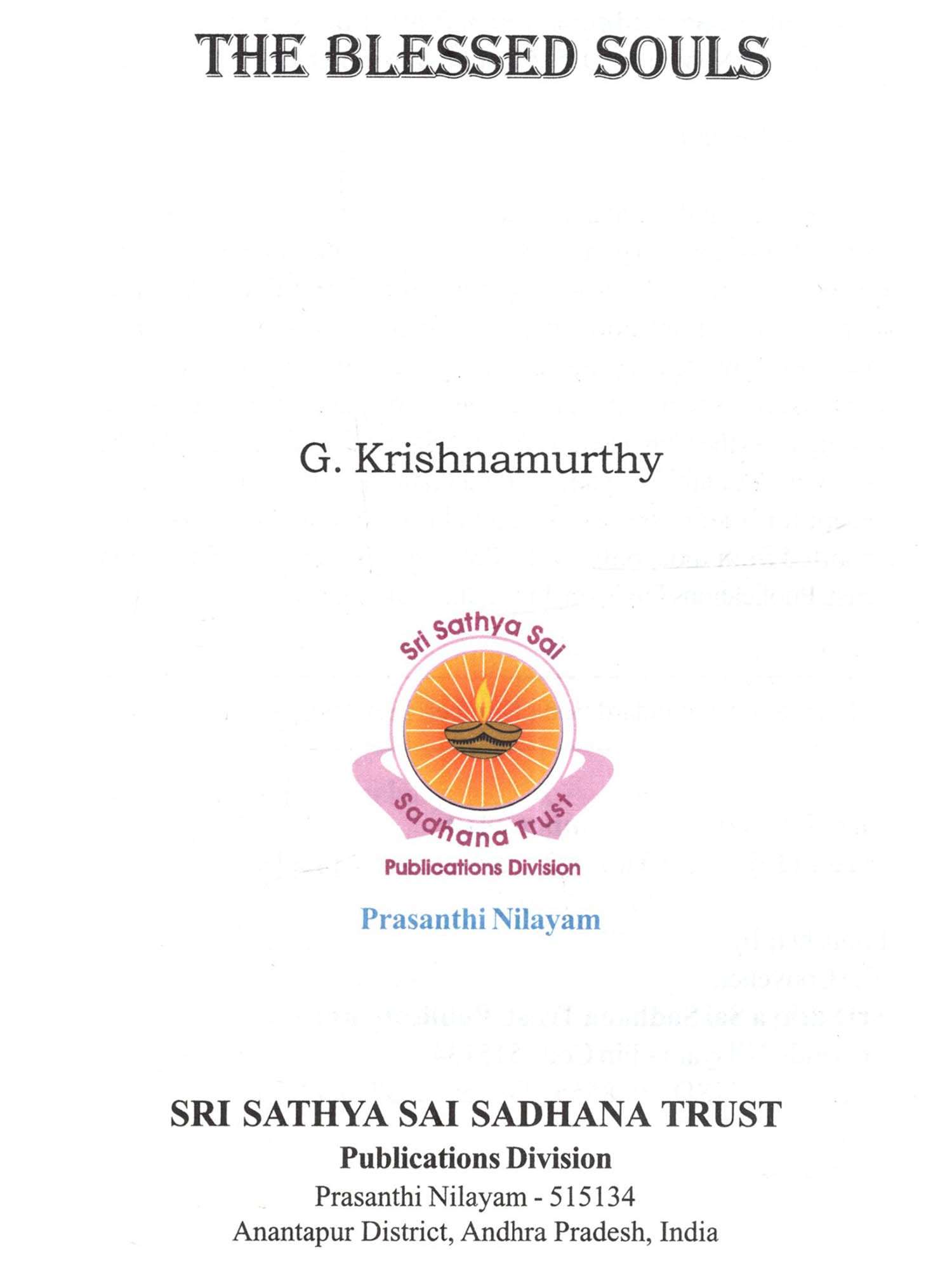 Bhagawan Sri Sathya Sai Baba, the Yugavathar in Kali had beautifully described this concept in a poem thus: "That Nandabala (Lord Krishna) had come As Anandabala (the blissful child) In search of His companions; That Ramachandra (Lord Rama) had come As Aramachandra (giver of happiness) To find His erstwhile bantus (servitors) That Maha Vishnu (Lord Vishnu) had come As Mahi Vishnu (Vishnu on this earth) To don His weapons for establishing righteousness; That Easa (Lod Easwara) had come As Bala Sayeesa (The divine child Sai) To play with His group (of devotees); That Supreme Lord as the Puppeteer Keeps the beings as puppets on the stage of this Universe And the divine play goes on and on! Let us enjoy the play and describe it a little.' In the Avatharic Mission of Bhagawan Sri Sathya Sai Baba that has been going on for more than eight decades, several noble souls have played their part to the best of their ability and in a manner that is pleasing to Bhagawan and thus sanctified their lives. In the end, they merged in the Divine Lotus Feet of Bhagawan Baba. A list of 21 such individuals has been made out and a compilation entitled 'The Blessed Souls' is brought out on the occasion of the 85th year of the Advent of Bhagawan Sri Sathya Sai Baba, depicting their contribution to the Avatharic Mission, their selfless service, their experiences and their spiritual relationship with Bhagawan. It is possible that there may be millions of such blessed souls all over the world who have dedicated their lives for Bhagawan's Mission. For fear of the compilation growing voluminous, their stories have not been included in the book. We pray we may be pardoned for this omission. Nevertheless, we offer our salutations to all those noble souls. It is hoped that this compilation 'The Blessed Souls' would inspire millions of devotees and sadhaks all over the world in their journey to Sai. We humbly submit this small compilation at the Lotus Feet of Bhagawan Sri Sathya Sai Baba for His Divine Blessings.