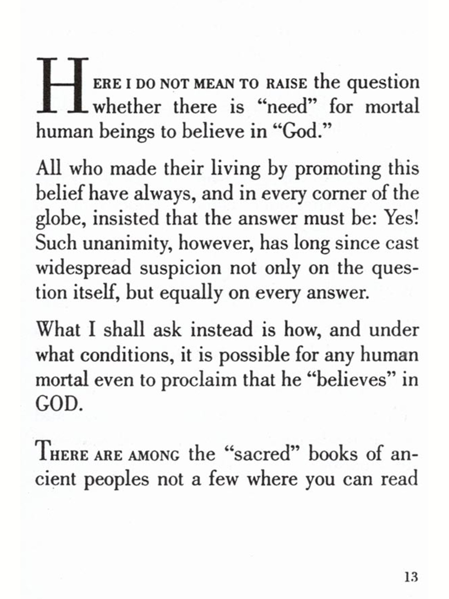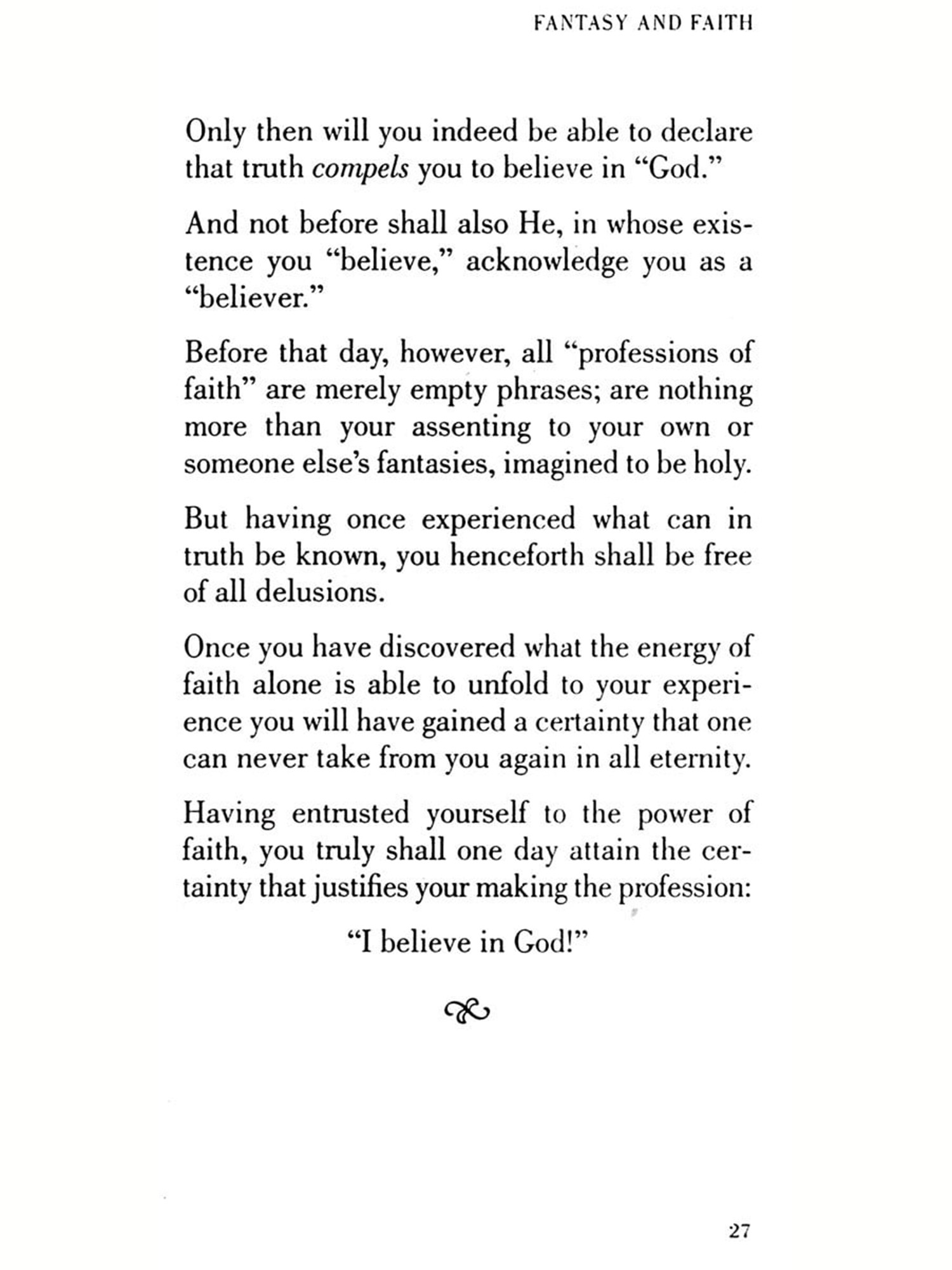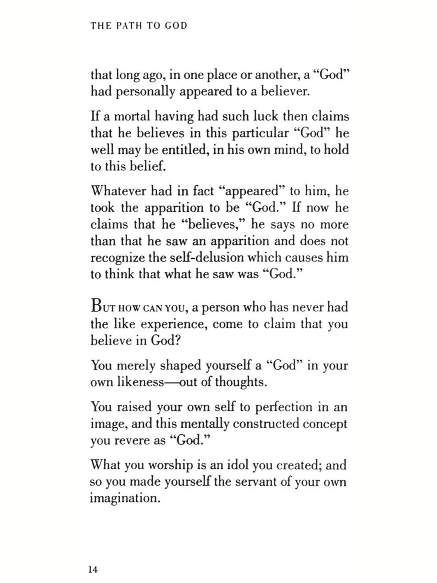 "Here I shall not raise the question whether there is "need" for human beings to believe in "God." All who made their living by promoting this belief have always, and in every corner of the globe, insisted that the answer must be: Yes!"-Page 13 "You treat your "God" as merely good enough to be addressed with the familiar "thou" and-having lost all sense of distance and proportion in your hubris -presumptuously demand that nothing else should stand between yourself and him." Page 36 "I do not mean to offer you some new "belief," but seek instead to guide your soul to certainty: to that objective truth which is experienced only as reality" -Page 68 "You hardly can expect to find your path to God as long as in your earthly life your "yes" and "no" are not determined by precise, inviolable limits." -Page 75 "Among the few that have gained freedom from that unseen ruler's bondage there was one who in his day described him as the "prince of darkness." But those who heard him did not know of whom he spoke; nor do you know it even now."-Page 90 "The path's beginning, middle, and its goal are in yourself; and likewise in yourself alone shall highest help be offered you."-Page 107 "Your path to God was but the journey to your own perfection." Page 108
