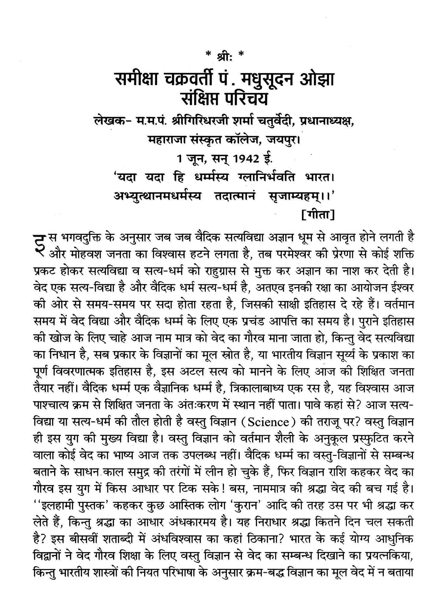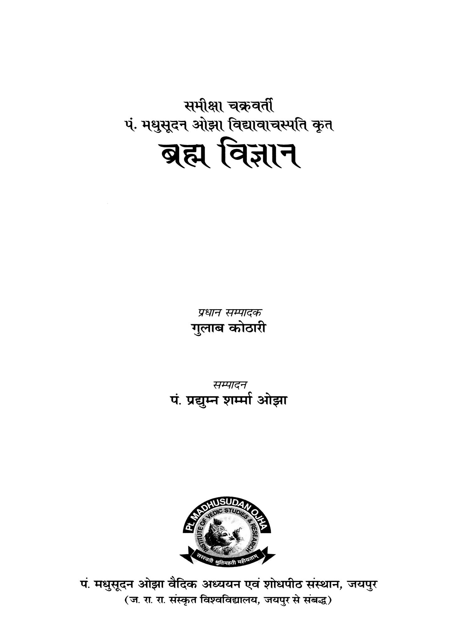 'ब्रह्म विज्ञान' का द्वितीय संस्करण प्रस्तुत करते हुए मुझे अपार हर्ष होता है। वेदविद्या वाचस्पति पं. मधुसूदन ओझा का यह एकमात्र ग्रन्थ है जो उन्होंने बोल-बोल कर हिन्दी में लिखवाया था। प्रथम बार ओझा जी महाराज के सुपुत्र पं. प्रद्युम्न कुमार ओझा ने वि.संवत् 2000 में इसे संपादित कर प्रकाशित किया था। इसके बाद ग्रन्थ अप्राप्य हो गया। विद्यावाचस्पतिजी के ग्रन्थों की खोजबीन के दौरान जब मै उनकी पौत्री श्रीमती शान्ता देवी और पौत्र श्री पद्मलोचन से मिला तो मुझे उन्होंने बताया कि हिन्दी में लिखा हुआ उनके पूज्य दादाजी का एक ग्रन्थ "ब्रह्म विज्ञान" रतनगढ़ के राजकीय पुस्तकालय में उपलब्ध है। उन्होंने सुझाव दिया कि इस ग्रन्थ का नियमित प्रकाशन हिन्दी पाठकों के लिए किया जाए। मुझे यह सुझाव शिक्षाप्रद मालूम हुआ। इस बीच श्री किशोर कल्पनाकान्त को पत्र लिखकर रतनगढ़ के पुस्तकालय से यह ग्रन्थ मंगवाया और फोटोस्टेट कापी करके वापस लौटा दिया।