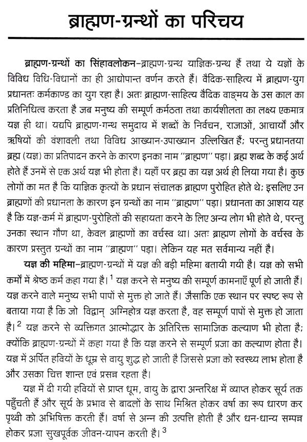पिछले दशकों में अनेक अध्येताओं ने ब्राह्मण ग्रन्थों के अप्रथित विषयों पर अपनी गवेषणामयी दृष्टि डाली है। उनकी मनीषा के प्रकाश में ही ब्राह्मण-ग्रन्थों के अनेक गूढ़-स्थल भी अब सम्मुख आना प्रारम्भ हो गये हैं। उनकी सारस्वत साधनाओं ने ही मुझ जैसे अकिञ्चन को भी उस दिशा में यत्-किञ्चित् यत्न करने को प्रेरित किया है। उस प्रेरणा का ही एक परिणाम यह पुस्तक है।