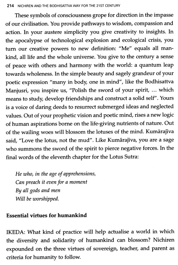 Daisaku Ikeda is a Buddhist philosopher, peace-builder, educator, author and poet. He is the third president of the Soka Gakkai lay Buddhist organisation and the founding president of the Soka Gakkai International (SG!). He has devoted himself to wide-ranging efforts for peace and has founded several cultural and educational institutions such as the Soka schools and universities, Institute of Oriental Philosophy, Min-On Concert Association, Tokyo Fuji Art Museum, Toda Institute for Global Peace and Policy Research and Boston Research Center for the 2Ist Century. Dr Ikeda is the recipient of numerous honorary doctorates and awards including the United Nations Peace Award. He has published more than 50 dialogues with leading world thinkers.