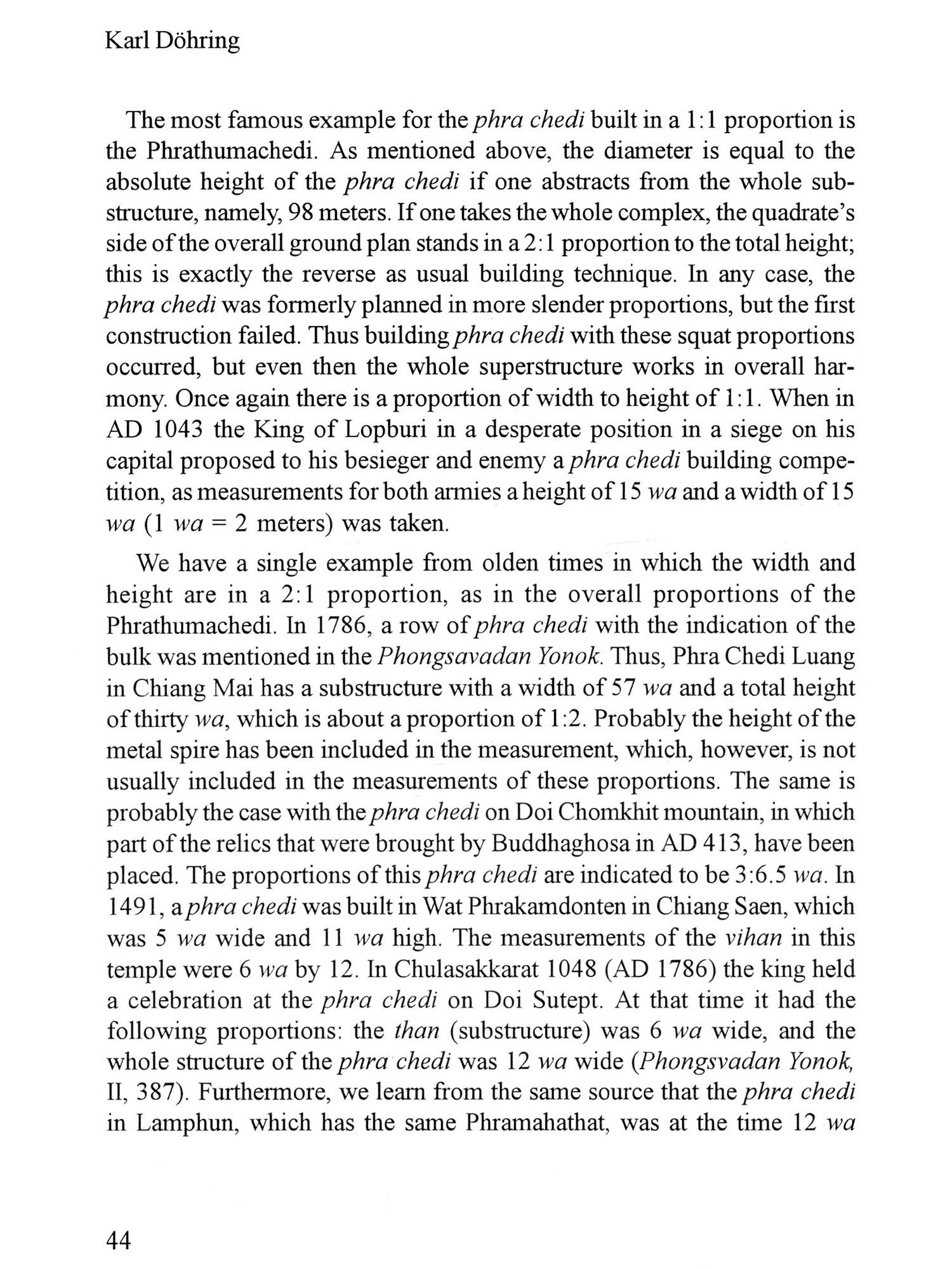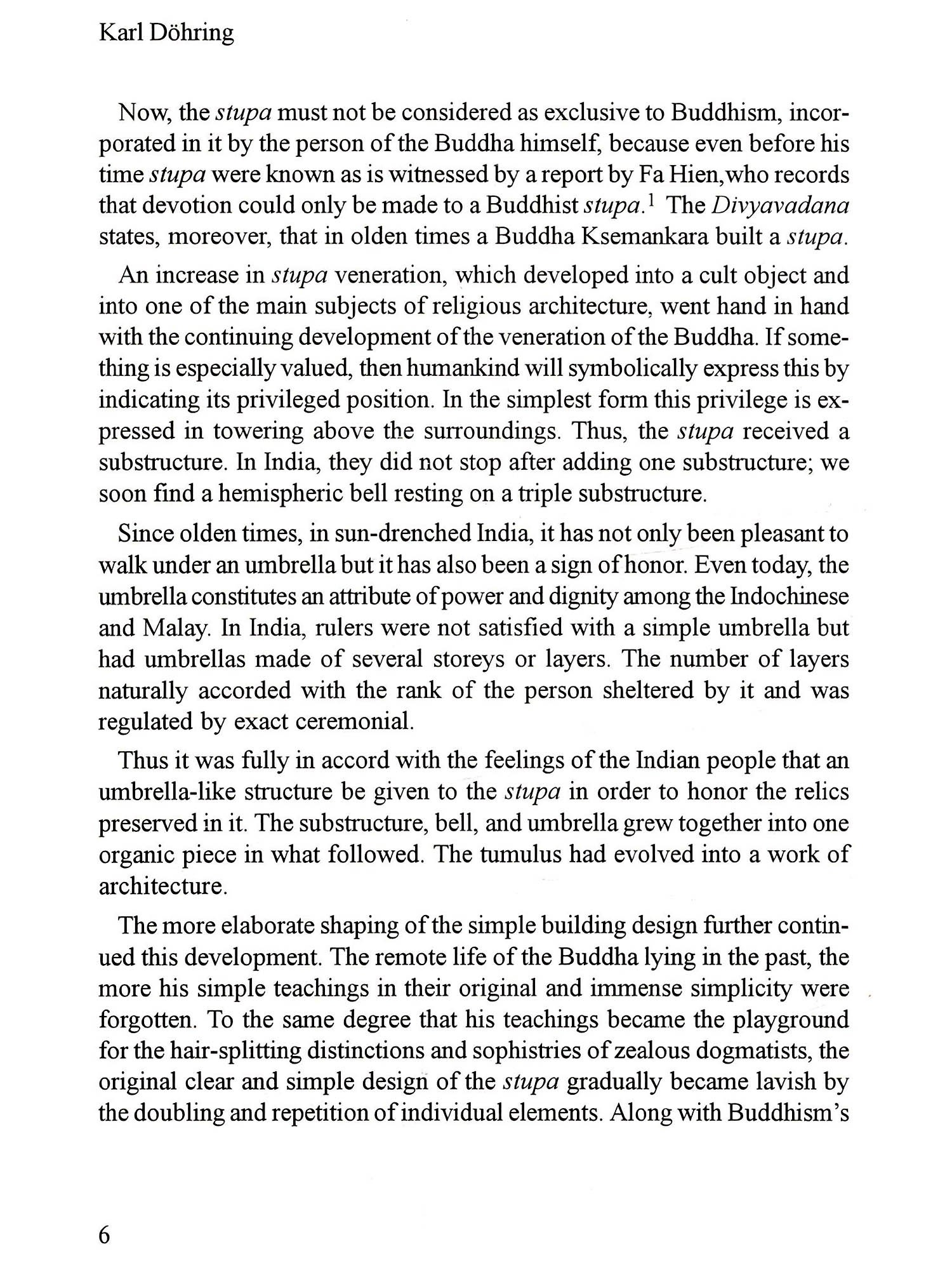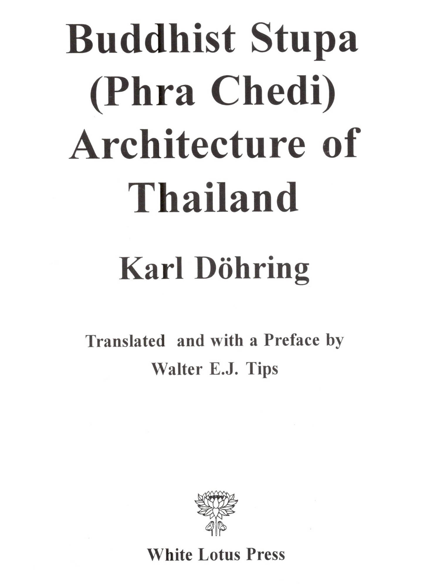 Buddhist Stupa (Phra Chedi) Architecture of Thailand is the most exhaustive study ever done by a Western researcher on the Buddhist edifices known in Thailand as phra chedi. Karl Döhring, who worked in Siam during the early decades of the twentieth century, personally visited phra chedi or stupa edifices in various Bangkok temples. He traces the origins of this peculiar building, dis-cusses its uses, and ex-amines its place in Thai Buddhist temple com-plexes. A complete classification of all the architectural forms these buildings take is presented, along with architectonic details, and the decorative ele-ments of the round and square stupa types are analyzed. This study is enhanced by a unique col-lection of photographs and the author's own sketches and drawings.