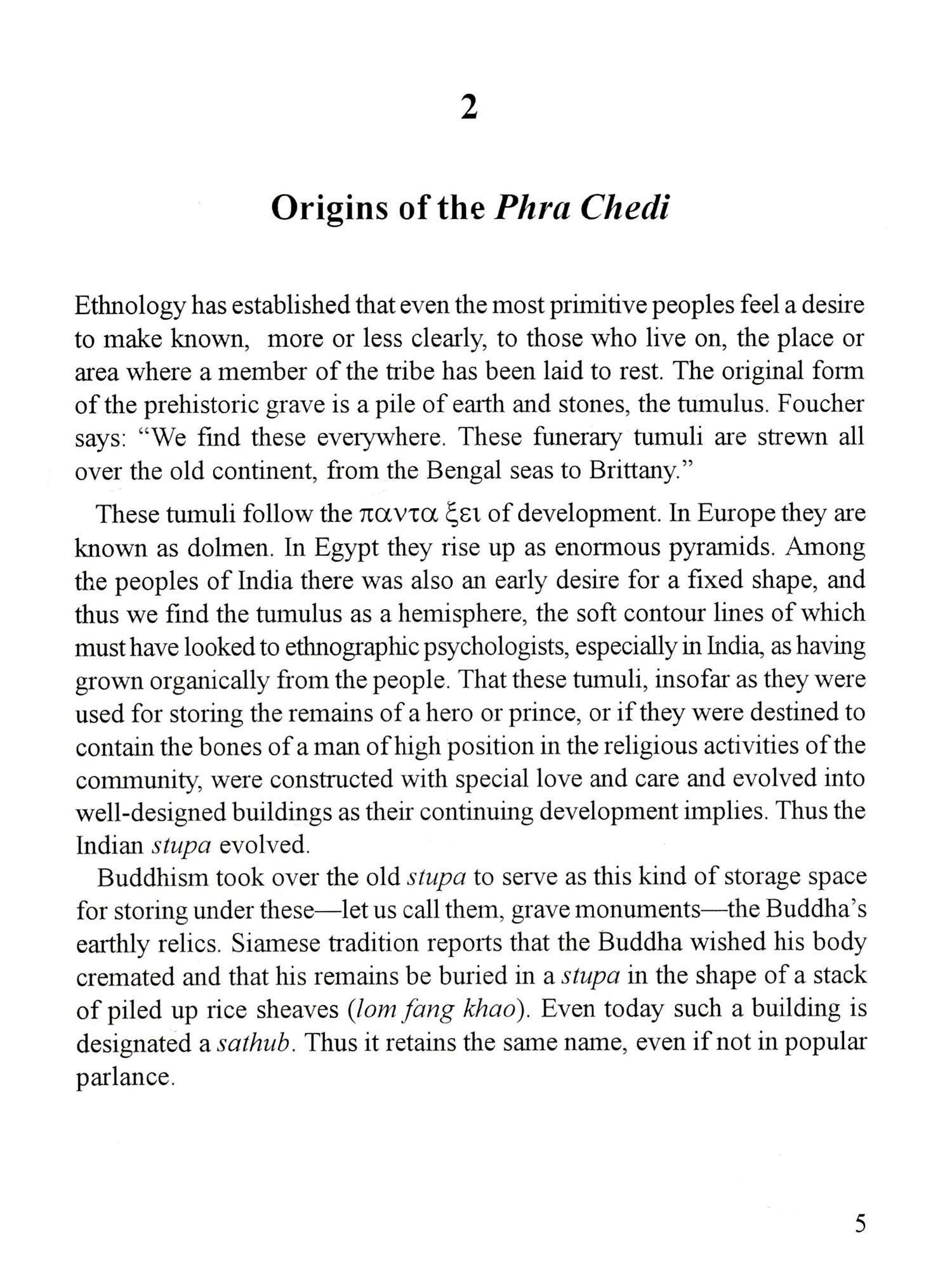 The present work deals with Siamese phra chedi (pronounced phratjedi), which, succinctly translated, are reliquaries or memorial buildings.¹ These religious structures are found in such great number and have such a peculiar shape that every visitor to the country immediately notices them. The discussion of these buildings here mainly depends on those in the modern-day capital of Bangkok, the largest city in Siam. The multiplicity of shapes there permits a good overview. The old capitals have been destroyed, and tropical vegetation grows over the rubble of their temples and phra chedi, hiding from sight every handsomely built monument with a cover of lush creeping plants. Shrubs and impenetrable brush prevent access to them. The development of building shapes in Siam progressed only slowly and, here, as elsewhere throughout the Orient, there is a tenacious attachment to old traditions. In Siam's building and art history we find periods of flow-ering and of decline that, in general, faithfully represent the nation's politi-cal history. We cannot deny, however, that in addition to these fluctua-tions-small in comparison to the development of European art-after the great period of blossoming more or less under King Phra Ruang around 1250, a regression occurred that nevertheless further developed the indi-vidual types of national style and gradually led to fixed schematic forms. In the course of the development of Bangkok and during the expansion of the street network in the layout of the new city, temple complexes have not been much taken into consideration. Many have thus been increasingly hidden by rows of houses. Only the spires of the large phra chedi emerge to reveal the presence of a temple. Already from afar the first sight of Bangkok is the many slender pointed towers that stand beside the smoking chimneys of rice and timber mills, the rather unattractive testaments to modernity. But, even if times have changed, the smoke from these chim-neys has not been able to completely darken the sparkling splendor of the phra chedi. The cityscape in the vicinity of the old Chakri Palace as seen from the River Menam is especially beautiful (Plate 1). The many splendid phra chedi of the ancient, now ruined, capital of Ayutthuya played an important role during all periods and figures in all travel reports about Siam. Mendez da Pinto in the mid-sixteenth century already remarked upon them, while later Dutch, English, and French visi-tors of the seventeenth century are filled with praise for the magnificence of these buildings. Unfortunately, during those times exact descriptions were not customary among Europeans. The word "pagoda" was used for all Buddhist edifices, for whole temple complexes as well as for their indi-vidual parts, for Buddha images, or for phra chedi. This fact makes most of these reports unclear. Such vague descriptions are in use even today, although more precise expressions are gradually gaining ground among Europeans. Today's phra chedi are a characteristic temple ornament, and a temple complex without a place for them is really unimaginable. Even in the coun-tryside outside the capital, already from afar the tall principal phra chedi of a temple complex greets the visitor when the actual temple building lies hidden from sight behind the sheltering green shade of trees. The phra chedi play a major role in religious customs. Their veneration is often not inferior to the veneration of Buddha images, and sometimes even more significant. Important celebrations are held to venerate them, and, indeed, the preponderant position given to the phra chedi, in architecture as well as in religion, accords with their significance in Buddhism as such. Every where in Siamese history books one reads descriptions of phra chedi and phra chedi construction, as well as about their veneration.