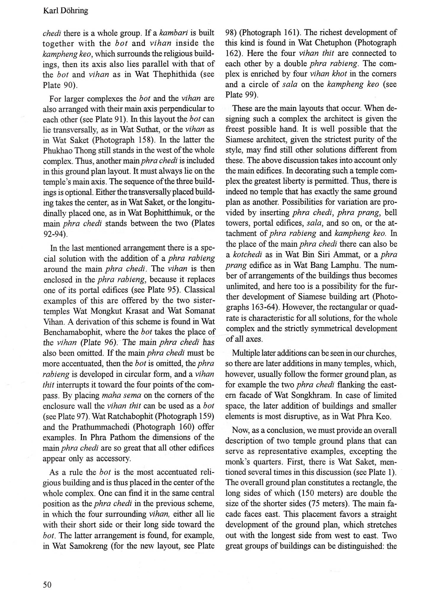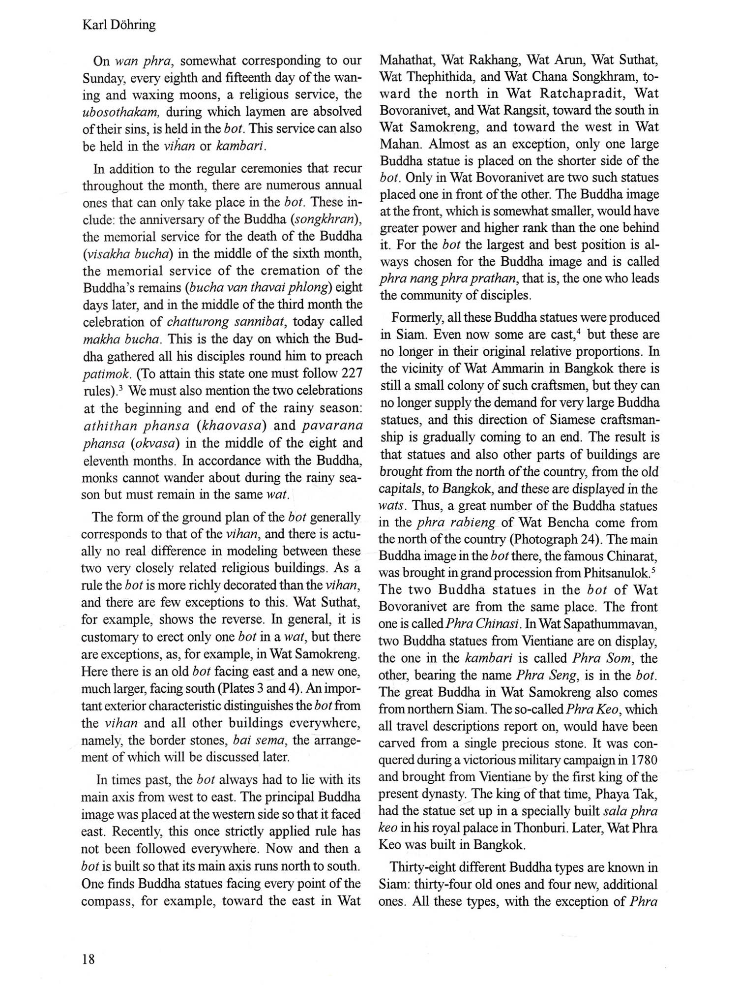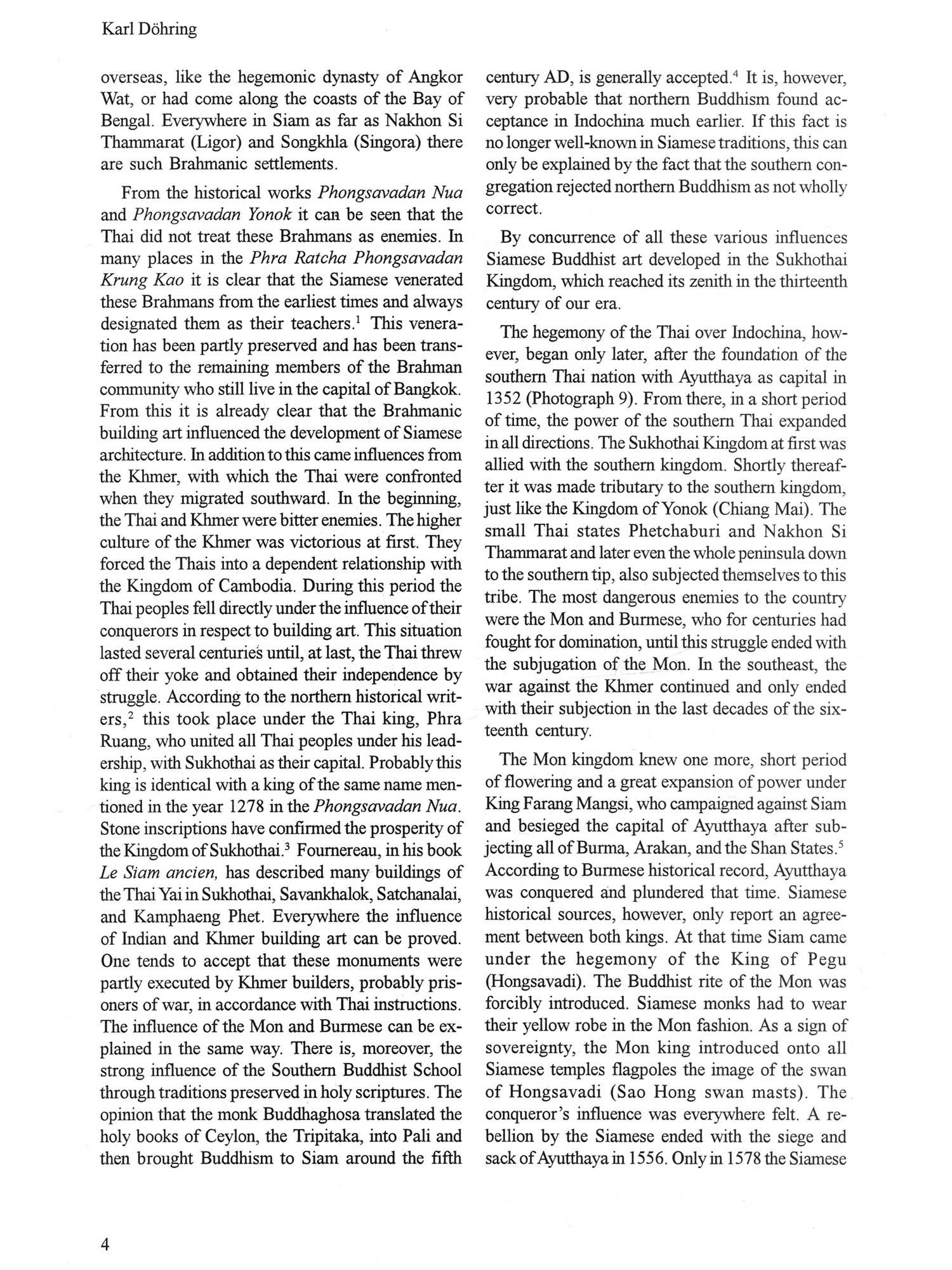 All travel descriptions of Siam praise its palaces and temples, the sparkle of gilt decorations on towers and pagodas that stand tall, the multiplicity of edifices resplendent in vivid colors, the giant stone door guards with their threatening faces as well as the splendor of the roofs covered with glazed multi-colored tiles, daring roof spires covered with gold mosaics, and the variety and boldness of roof shapes. When King Chulalongkorn visited Europe some years ago, fairy-tale descriptions of the inconceivable splendor of Siamese architecture filled the newspapers. However, a correct impression of the country's architecture was impossible because most writers had not even seen the country and drew on various sources or on their own fantasy. Recent travel descriptions about Siam are likewise superficial. Even now Bangkok is called the Venice of the East here, although this term is no longer appropriate today. Bastian's excellent work on Siam provides a host of useful data, but these are scattered throughout a thick volume and do not provide an integrated and panoramic view, while that volume also lacks illustrations. The information of the Prussian Expedition to Siam in 1862, despite some errors in detail, is mainly trustworthy and supported by illustrations, but it was not the special purpose of that publication to discuss Siamese architecture (Photographs 1-2). The singularity of the national Siamese style shows itself in the great temple complexes and palace con-structions of Bangkok, the characteristic shapes of which catch every visitor's eye. Domestic archi-tecture is much less developed in comparison and, as in all other countries and historical periods, as a rule serves to create a background for splendid public buildings. The construction of palaces, which in Siam always stood beside temple architecture, came, as the construction of living quarters, under the influence of European architecture first. Here, where utility and convenience were an issue, West-ern culture, which stood higher and had produced significant developments in this field, was victori-ous. The main building of the handsome Grand Pal-ace in Bangkok, executed in Italian Renaissance style, contains few Siamese details and clearly shows that the European architect who designed them did not understand them at all (Photograph 3). But in the end, local building arts gained expres-sion because, upon the king's order, a Siamese roof was placed on a wholly European-style building, very much to the advantage of the whole complex.2 By coincidence, a delightful construction has re-sulted, in which two wholly distinct stylistic direc-tions have been unified. Later, however, palaces were built in European style, for example, the sum-mer residence Bang Pa In, the great palace in Dusit Park, and the palace in Phetchaburi, currently be-ing built under my direction. The old palaces of Ayutthaya, Lopburi, Phitsanulok, Sukhothai, and so on have been destroyed. The old palace on Phetchaburi Mountain, built by King Mongkut, has a Siamese section but is otherwise constructed in European style (Photograph 4). The Siamese parts of the Grand Palace in Bangkok have interesting elements to see but are inaccessible to every male European and heavily guarded.