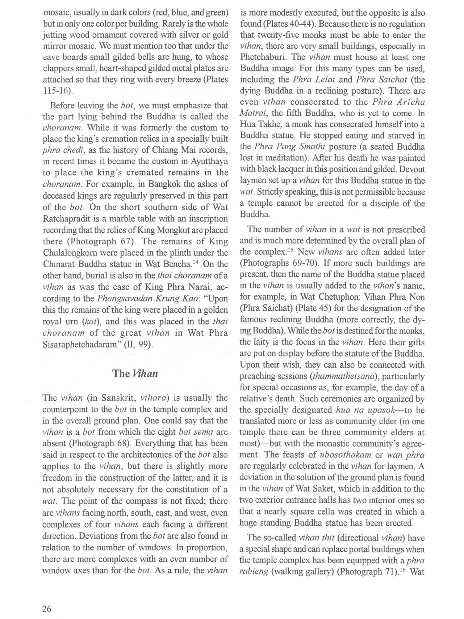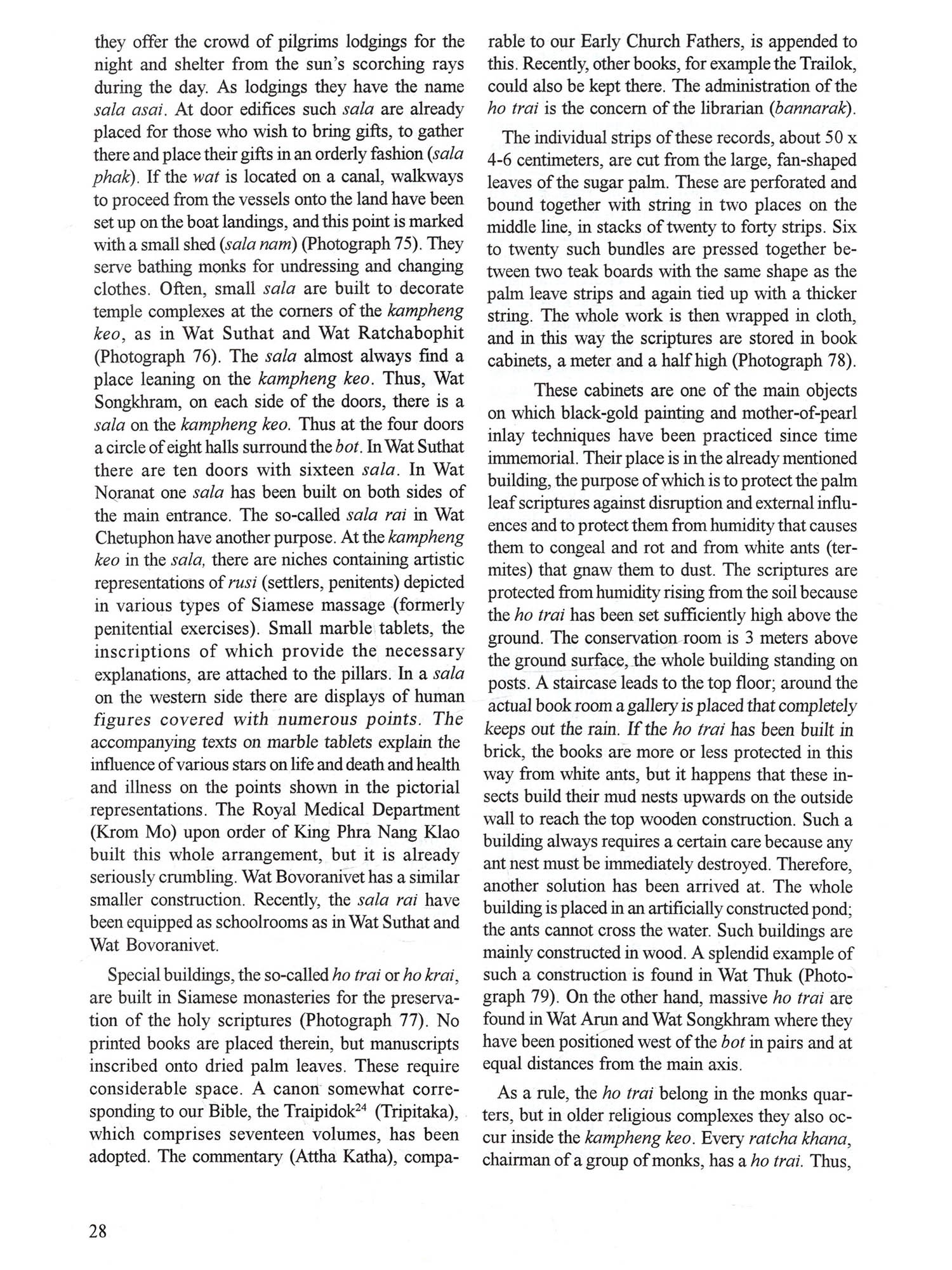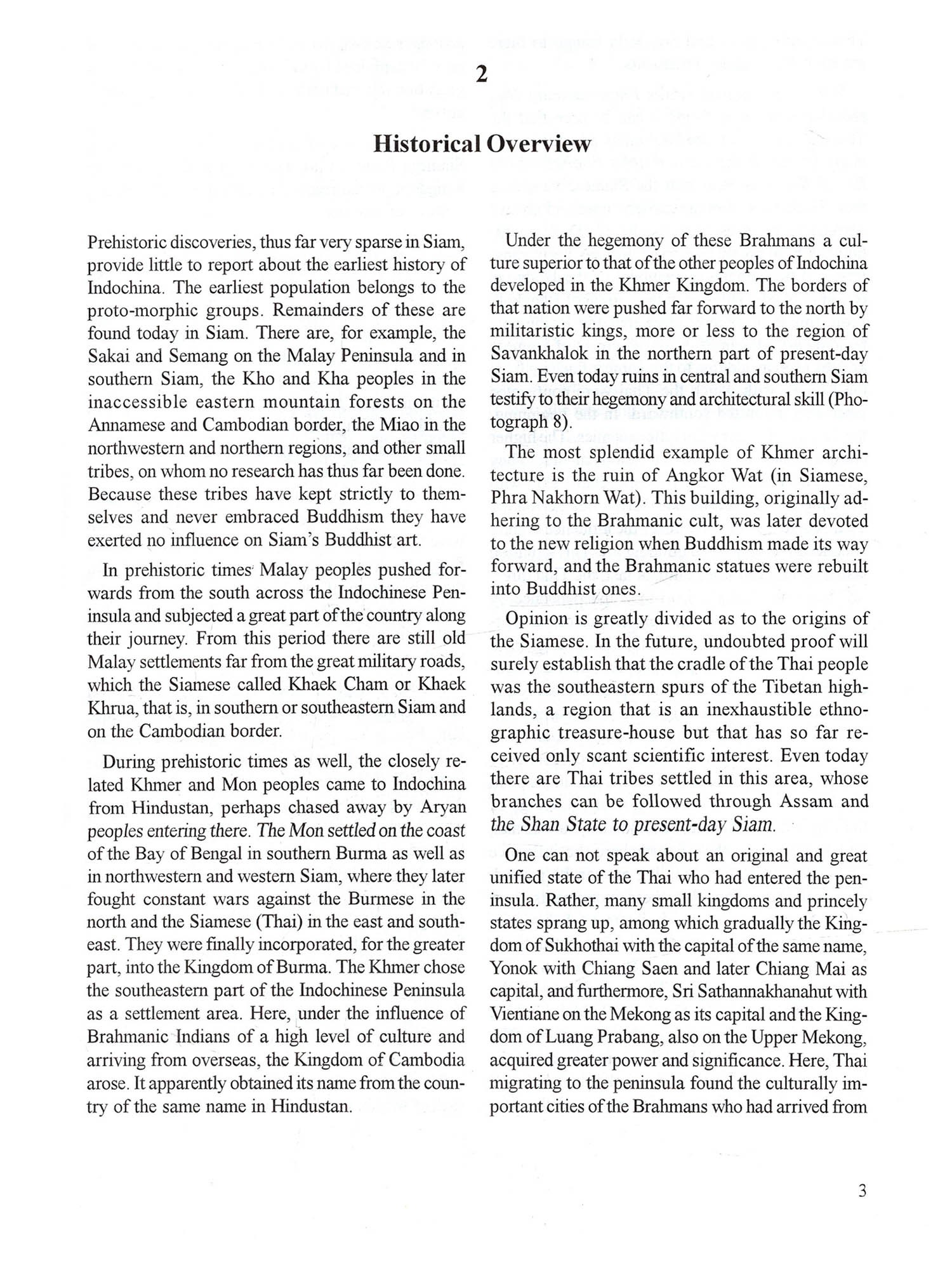 All travel descriptions of Siam praise its palaces and temples, the sparkle of gilt decorations on towers and pagodas that stand tall, the multiplicity of edifices resplendent in vivid colors, the giant stone door guards with their threatening faces as well as the splendor of the roofs covered with glazed multi-colored tiles, daring roof spires covered with gold mosaics, and the variety and boldness of roof shapes. When King Chulalongkorn visited Europe some years ago, fairy-tale descriptions of the inconceivable splendor of Siamese architecture filled the newspapers. However, a correct impression of the country's architecture was impossible because most writers had not even seen the country and drew on various sources or on their own fantasy. Recent travel descriptions about Siam are likewise superficial. Even now Bangkok is called the Venice of the East here, although this term is no longer appropriate today. Bastian's excellent work on Siam provides a host of useful data, but these are scattered throughout a thick volume and do not provide an integrated and panoramic view, while that volume also lacks illustrations. The information of the Prussian Expedition to Siam in 1862, despite some errors in detail, is mainly trustworthy and supported by illustrations, but it was not the special purpose of that publication to discuss Siamese architecture (Photographs 1-2). The singularity of the national Siamese style shows itself in the great temple complexes and palace con-structions of Bangkok, the characteristic shapes of which catch every visitor's eye. Domestic archi-tecture is much less developed in comparison and, as in all other countries and historical periods, as a rule serves to create a background for splendid public buildings. The construction of palaces, which in Siam always stood beside temple architecture, came, as the construction of living quarters, under the influence of European architecture first. Here, where utility and convenience were an issue, West-ern culture, which stood higher and had produced significant developments in this field, was victori-ous. The main building of the handsome Grand Pal-ace in Bangkok, executed in Italian Renaissance style, contains few Siamese details and clearly shows that the European architect who designed them did not understand them at all (Photograph 3). But in the end, local building arts gained expres-sion because, upon the king's order, a Siamese roof was placed on a wholly European-style building, very much to the advantage of the whole complex.2 By coincidence, a delightful construction has re-sulted, in which two wholly distinct stylistic direc-tions have been unified. Later, however, palaces were built in European style, for example, the sum-mer residence Bang Pa In, the great palace in Dusit Park, and the palace in Phetchaburi, currently be-ing built under my direction. The old palaces of Ayutthaya, Lopburi, Phitsanulok, Sukhothai, and so on have been destroyed. The old palace on Phetchaburi Mountain, built by King Mongkut, has a Siamese section but is otherwise constructed in European style (Photograph 4). The Siamese parts of the Grand Palace in Bangkok have interesting elements to see but are inaccessible to every male European and heavily guarded.