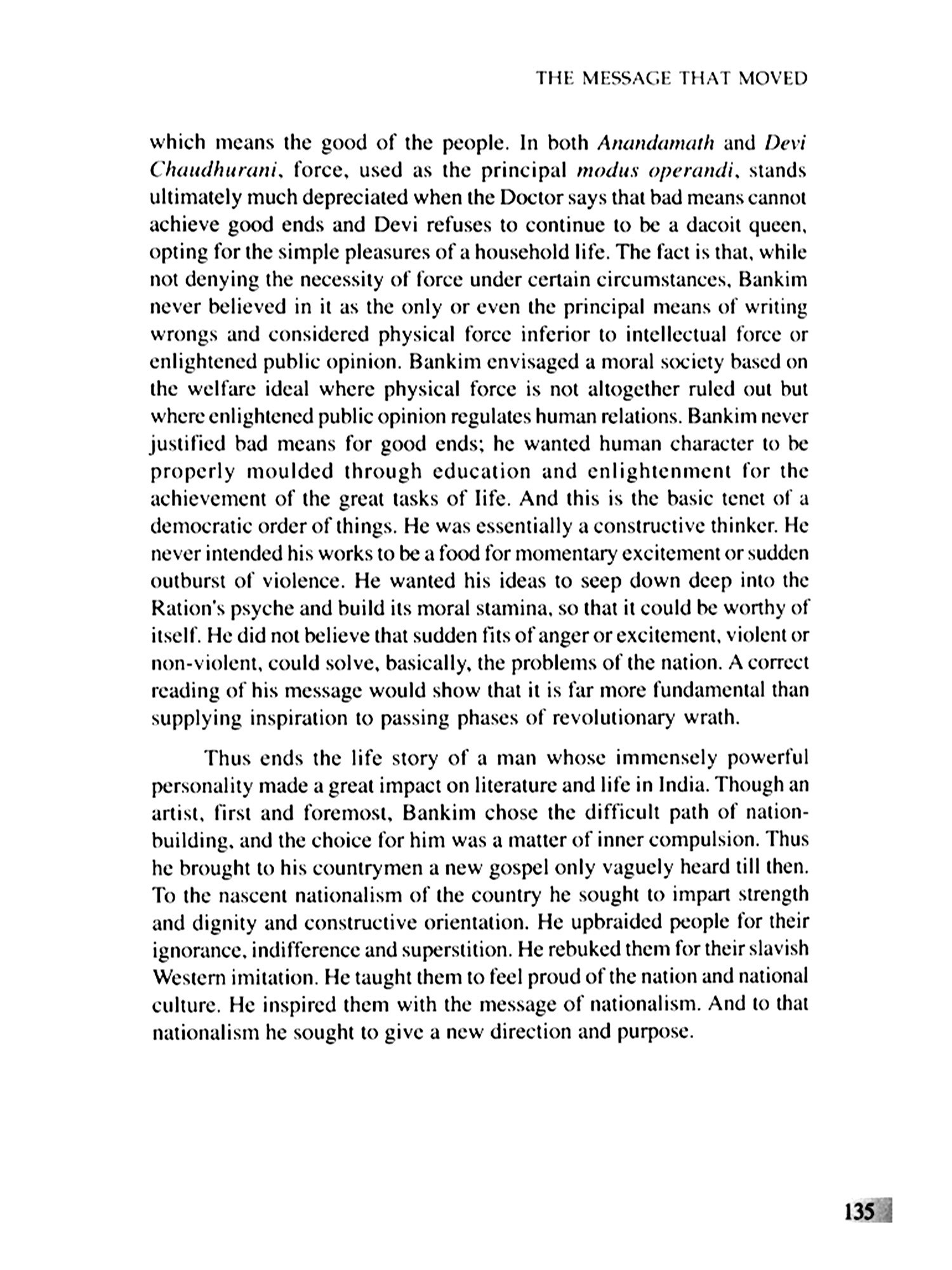 Bankim made a significant contribution to the revival of the country’s ancient past which constituted the bed-rock of the new nationalism. To the nascent nationalism of the country, he sought to impact strength and dignity and constructive orientation. Bankim envisaged a moral society based on the welfare ideal where physical force is not altogether ruled out but where enlightened public opinion regulates human relations.