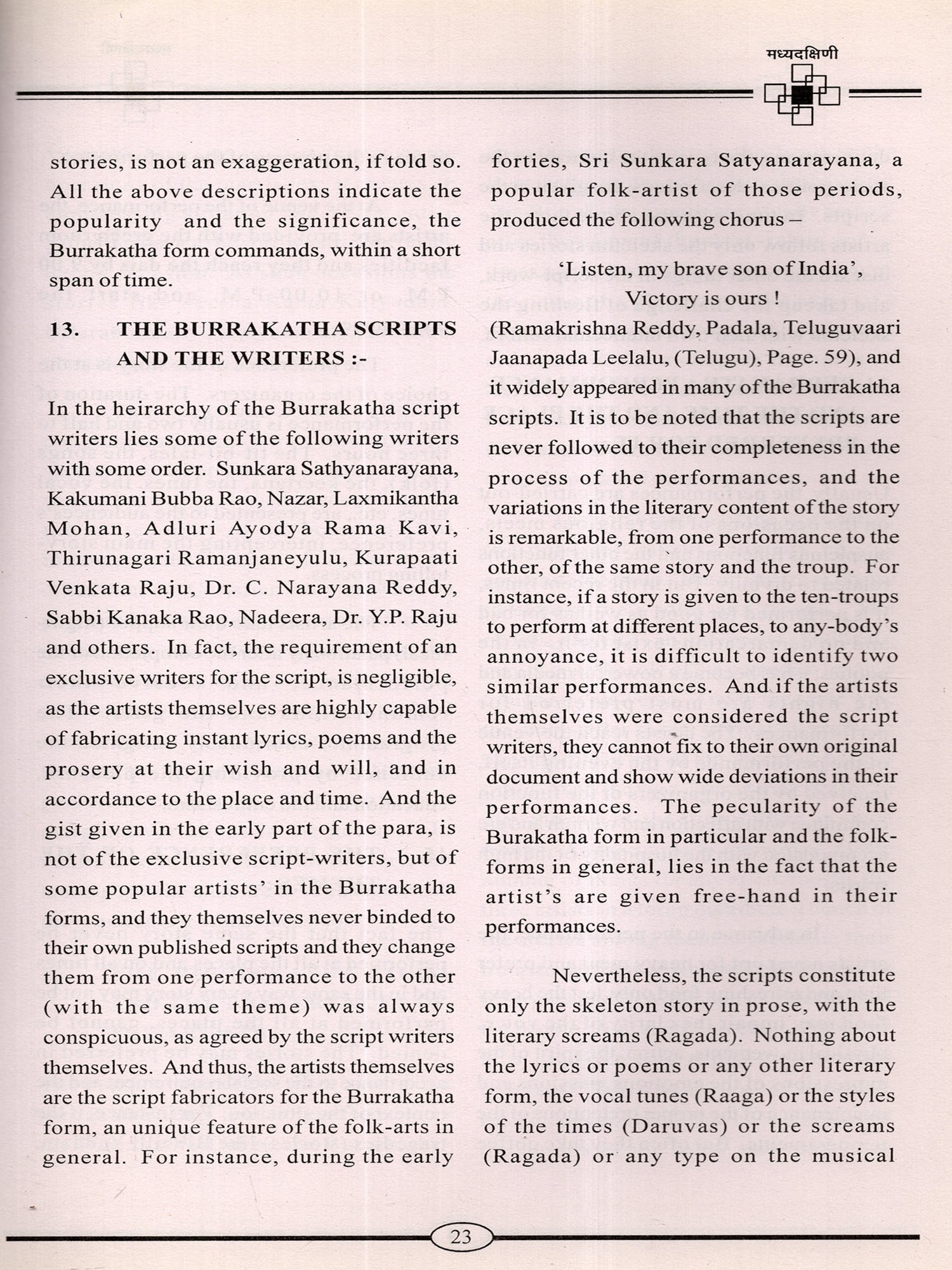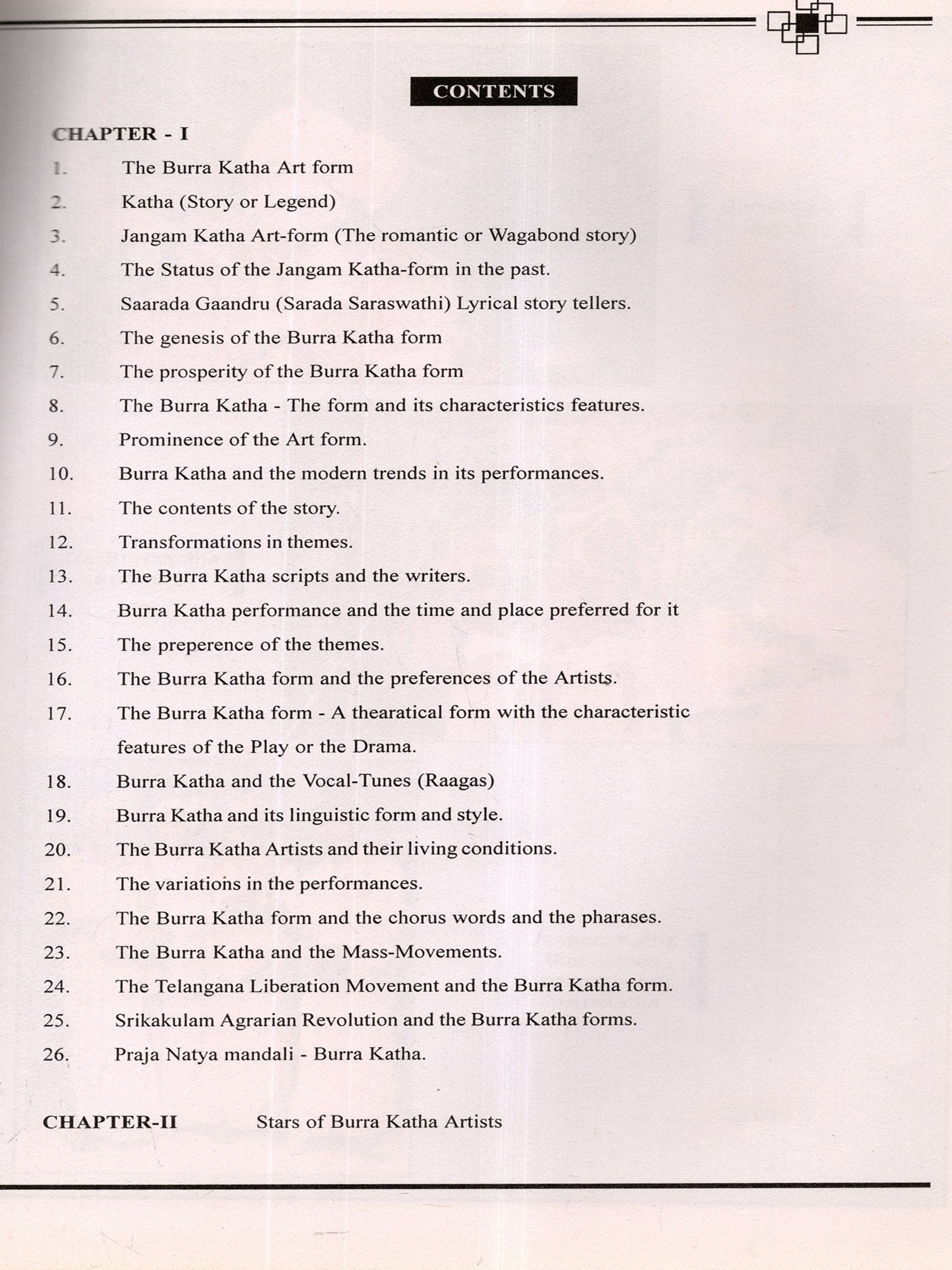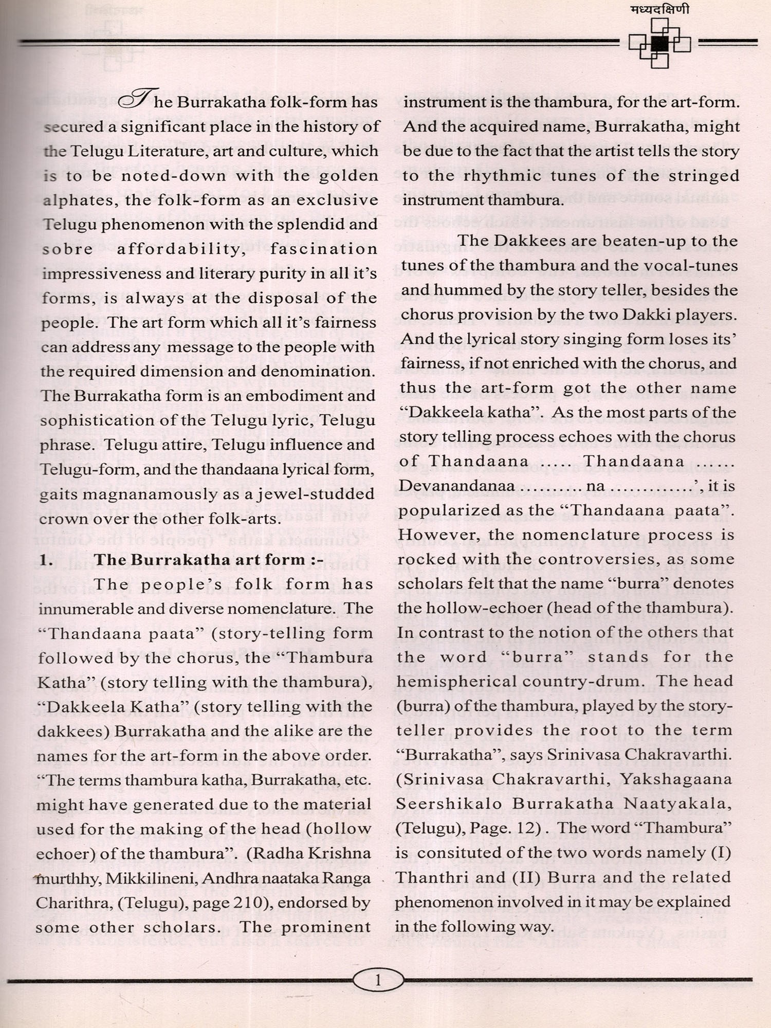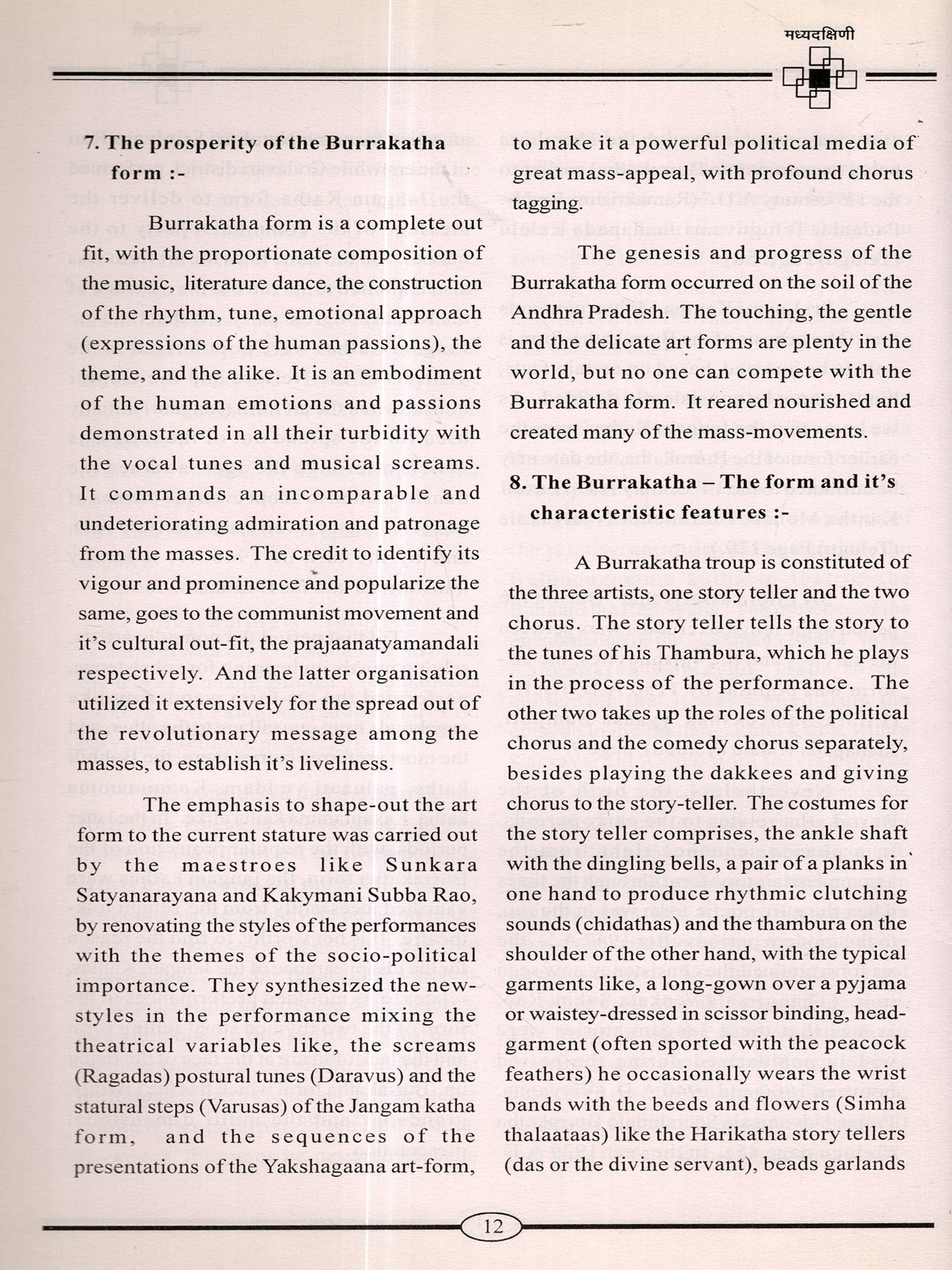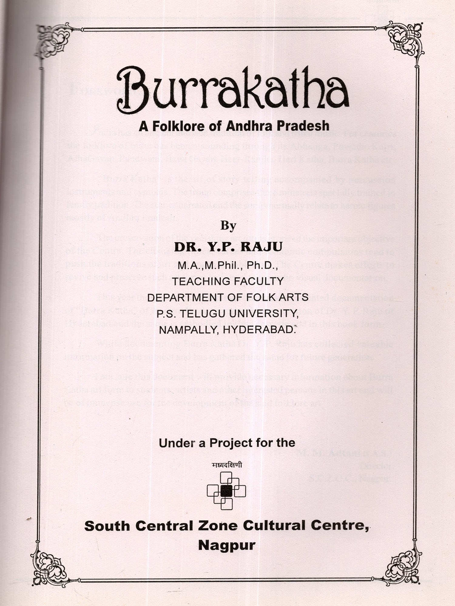 I am sure this document will provide necessary information about Burra Katha art form to students, artists and other interested persons in this art and will be of immense use for the development of the said folklore art.