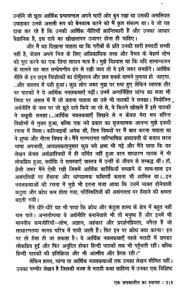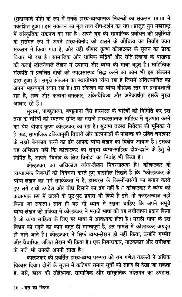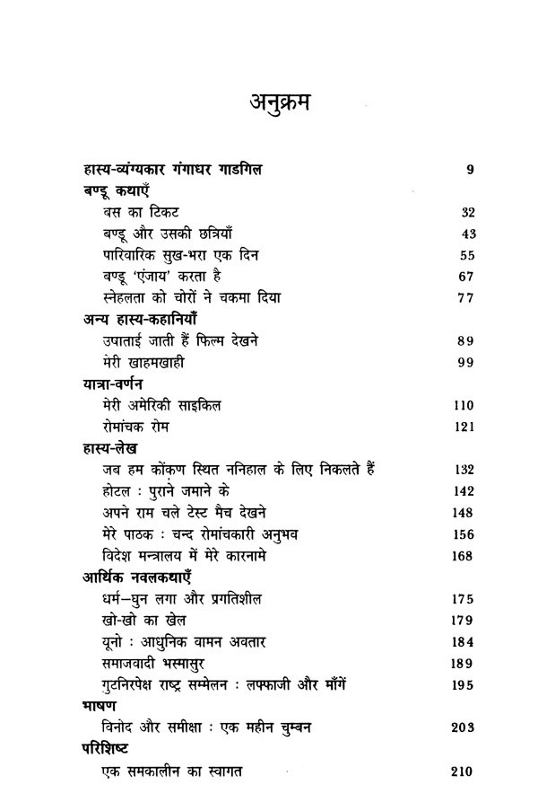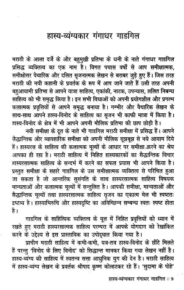 मराठी हास्य-साहित्य के प्रवर्तक कोल्हटकर के साहित्यिक कर्म और मर्म को ग्रहण करते हुए गंगाधर गाडगिल ने उस परम्परा का अनुकरण मात्र नहीं किया है। गाडगिल जी की पसन्दगी, अभिरुचि और मूल्य-प्रवृत्तियों के अवलोकन के बाद स्वीकार किया गया है कि उनकी निर्मिति मात्र व्यंग्यात्मक उक्ति-वैचित्र्य के सहारे नहीं हुई है। गंगाधर गाडगिल की रचनाएँ एक साथ कई बातों का अहसास दिलाती हैं। उनकी रचनाएँ जीवन के विविध पहलुओं से सम्बद्ध होने का अनुभव भी कराती हैं। दरअसल विशिष्ट सामाजिक जीवन की सम्बद्धता और बौद्धिक विशिष्टता की सीमाओं को न माननेवाली गाडगिल जी की हास्य-प्रवृत्तियों ने घेरों को कभी नहीं माना। किर्लोस्कर-देवल की अभिजात हास्य-साहित्य की परम्परा के कायल गाडगिल ने हमेशा अभिजात, मूल्यपरक और स्वाभाविक हास्य को तरजीह दी और लक्ष्मीबाई तिलक के हास्य को अपना आदर्श माना है। इसका अभिप्राय यह नहीं है कि गाडगिल अभिजात हास्य-परम्परा की लकीर का अनुसरण करते हुए उसकी अगली कड़ी-भर रह गये। परम्परा की कतिपय प्रवृत्तियों और समानताओं के बावजूद गाडगिल जी के हास्य-व्यंग्य की अपनी अलग अस्मिता रही है। परम्परा को नये आयाम दिलाने के साथ गाडगिल उन नवीन प्रवृत्तियों को भी गढ़ते हैं जिनका संकेत तक परम्परा में नहीं है। प्रस्तुत है एक समर्थ हास्य-व्यंग्यकार की महत्त्वपूर्ण कृति का नया संस्करण ।