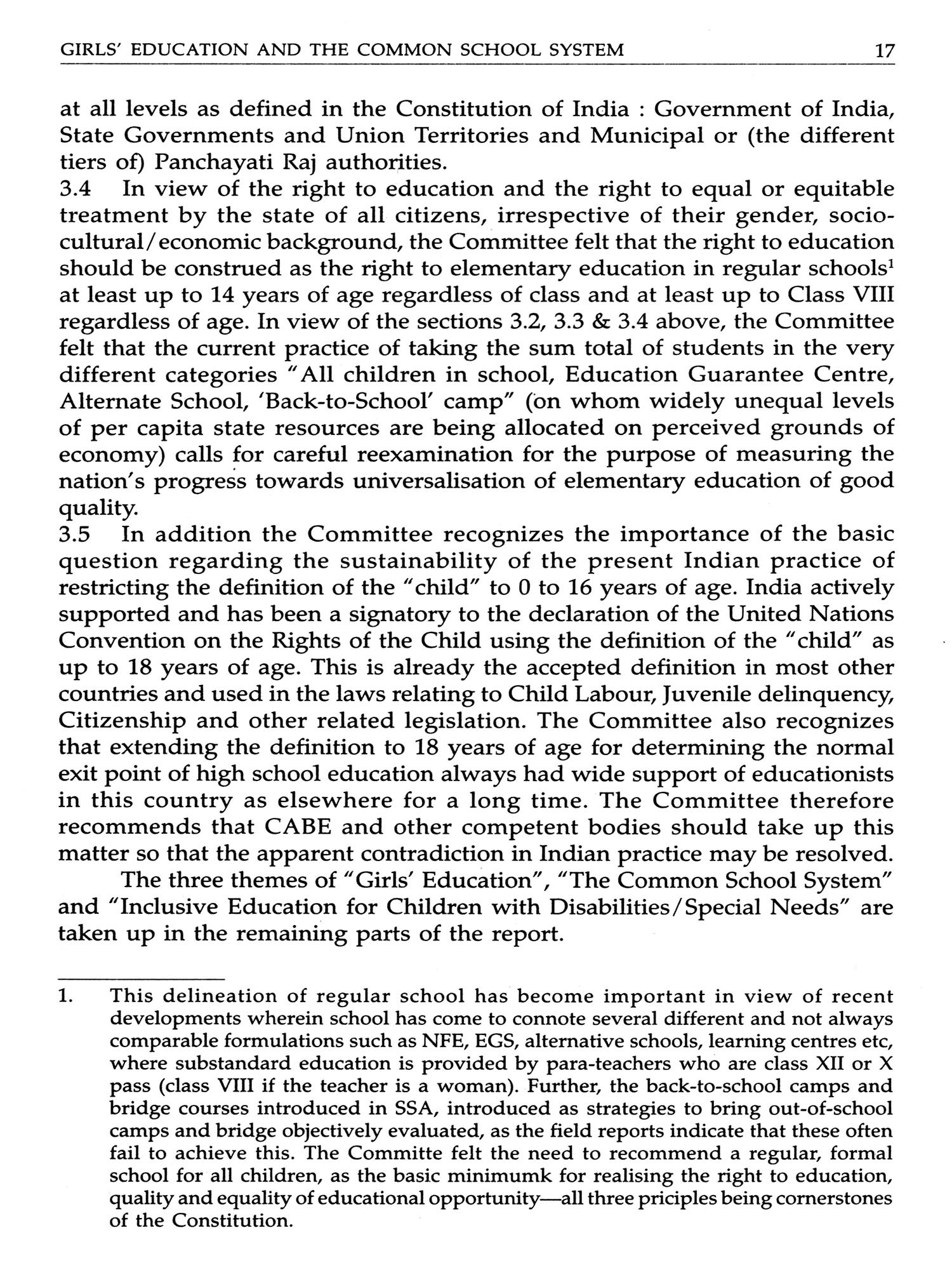 2.5 The 86th Amendment has made education from 6-14 years of age a Fundamental Right of the children of India. However, in the view of this Committee, while the span of 6 to 14 years of age serves to define broadly the parameters of regular schooling at the elementary stage of education, the 1993 Supreme Court judgement stands on its own. This Judgement had defined the operational parameters of the right to education flowing from the right to life as "up to 14 years of age" and not "6-14 years of age". The decision to make education a Fundamental Right for 6-14 years has only partially fulfilled the requirement of the Constitution as interpreted by the Supreme Court of India.
