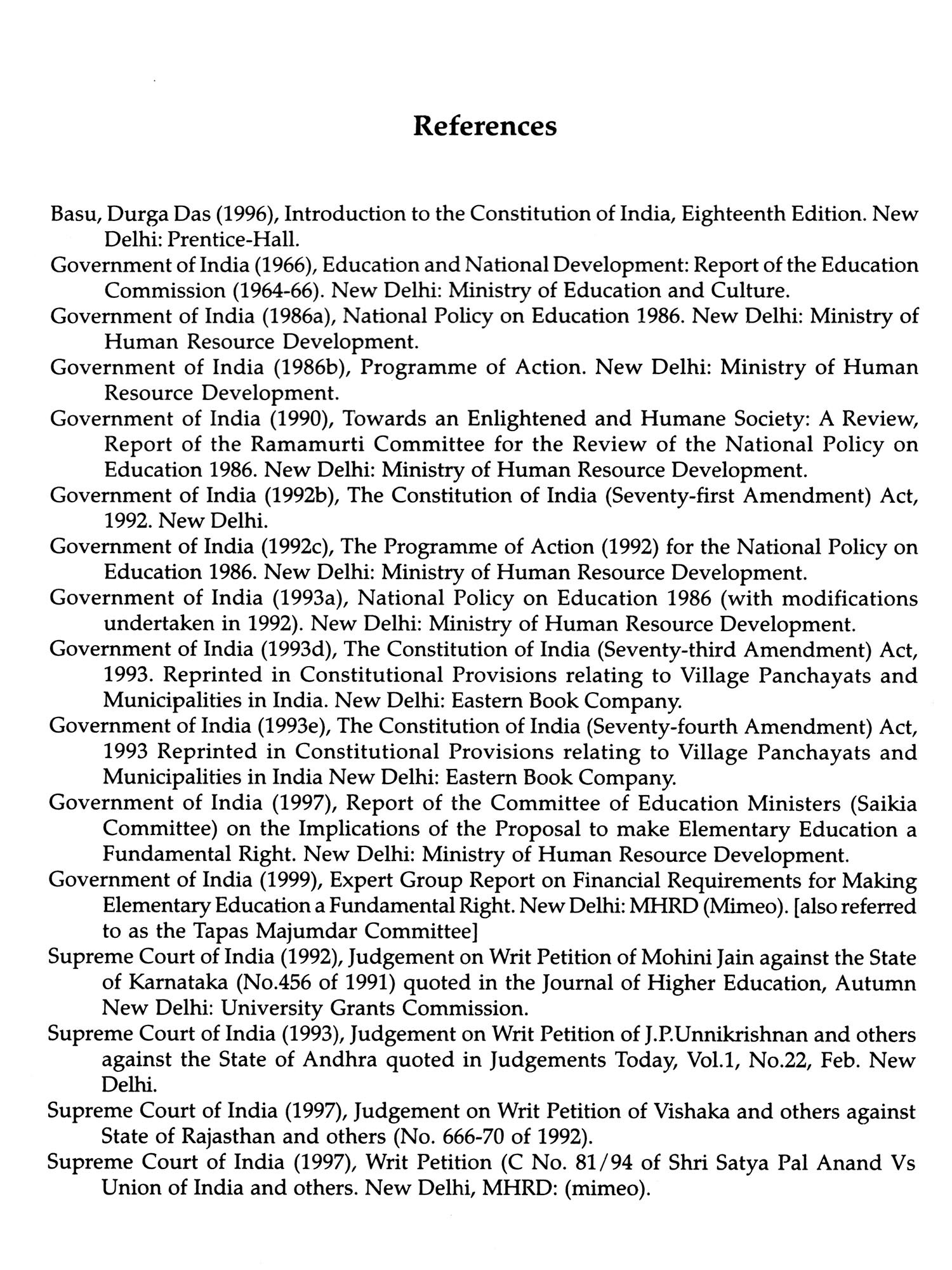 2.4 The GOI, in response to this as well as several other Supreme Court decisions, had constituted the Committee of State Education Ministers under the chairpersonship of the Union Minister of State for HRD (Education) Shri Muhi Ram Saikia in 1996. Following the unanimous recommendation of 1997 of the Saikia Committee the GOI began to take the necessary steps towards an Amendment of the Constitution that eventually led to the passage of the Constitution of India (86th Amendment) Act 2002.