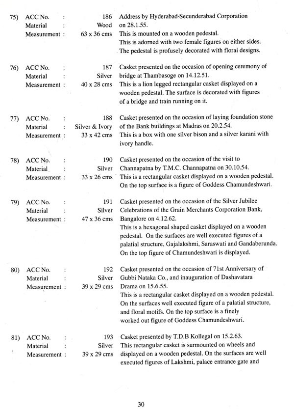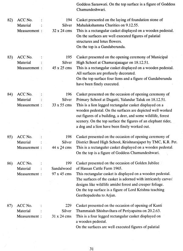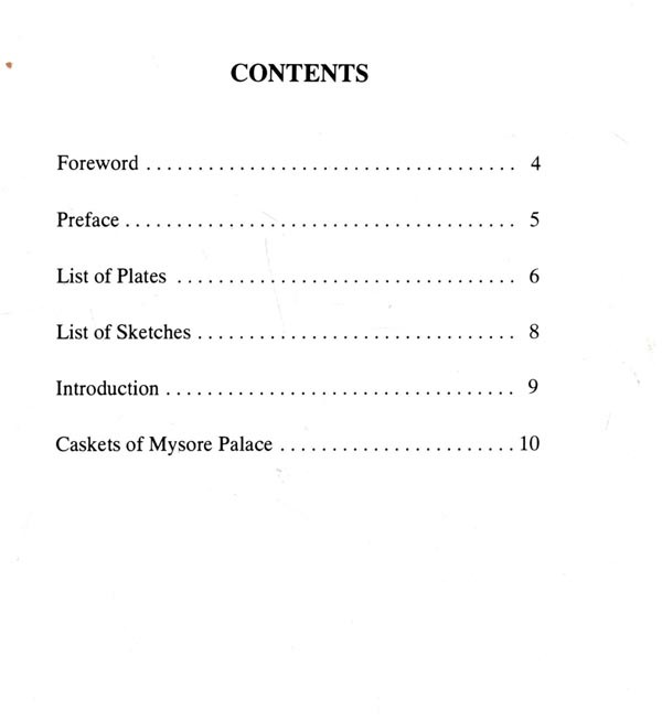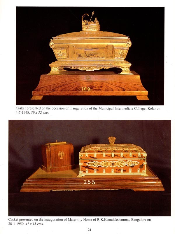 Rural life in India is full of rich traditions in culture which are both latent and also open. The traditional gudigaras of the erstwhile Mysore State have in them the talent to give definite shape to wood viz.. Teak, Sandal and Rose. Though of immense value there is apprehension that these traditions may slowly disappear a heritage which has enriched the cultural horizons of our country. In the earliest days man's very existence depended upon these. The succeeding ages produced many skilled craftsmen. But with the advent of the machine age this craftsmanship is slowly receeding The present work on the Caskets in the collection of the Mysore Palace is confined to the silver and sandalwood categories. Mysore Palace houses a huge collection of caskets. They are of the 19th century, and were presented to the last Maharaja of Mysore H. H. Jayachamarajendra Wodeyar by the people of the erstwhile Mysore State as mementos.
