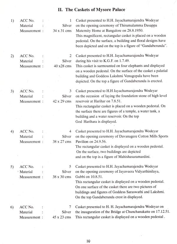 The Mysore Palace houses huge collection of silver and sandalwood carvings. No attempt has been made to project the caskets of the Palace to the public. This work gives comprehensive information on the caskets to scholars and researchers.