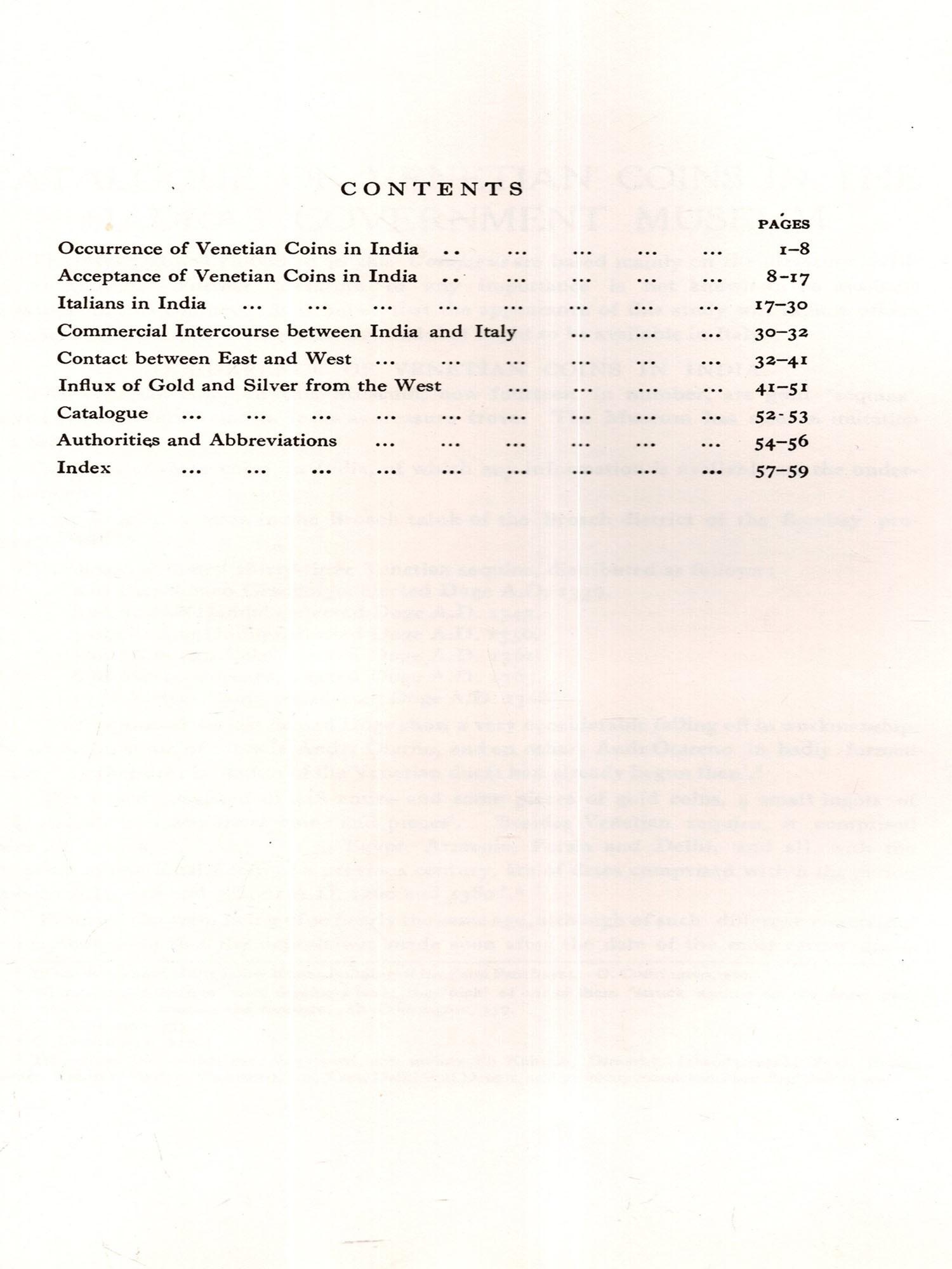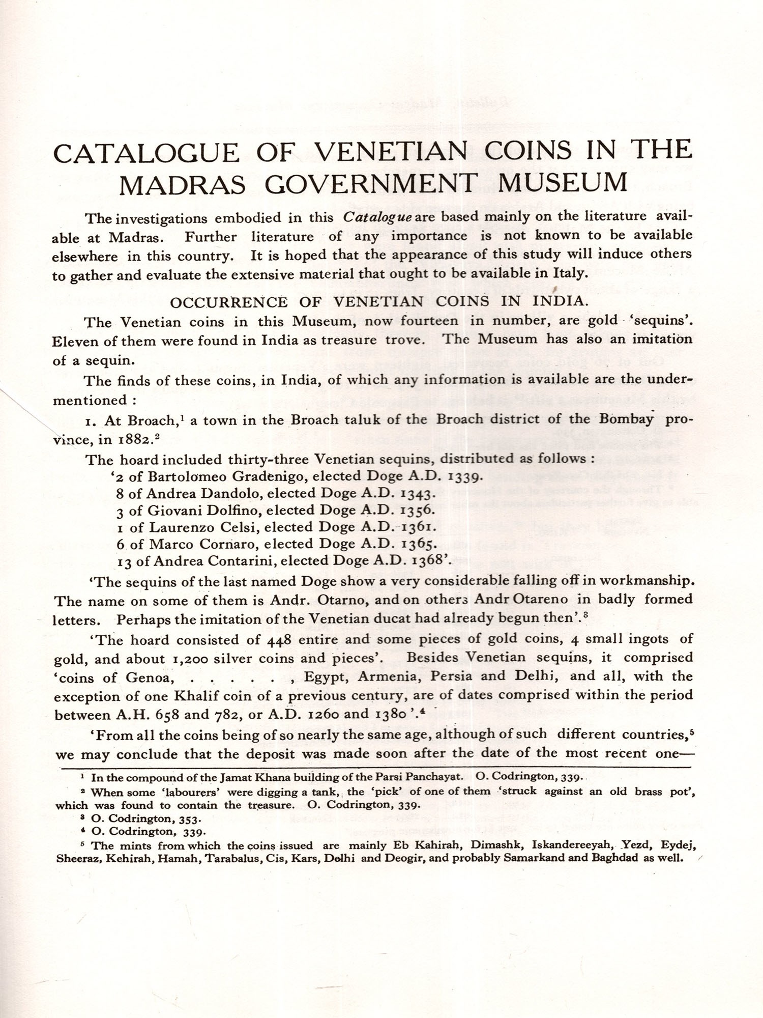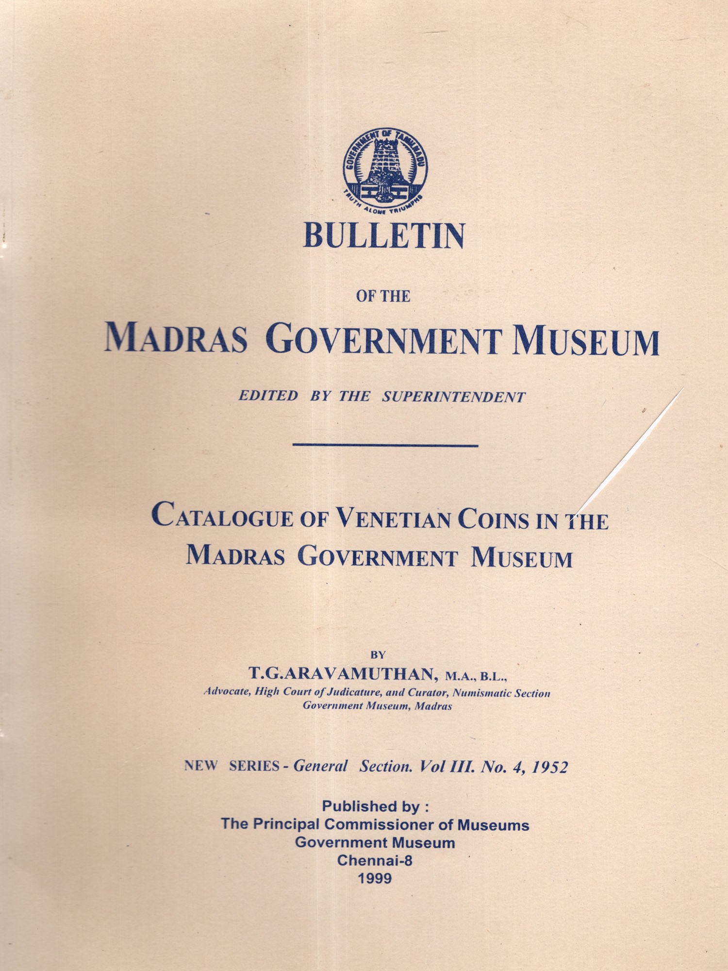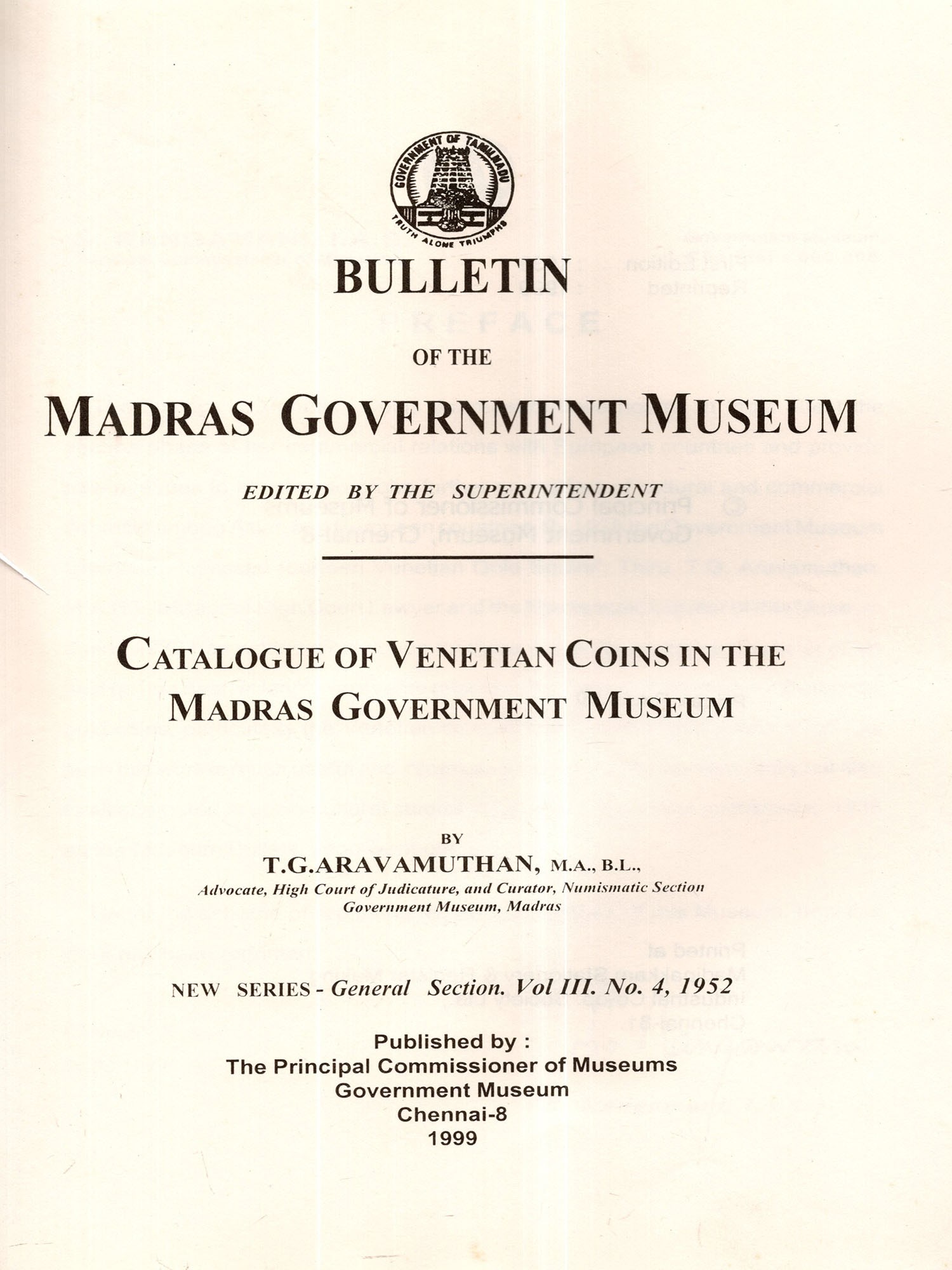 The findings of Venetian Coins as treasure-trove hoards in India attest the second phase of her commercial relations with European countries and provide new avenues to scholars to probe further on matters of cultural and commercial contacts among Asian and European countries. By 1938 the Government Museum Chennai possessed fourteen Venetian Gold Squirs". Thiru. T.G. Aravamuthan, M.A.B.L. a Madras High Court Lawyer and the Numismatic Curator of this Museum during 1930 had written a catalogue for these coins. As an eminent scholar of his field he had dealt at length on events related to the revival of the inflow of European gold coins, particularly the Venetian coins in India in 14-15th Centuries A.D. As such this work is much useful and informative not only to the Numismatists but also to all interested in socio-cultural studies. This work, which was published in 1938 as the Museum Bulletin soon went out of print.