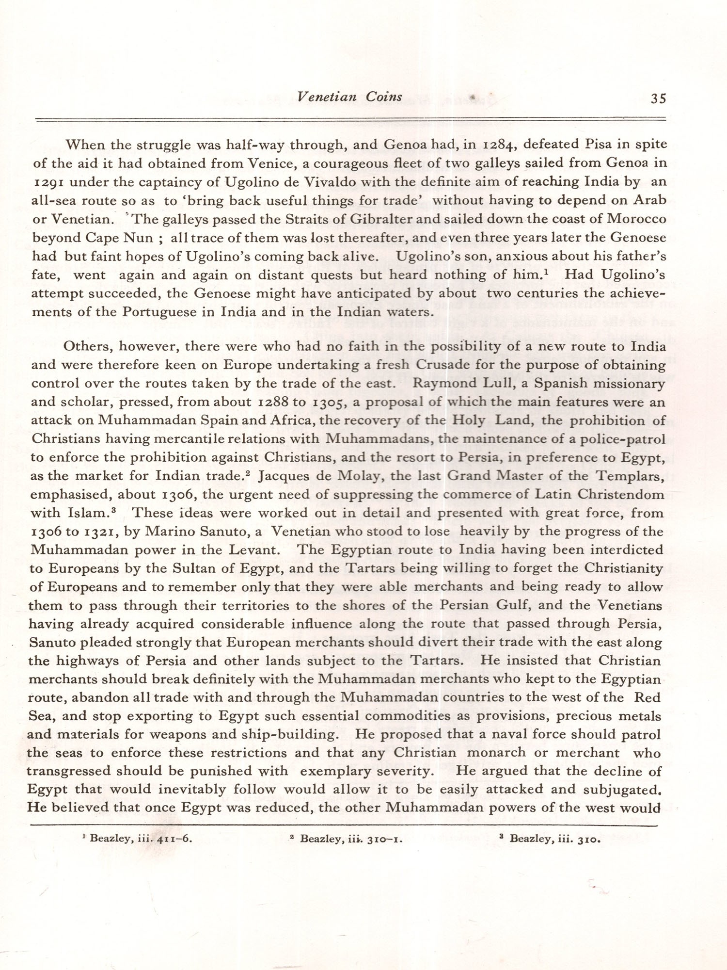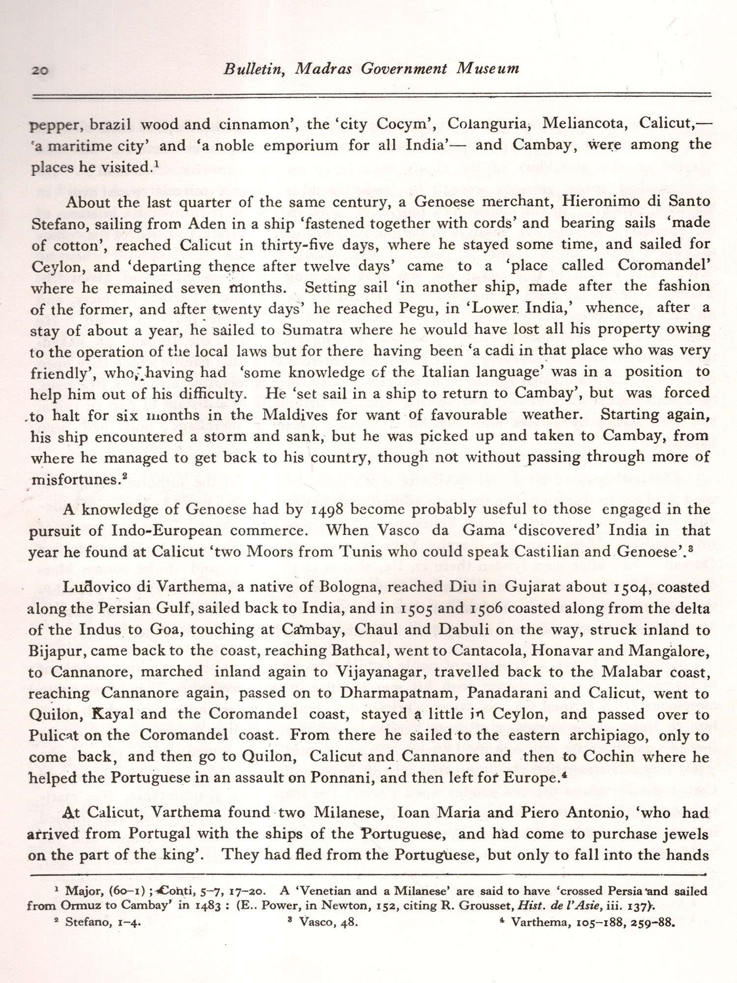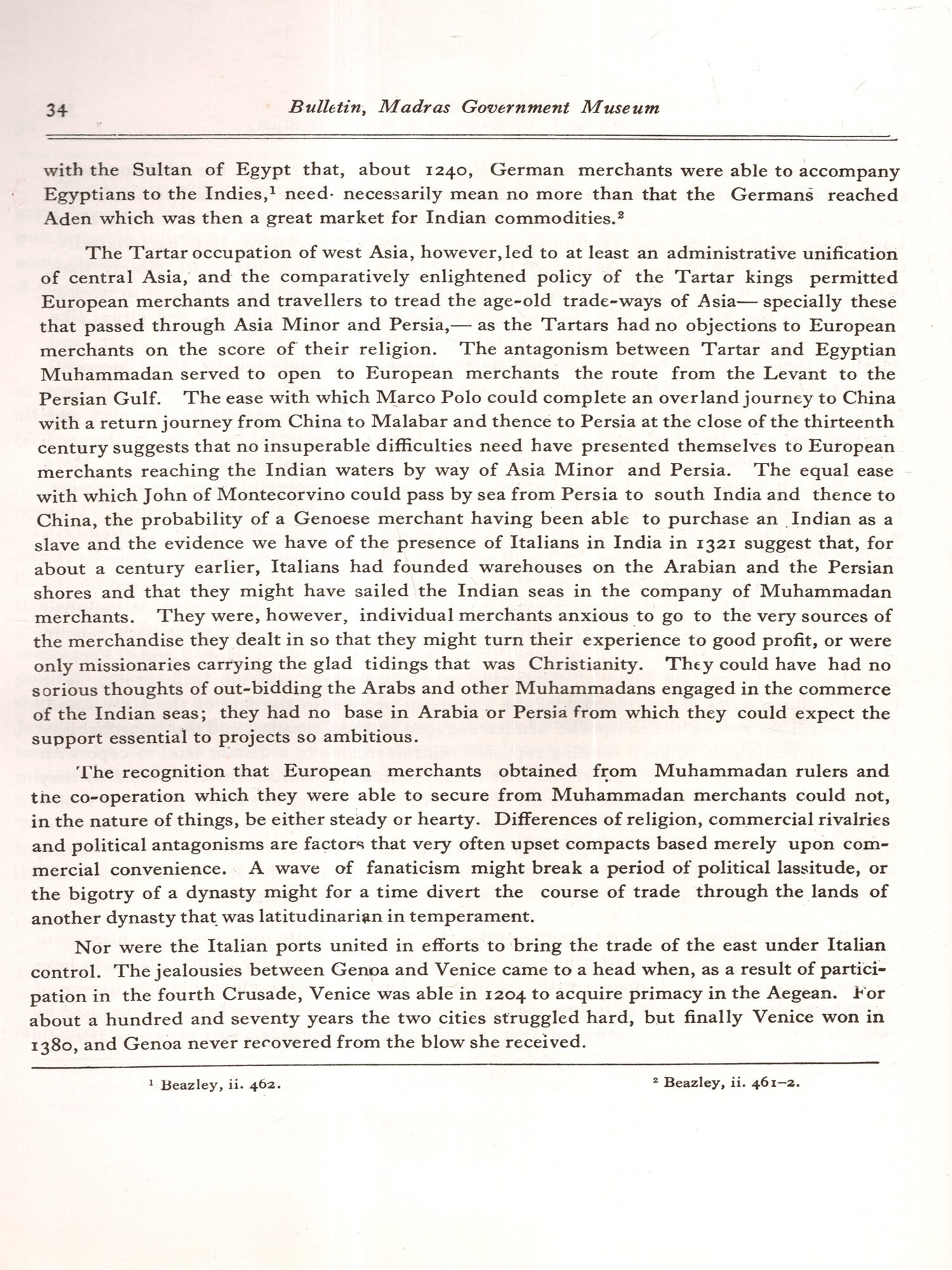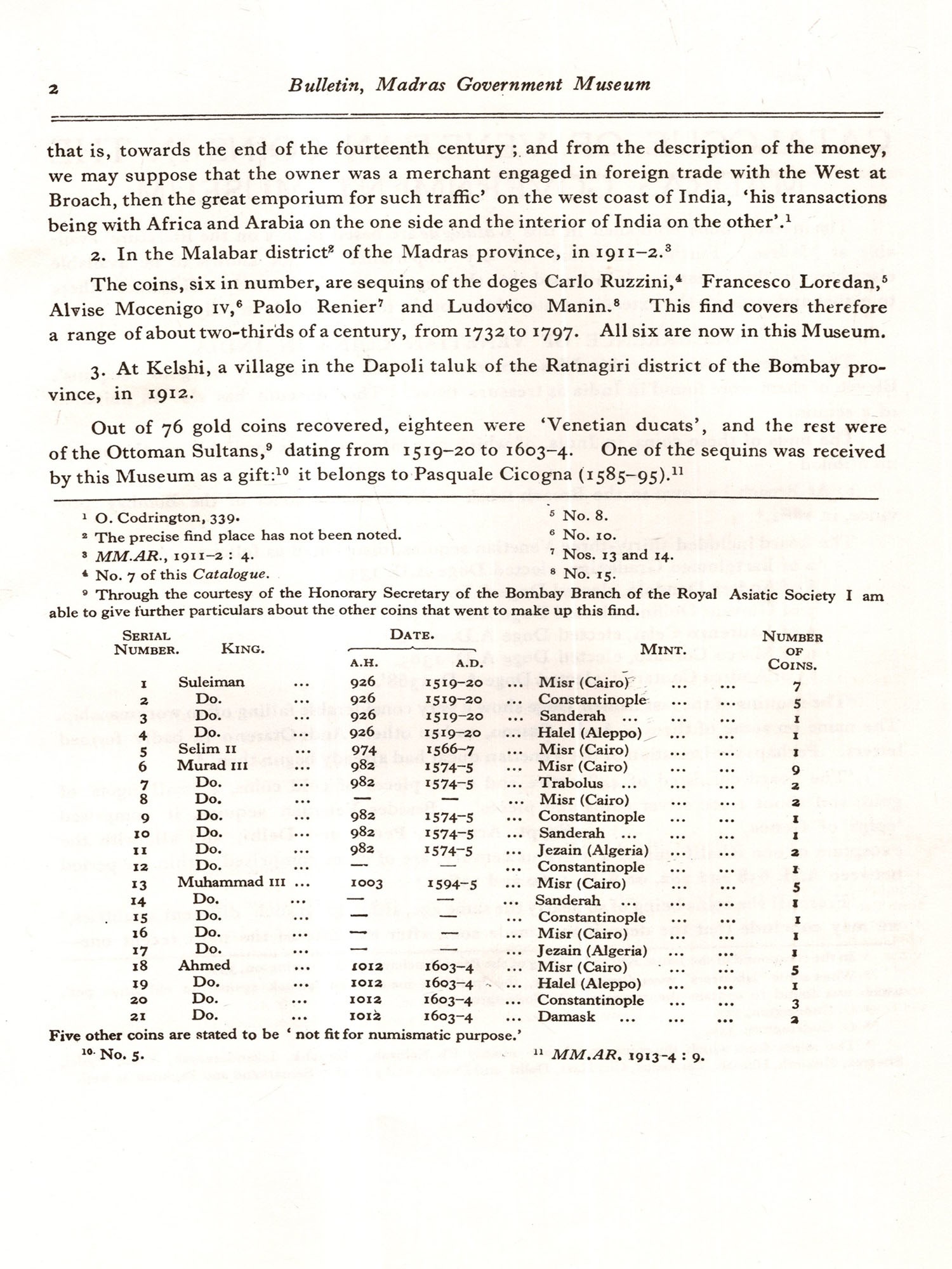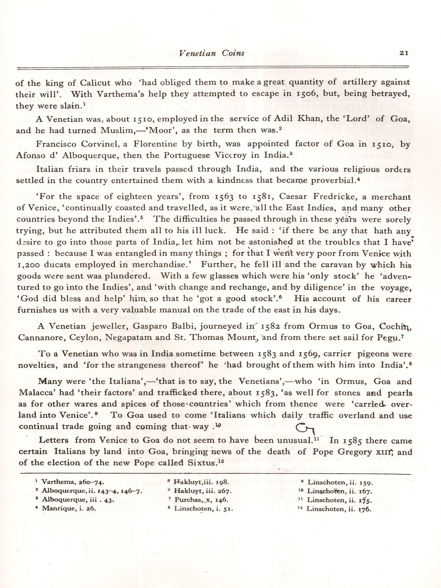 The findings of Venetian Coins as treasure-trove hoards in India attest the second phase of her commercial relations with European countries and provide new avenues to scholars to probe further on matters of cultural and commercial contacts among Asian and European countries. By 1938 the Government Museum Chennai possessed fourteen Venetian Gold Squirs". Thiru. T.G. Aravamuthan, M.A.B.L. a Madras High Court Lawyer and the Numismatic Curator of this Museum during 1930 had written a catalogue for these coins. As an eminent scholar of his field he had dealt at length on events related to the revival of the inflow of European gold coins, particularly the Venetian coins in India in 14-15th Centuries A.D. As such this work is much useful and informative not only to the Numismatists but also to all interested in socio-cultural studies. This work, which was published in 1938 as the Museum Bulletin soon went out of print.
