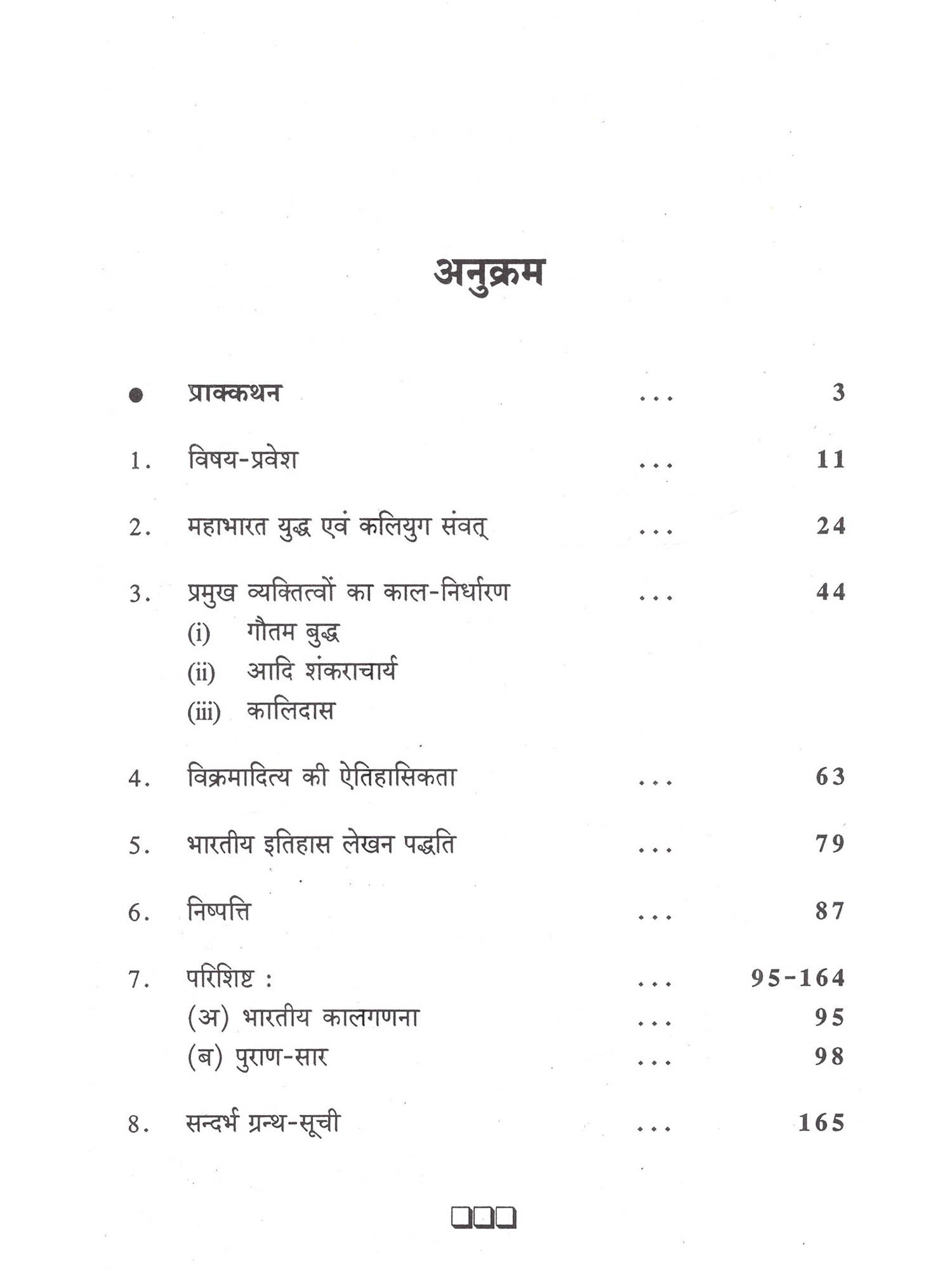 मानवीय सृष्टि कुछ हज़ार वर्ष पूर्व की ही समझी जाने के कारण सभ्यता और संस्कृति का इतिहास मात्र पाँच हजार वर्षों के भीतर ही समेटने की चेष्टा की जाती थी। ऐसी अवस्था में पश्चिमी विद्वानों द्वारा भारतीय इतिहास भी इसी के अनुरूप निर्धारित करने के यत्न किए गए। उपर्युक्त धारणा के प्रतिकूल साक्ष्य को या तो उनके द्वारा नज़रअंदाज़ कर दिया जाता था या उसे नकारकर अथवा उसकी अयथार्थ व्याख्या कर महत्त्वहीन घोषित कर दिया जाता था। परम्परागत मान्यताओं एवं पुरातात्त्विक साक्ष्यों की मनमानी व्याख्या द्वारा प्राचीन भारतीय इतिहास के अन्तर्गत ऐसी आधारभूत विसंगतियाँ उत्पन्न हो गईं कि उसका मूल ढाँचा और स्वरूप ही परिवर्तित हो गए। विक्रमादित्य का सर्वसम्मत तथा बहुप्रचलित संवत् प्रवर्तमान होने के बावजूद उसके अस्तित्व से ही इन्कार किया जाता रहा है। प्रस्तुत प्रबन्ध में पाश्चात्य विद्वानों की रूढ़ हो. चली ऐतिहासिक मान्यताओं की परम्परागत इतिवृत्त में उपलब्ध प्रामाणिक साक्ष्यों के माध्यम से की गई समालोचनाओं को समाविष्ट किया गया है। साथ ही परिशिष्ट के अन्तर्गत भारतीय काल-गणना एवं पुराण-सार का विवेचन हुआ है।