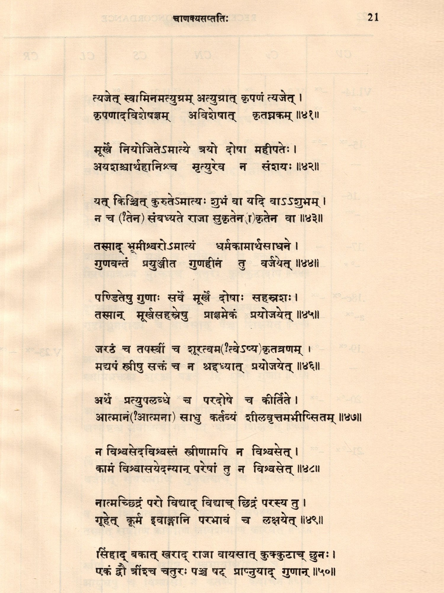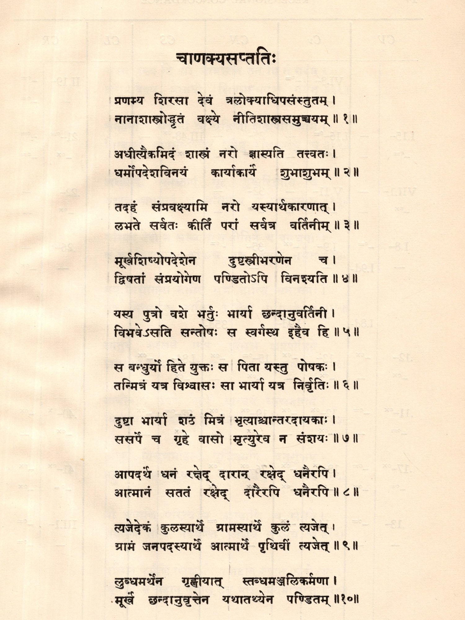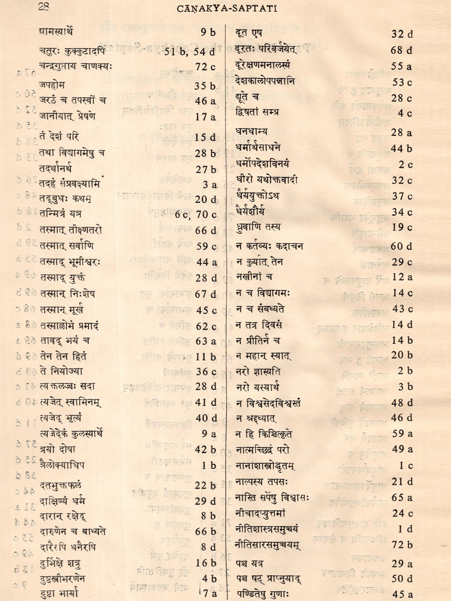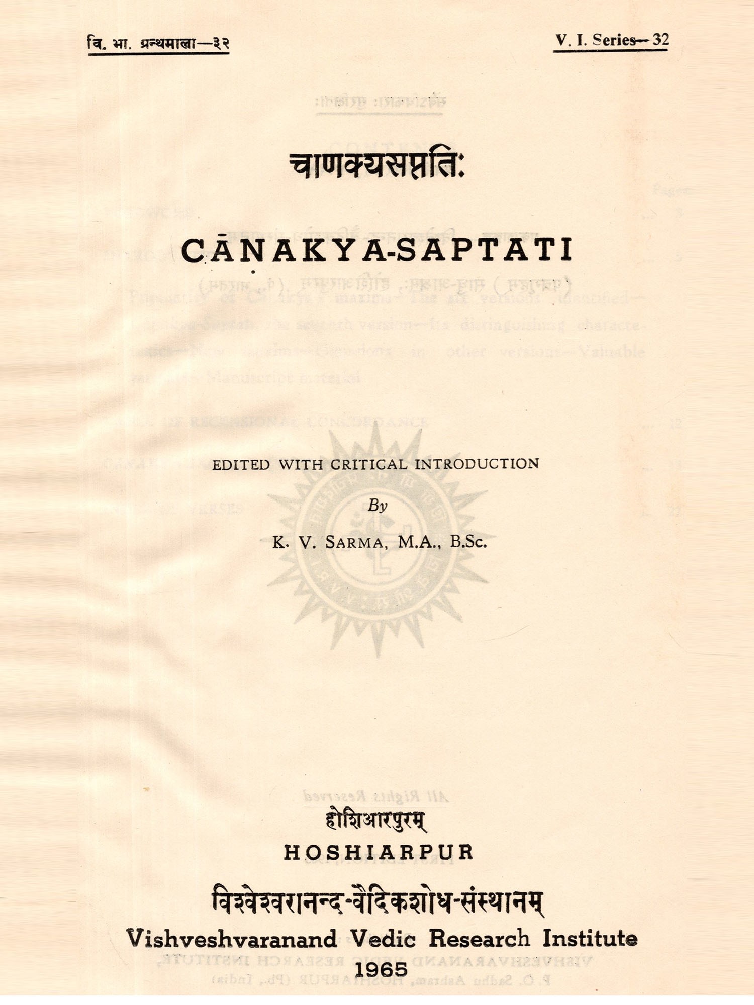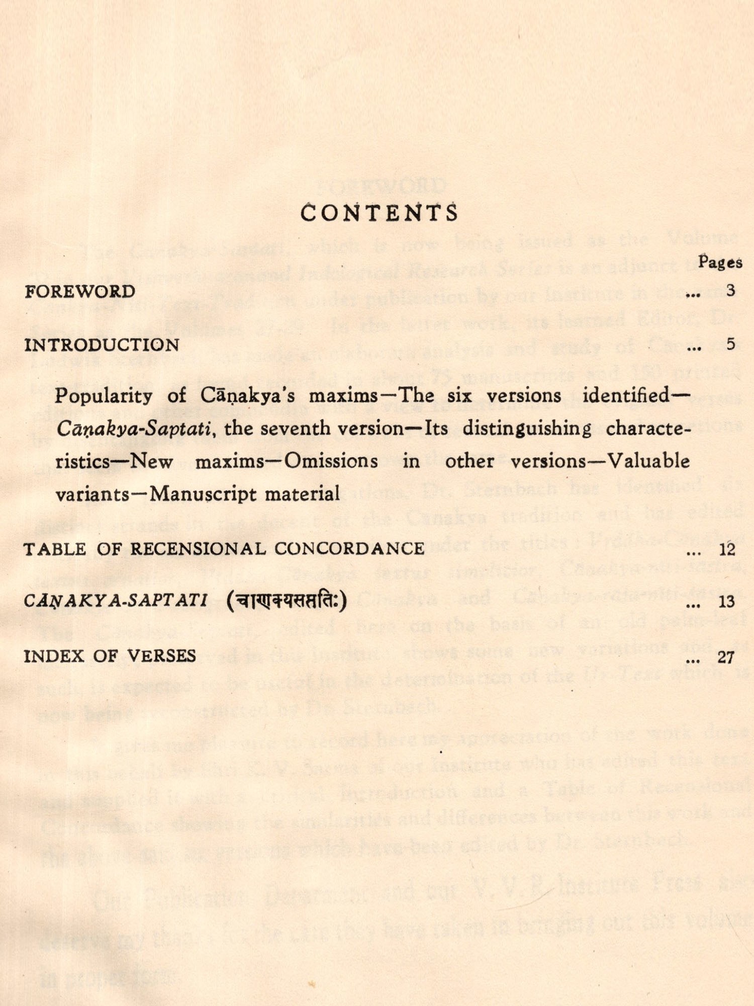 The Canakya-Saptati to is a collection of 70 worldly maxims said to have been imparted emperor Candragupta by his minister Caņakya, the reputed ethic-philosopher of ancient India. Whatever be the authenticity of this claim, there is no doubt that we have in these maxims gems of worldly wisdom relating to various stages of life and diverse strata of society. Six strands of the Canakya tradition have been identified and critically edited by Dr. Ludwik Sternbach in the Vishveshvaranand Indo-logical Series, as No. 27 and 28. The Canakya-Saptati presented here in a critical edition with a detailed Introduction and Recessional Concordance represents yet another tradition of the Canakya compendia which are re-markable for their popular appeal and pithy common sense.