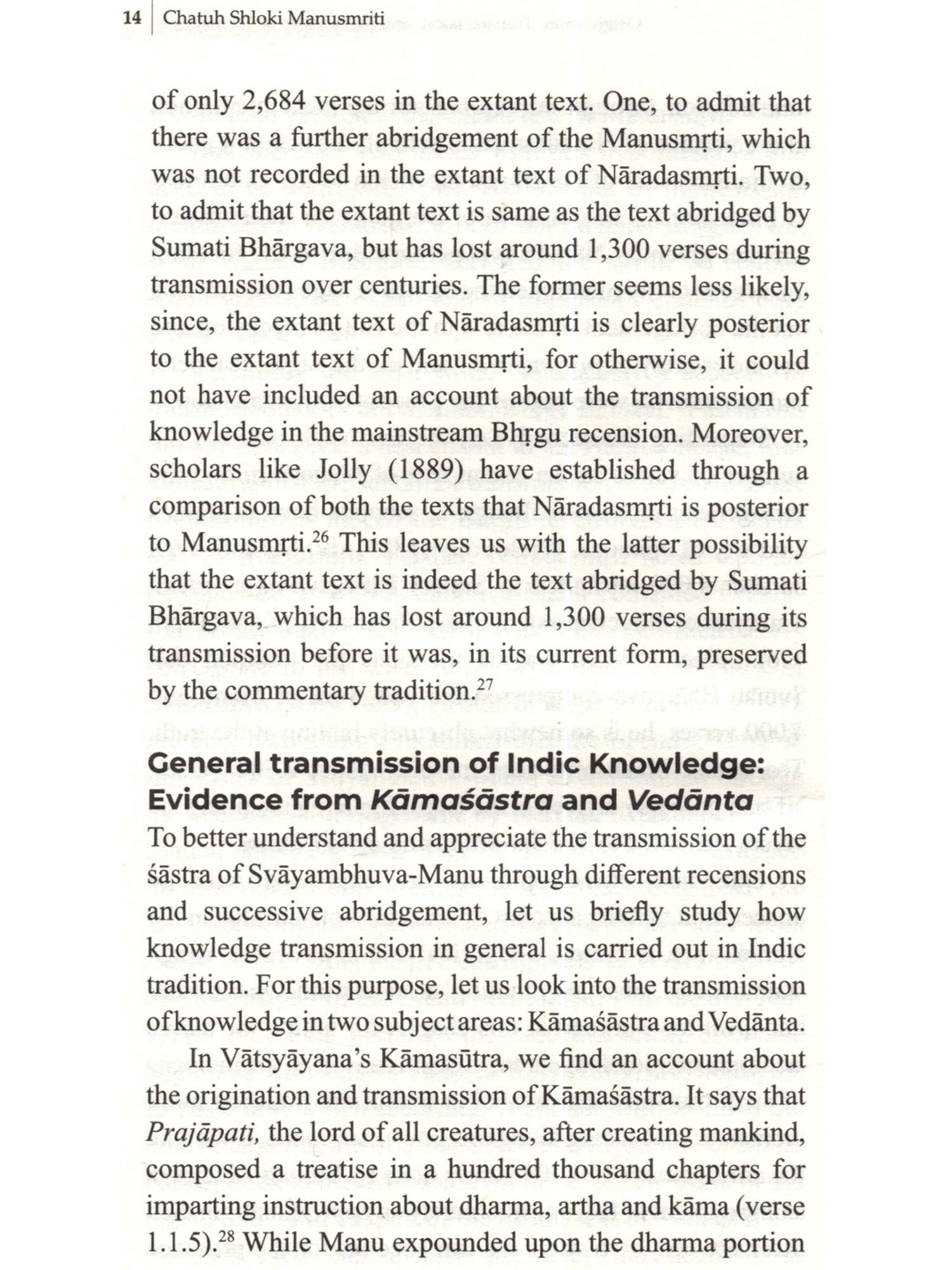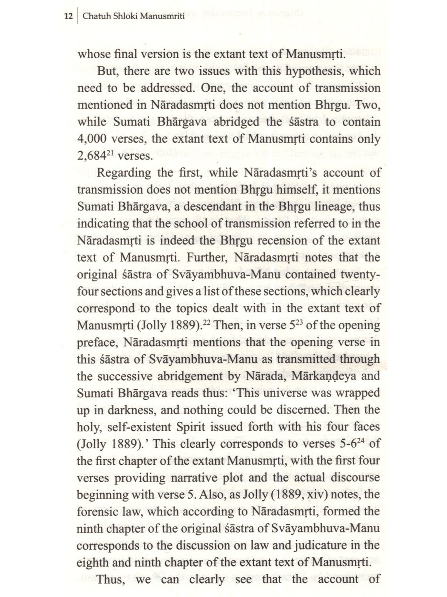 Starting from western indologists such as George Bühler and E Washburn Hopkins in the nineteenth century to Patrick Olivelle and Wendy Doniger of our own times, modern scholarship has had a long engagement with the text of Manusmrti. Though their engagement has been long and at many different levels, one thing which they are yet to come to terms with is the sheer size of the text as well as the wide range of the subject matter covered. in them. Modern scholarship has generally held that Manusmrti, like many other Hindu texts such as the Mahābhārata, was composed gradually over a long period of time. The predominant view is that such a composition was accomplished by collating and patching together various proverbial verses, moral sayings, and legal adages that were floating in the society over many centuries by anonymous authors, compilers, and copyists (Olivelle, Manu's Code of Law: A Critical Edition and Translation of the Manava-Dharmaśāstra 2005). Hopkins (1885,268), for example, expressed suchaview way back in his 1885 publication titled 'On the Professed Quotations from Manu Found in the Mahabharata: I draw the conclusion that the Sästram [Manusmrtil was in great part collated between the time when the bulk of the epic [Mahābhārata) was composed and its final completion, that previous to its collation there had existed a vast number of sententious remarks, proverbial wisdom, rules of morality etc. which were ascribed, not to this treatise of Manu at all, but to the ancient hero Manu as a type of godly wisdom. These I conceive to have floated about in the mouths of the people, not brought together but all loosely quoted as laws or sayings of Manu and these sayings were afterwards welded into one with the laws of a particular text called the Mänavas a union natural enough, as the two bodies of law would then bear the same title, although the sect had no connection with Manu except in name...According to my theory, these Manu-verses found in the Manava treatise were simply caught up and drawn from the hearsay of the whole Brahman world, keeping their form after incorporation with the Mänavas' text (emphasis mine). Echoing a similar view almost a hundred years later in her Introduction to her 1991 translation of Manusmrti, Wendy Doniger (1991) writes: The Laws of Manu encompasses contradictions that may indeed be ultimately 'insoluble', but not necessarily irreconcilable, nor are its attempts to reconcile them necessarily 'frenzied'. Given the historical background, it is not surprising that Manu expresses a number of different views on many basic points. Different parts of the text were added at different periods (the portions dealing with legal cases are generally regarded as the latest) and, in the recension that we have, some topics are split up and treated in several different places, or in what seem to us to be the wrong places.