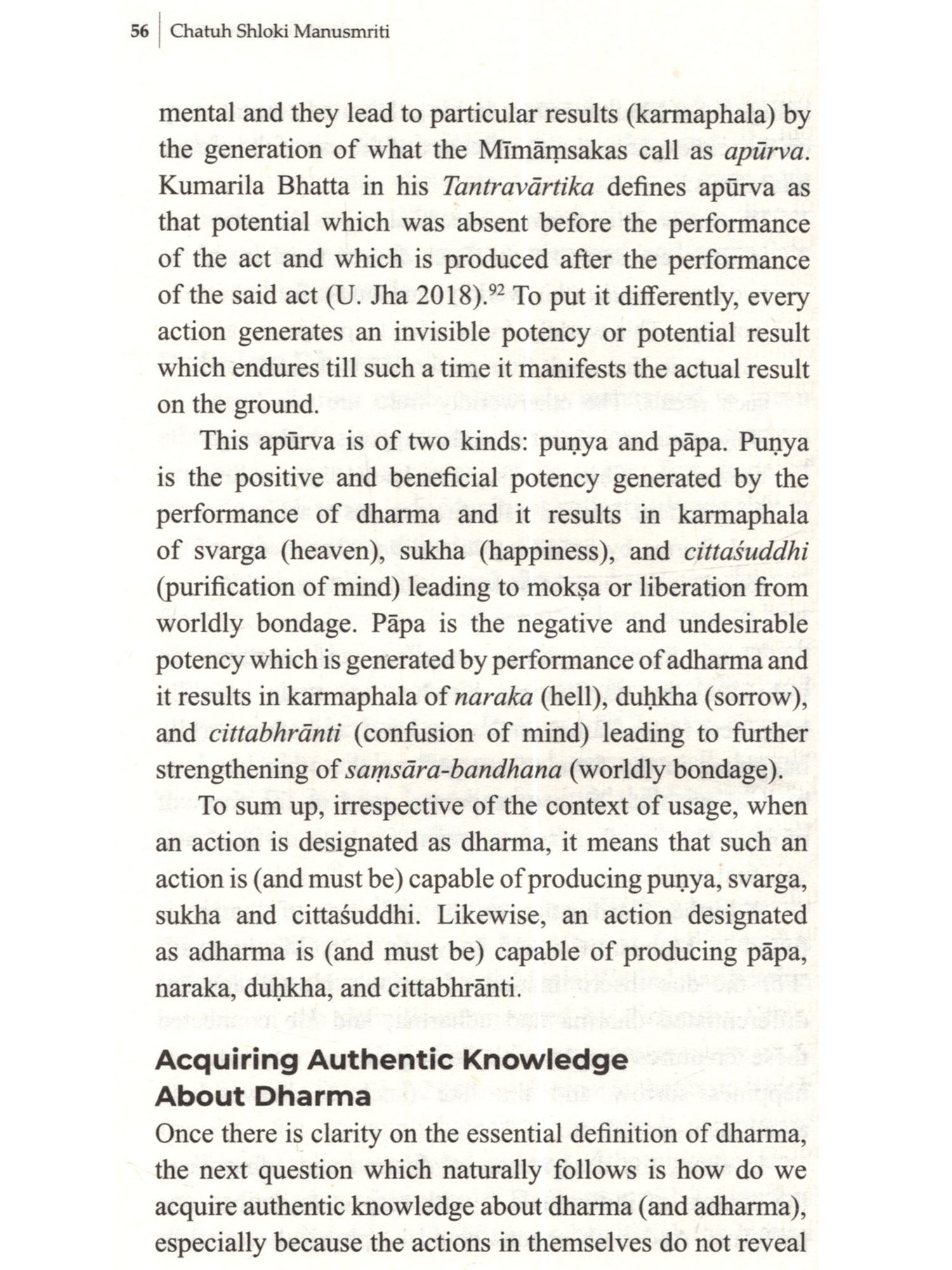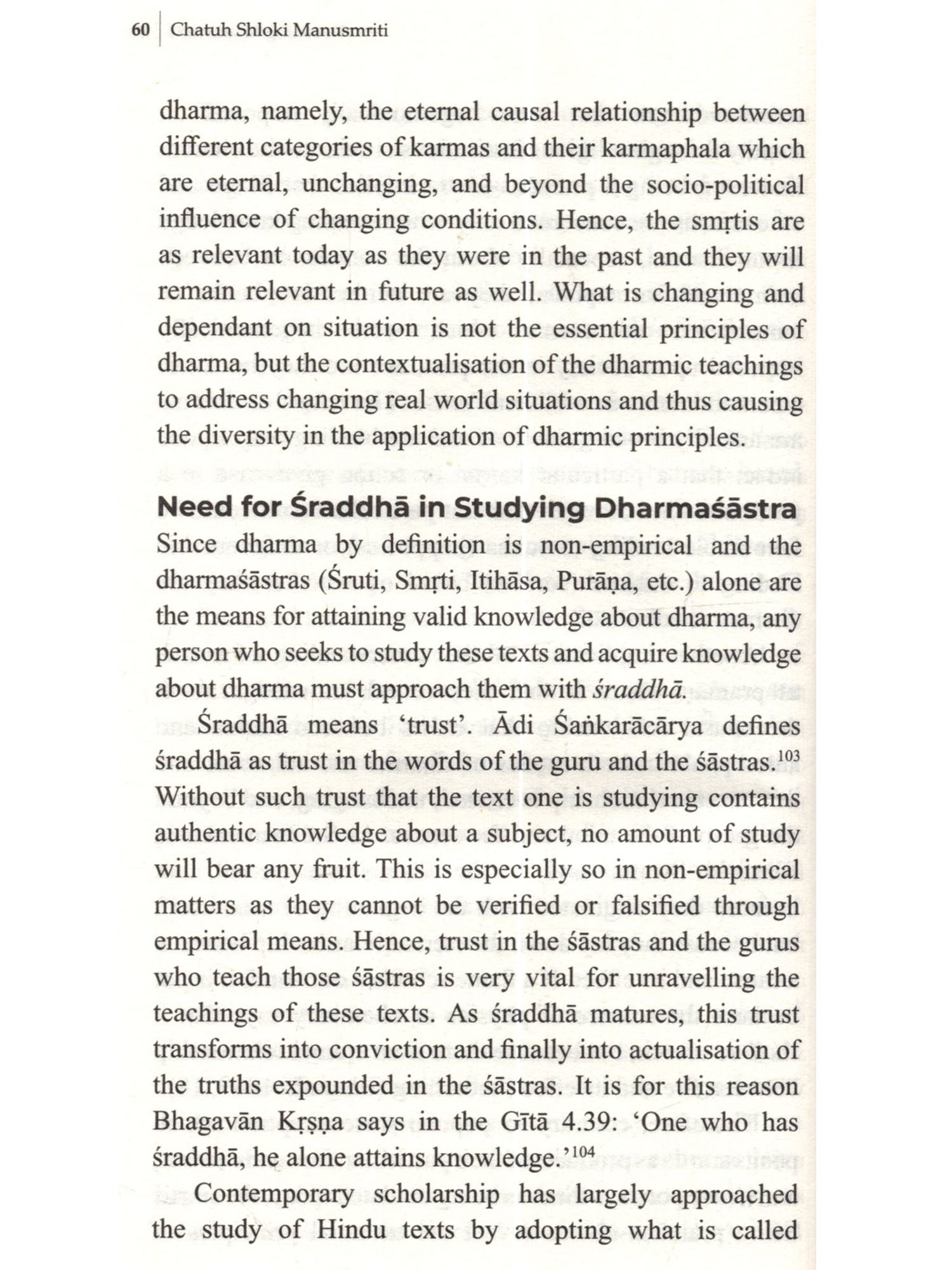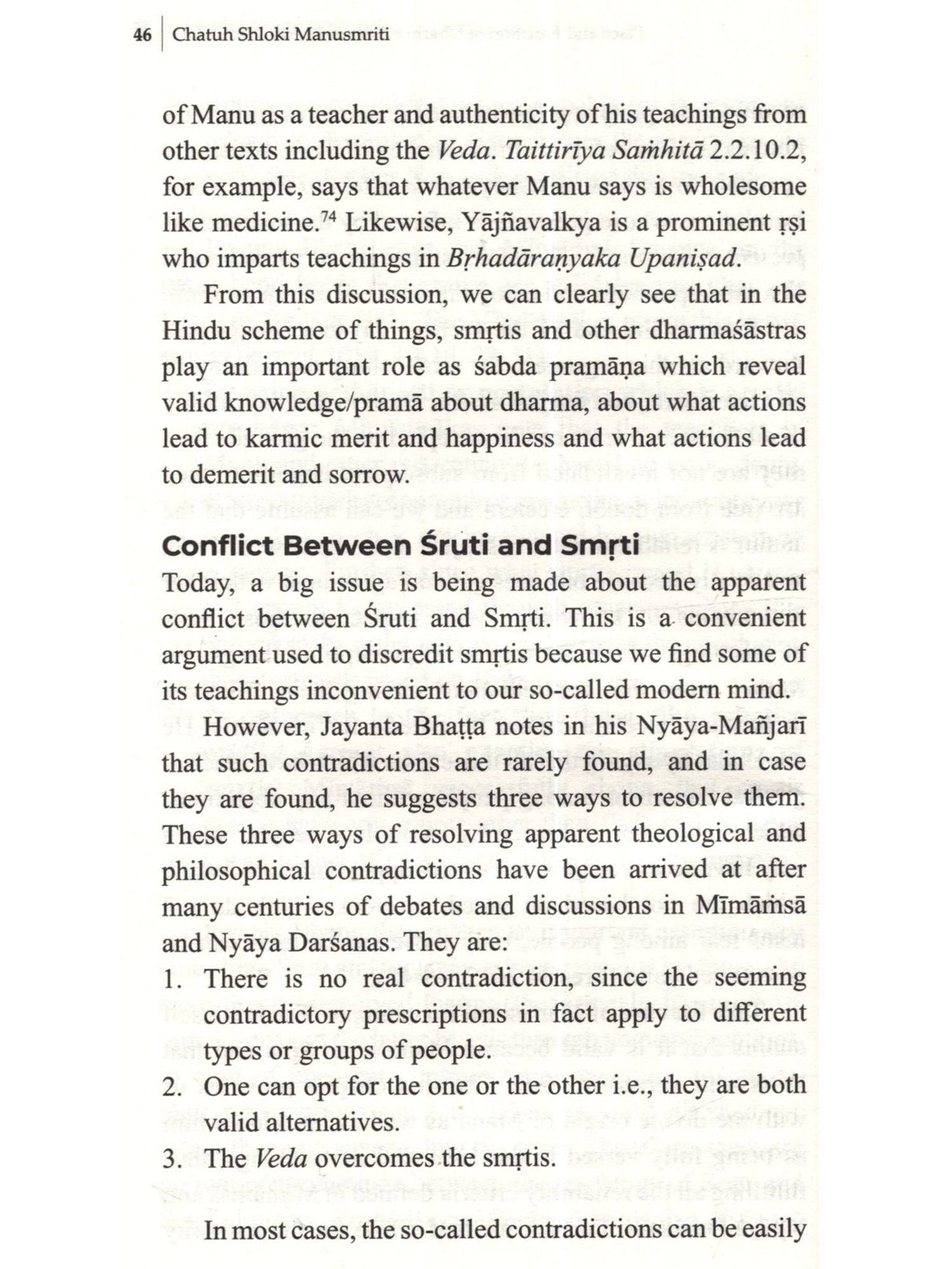 Mamesmriti occupies a prominent place in Indian textual tradition as one of the authentic sources of dharma. However, contemporary engagement with the text has been wrought with prejudice and discomfort left in the wake of colonialism. The present work aims to address the gap in contemporary approach and facilitate a better understanding through a philosophical analysis of the first four verses of Manusmriti, shedding light on the object, purpose and relevance of dharma texts. Rather than reducing Manusmriti to a mere relic of the past through a historical study, the book locates the text within the larger Hindu epistemological, ontological, and theological worldview and extracts the eternal teachings embedded within it. The book addresses common misconceptions on topics such as the definition of dharma, the integrity and importance of Manusmriti, the notion of ritual competency, and the Hindu conception of varna. The book draws from the entire Hindu textual tradition spanning the Vedas, Upanishads, Smritis, Itihasa-Puranas, and the Gita. It references the works of renowned acharyas including Adi Shankaracharya, Ramanujacharya, Madhvacharya, Vallabhacharya, Sayanacharya, Kumarila Bhatta, and Sri Aurobindo.