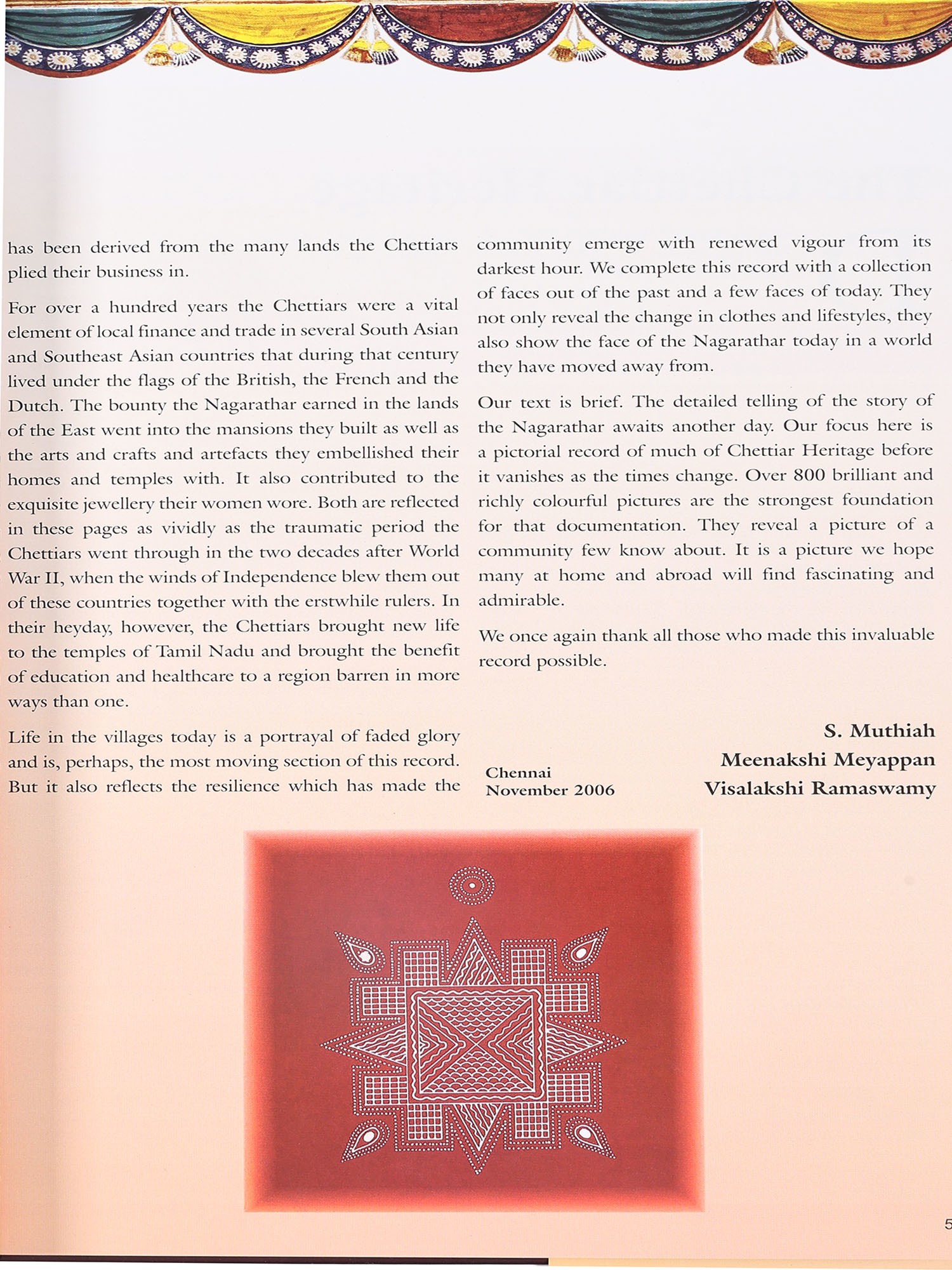 This pictorial record would not have been possible but for hundreds of Nagarathar who understood what we were trying to do and showed their appreciation of our efforts by opening their doors to us generously. That helpfulness made this picture-rich volume as complete a book on Chettiar Heritage as possible. To every one of them we acknowledge our indebtedness and thank them for their kindness in making this record of the community possible.