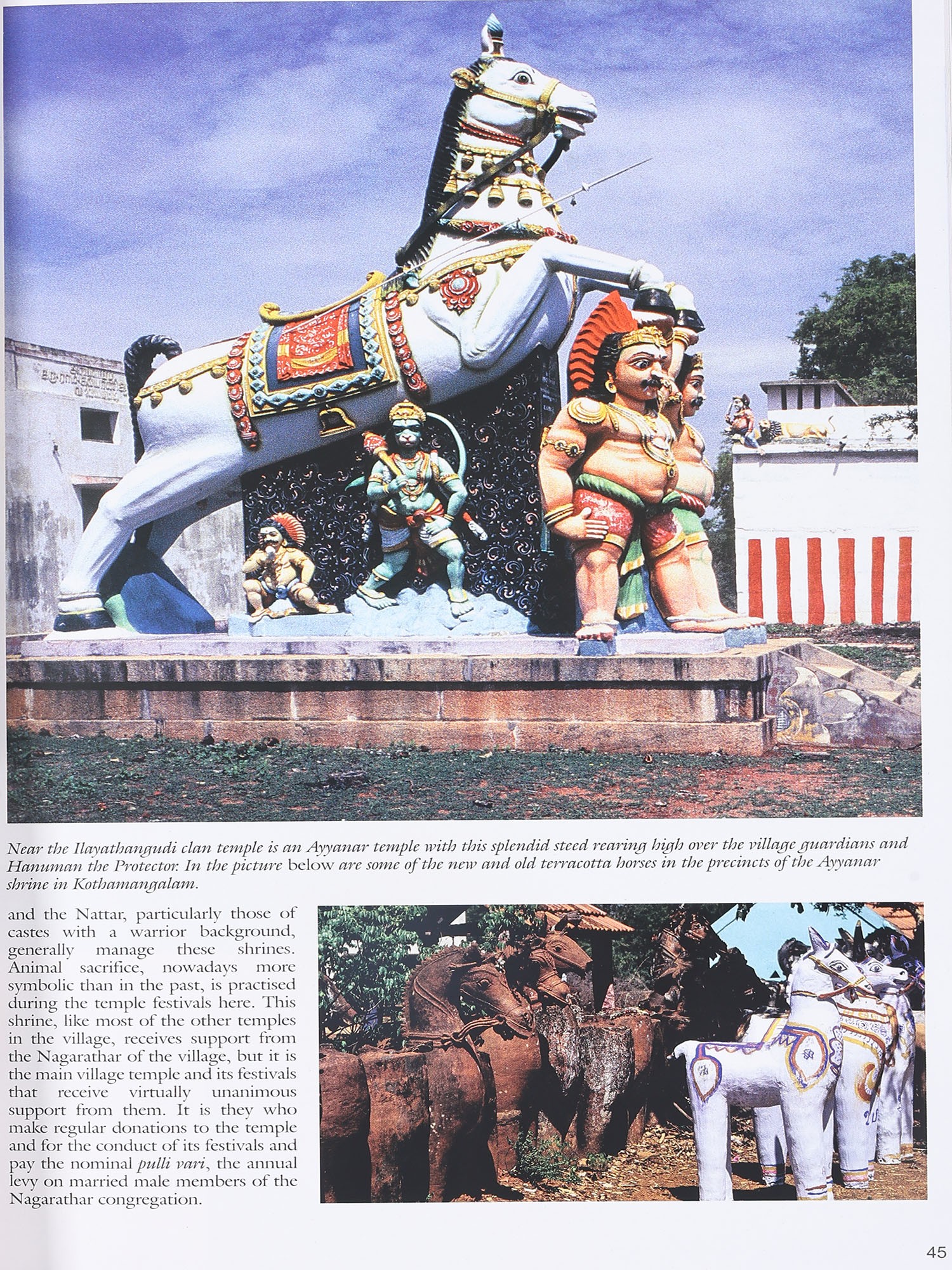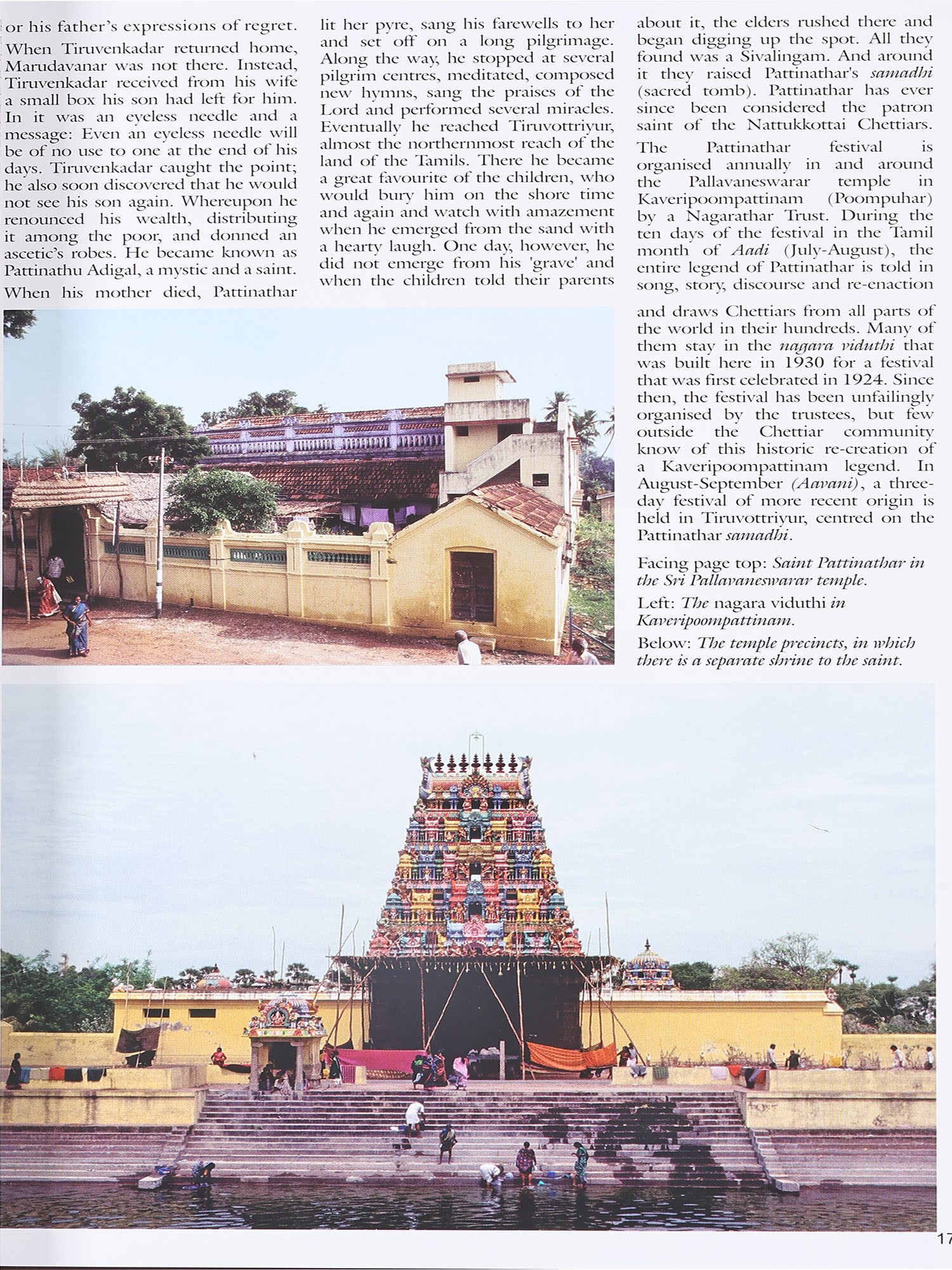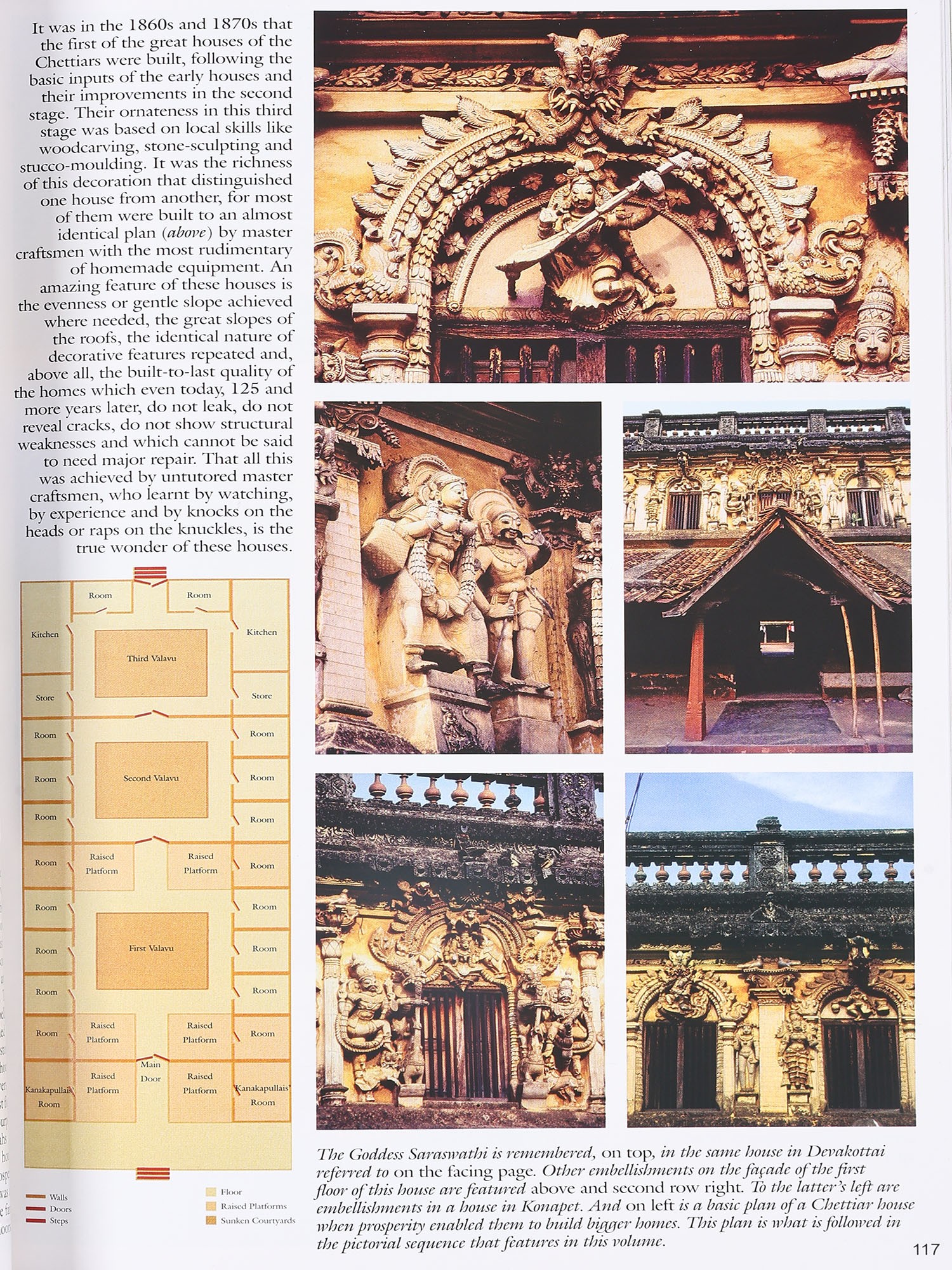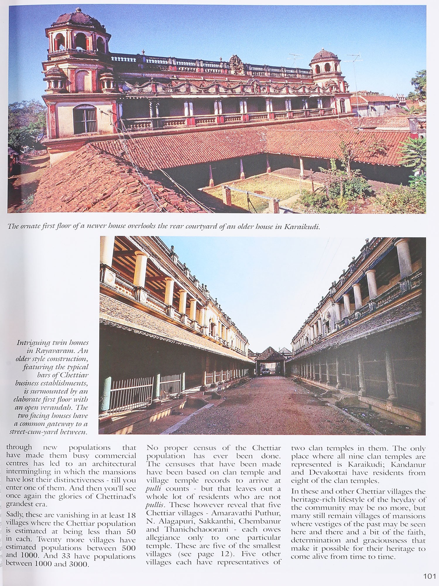The Chettiar Heritage, the book that has emerged from the contributions of all those mentioned above and those who helped with partial sponsorship, is divided into 15 main sections. The Introduction relates the story of the community and leads on to its most enduring legend, recalled every year in what was once known as Kaveripoompattinam. Subsequent sections deal with the nine clan temples to which the Chettiars owe allegiance and the village temples without which no Nagarathar village is complete. The mansions of the Nagarathar, triumphs of architecture and a compendium of skilled craftsmanship in all its rich variety, is the most comprehensive section. Every part of the great houses that tower over a barren landscape is seen separately by the camera eye in these pages.