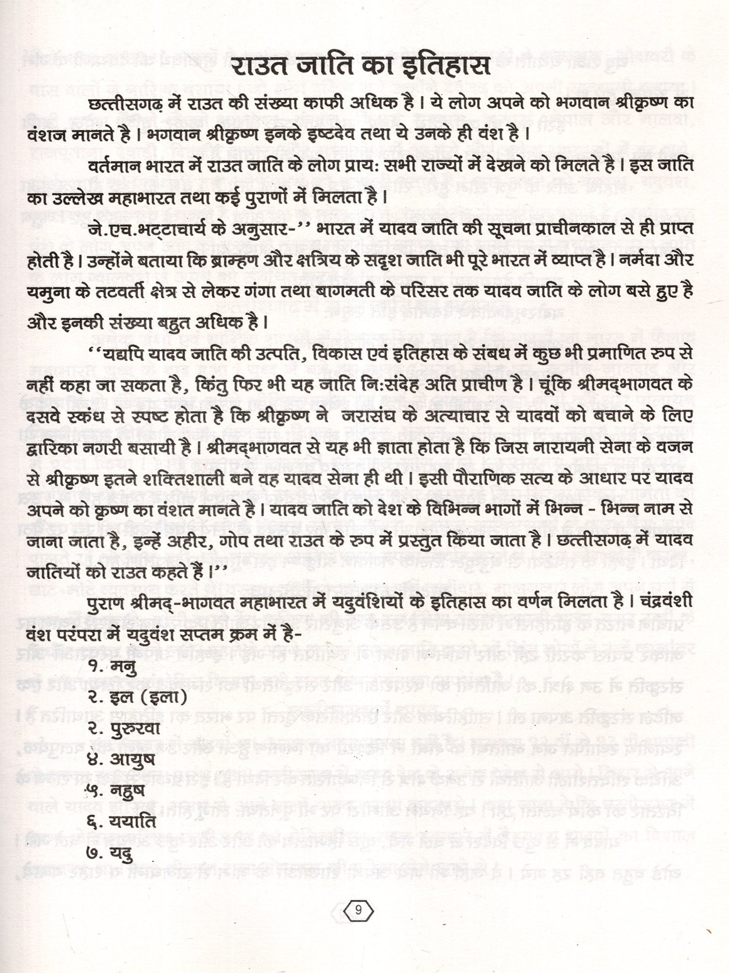 यादव नाति का उल्लेख वेदों में मिलने के कारण इसे वैदिक जाति भी कहा जा सकता है। पुराणों में इनका उल्लेख मिलता है। ब्रह्मा जी के मानस पुत्र अत्रि ऋषि के पुत्र चंद्रमा हुए। इनके नाम से इस वंश का नाम चंद्रवंश पड़ा। चंद्रवंशी राजाओं की वंश परंपरा में सातवें राजा यदु के नाम पर इस वंश का नाम यदुवंश प्रसिद्ध है। चंद्र के पश्चात चंद्र के पुत्र युद्ध, बुद्ध का पुत्र पुरूरवा और पुरूरवा के आठ पुत्र हुए। इनके नाम है-वायु, दृकायु, अश्वासु, नामालूम, घृतिमान, बसु, शुचिविद्य एवं शतायु। इनमें से ज्येष्ठ वायु के पुत्र नहुस हुए। नहुस के पुत्र रति, ययाति, संयाति, उद्भवाचि श्याति, मेघनाति। नहुस के पश्चात ययाति शक्तिशाली सम्राट बने। ययाति की दो रानियों में से एक असुर गुरु शुक्राचार्य की पुत्री देवयानी थी। देवयानी के दो पुत्र यदु और तुर्वसु हुए। यदु के चार पुत्र हुए कोष्ठ, नील, अंतिम, लघु यदु की अड़तीसवीं पीढ़ी में सम्राट सायस्वत हुए। सारस्वत के दो पुत्र थे- अंधक और वृष्ठि । इन दोनों भाईयों के नाम से यह वंश दो धाराओं में विभक्त हुआ प्रथम, अंधक वंशी और द्वितीय वृष्ठि वंशीय। अंधक की दसवीं पीढ़ी में महाराज आवुक हुए। आदुक के दो पुत्र उग्रसेन तथा देयक हुए। उग्रसेन का पुत्र कंस हुआ। देवक की पुत्री देवकी थी। कंस और देवकी अंधक वंशीय यादव क्षत्रिय थे। और दूसरी धारा वृष्णि वंशीय यादव क्षत्रिय थे। तृष्ठि के पुत्र भजमान, भजमान के पुत्र विदुरय, विदुरथ के सुर के शिवी, शिवी के पुत्र स्वयं भोज, स्वयंभोन के हृदक, हृदक के देवबाहु, देवबाहु के विदुरथ, विदुरथ के देवभीढ़ हुए। देवीभीक के दो रानियां थी मरिष्ठा और गुणवती । देवभीढ़ के पुत्र सुरसेन के दस पुत्र हुए। इनके नाम है वसुदेव, देवभाग, देवाश्रवा, कानक, संजय, श्यामक, करूं, समोक, शत्सक तथा वृक हुए। वसुदेव के दो पुत्र हुए कृष्ण और बलराम । यदुकुल वंशीय भगवान श्रीकृष्ण की महिमा पंडित छवि ने इस वंश को दैदीप्यमान किया है। विधाता भगवान ब्रह्मासे जिस वंश का उद्भव हुआ, कर्मवीर श्रीकृष्ण ने जिस परंपरा को आगे बढ़ाया और आधुनिक परिवेश में जिन्होंने अपनी समृद्धशाली परिवेश में भी जिन्होंने अपनी समृद्धशाली परंपराओं को अक्षुण्ण बताएं रखा है।