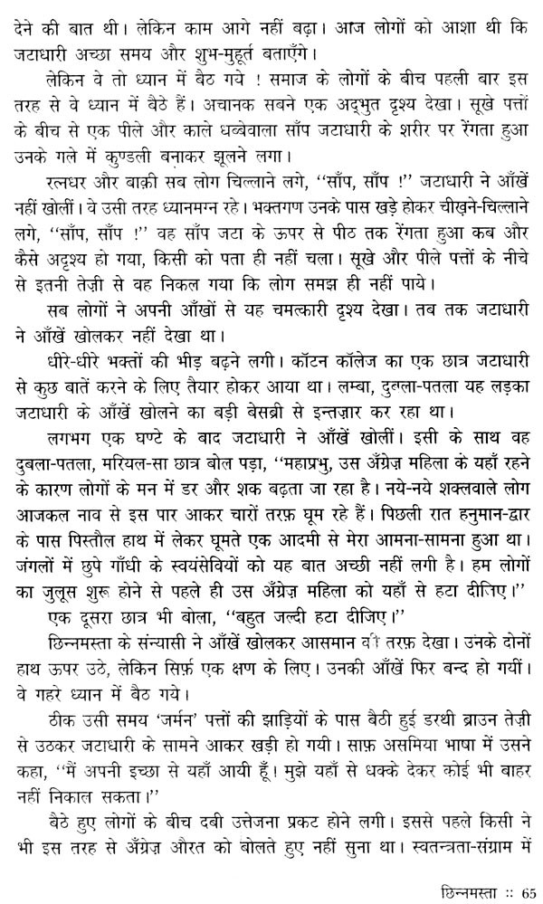 इस उपन्यास में उस समय के असम पर शासन करनेवाले अँग्रेज शासकों का भी कुछ वर्णन है। एक अँग्रेज महिला ने किस तरह शक्तिपीठ के तान्त्रिक के साथ सम्बन्ध बनाये थे उसे मूल कहानी के रूप में लिया गया है। इस उपन्यास के प्रधान नायक छिन्नमस्ता के जटाधारी का परिचय अब भी रहस्य बना हुआ है। किसी को यह ठीक से नहीं मालूम कि वे कहाँ से आये थे। उपन्यास का मुख्य हिस्सा है-इस शक्तिपीठ में हर समय चलते रहनेवाले बलि-विधान की कहानी। कहते हैं कि पहले यहाँ नरबलि होती थी। अँग्रेज़ों के राज में इसे बन्द कर दिया गया। लेकिन अँग्रेज शासकों ने मन्दिर के अन्दरूनी नीति-नियमों में कभी दखल नहीं दिया। मन्दिर का सारा काम पुजारियों के हाथों में ही था, इसलिए आज भी इस मन्दिर में पक्षियों, बकरों आदि की बलि दी जाती है। इस शक्तिपीठ का आँगन हमेशा खून से रंगा रहता है।