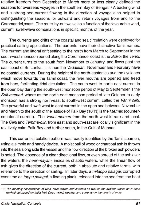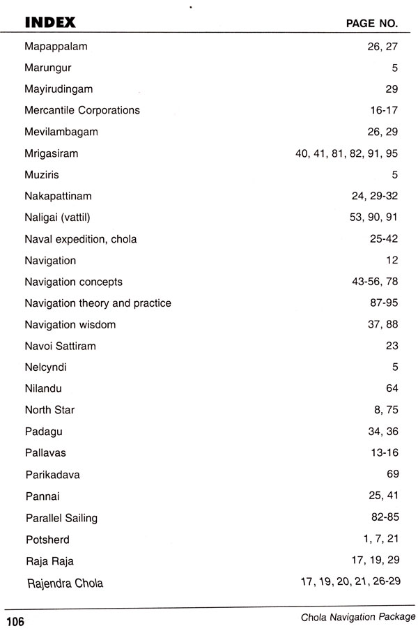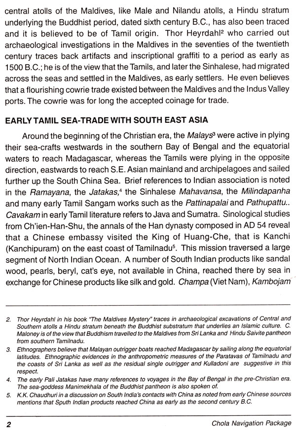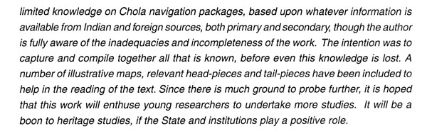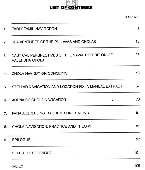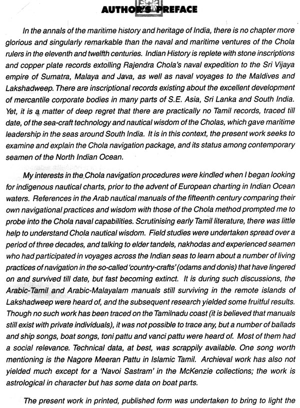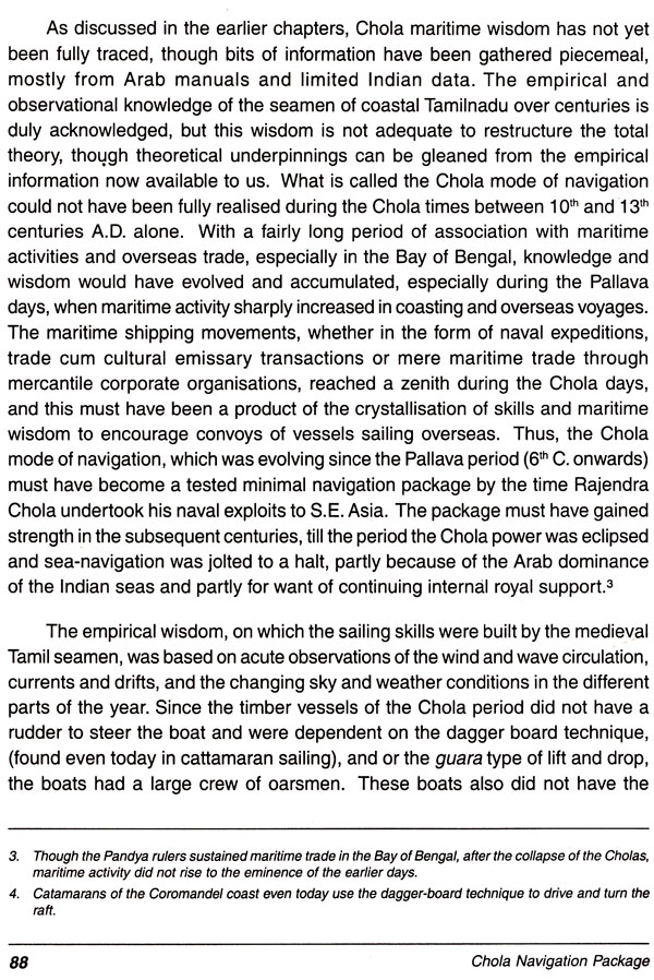 The book 'Chola Navigation Package' seeks to build on the navigational practices, skills and wisdom that finally culminated in the Chola naval expeditions to Malaya and Indonesia and cultural-cum-trade emissaries to China, based upon limited medieval documentation in the North Indian Ocean arena, and oral knowledge and living practices of the Coromandel coast. The book is the first ever attempt to narrate the Chola Navigation mode, as it was popularly known among medieval seamen, especially the Arabs, Omanis and the Chinese. Though couched in cautious terms based on limited information, the book highlights the expertise of Tamil seamen in celestial navigation and parallel sailing. The book opens a challenge to young researchers for a deeper investigation into the virgin field of maritime technology.