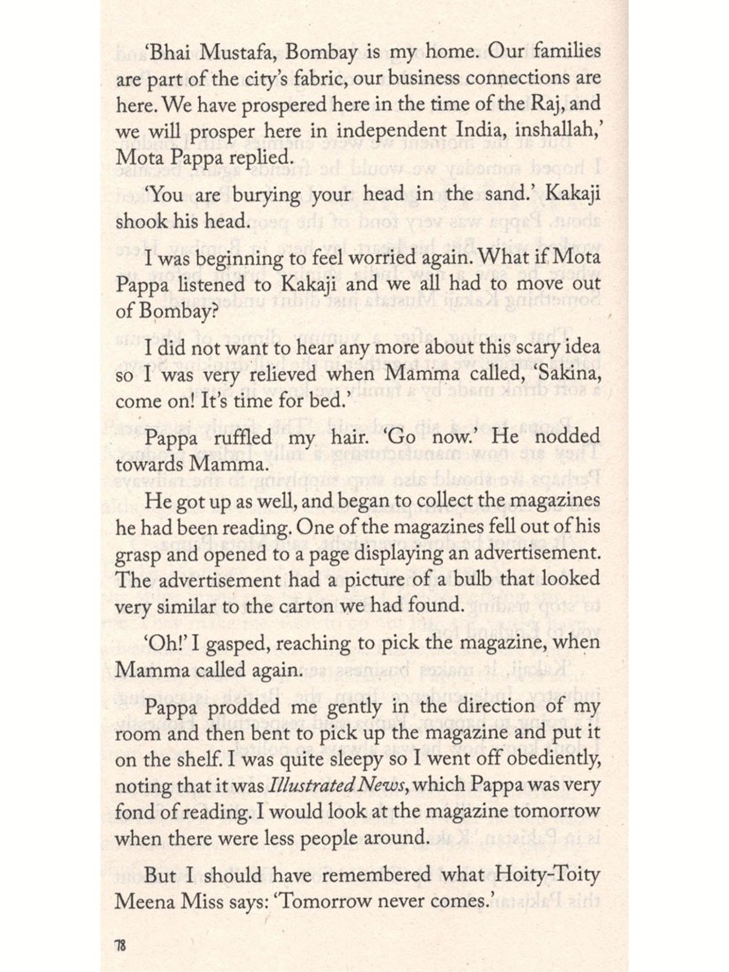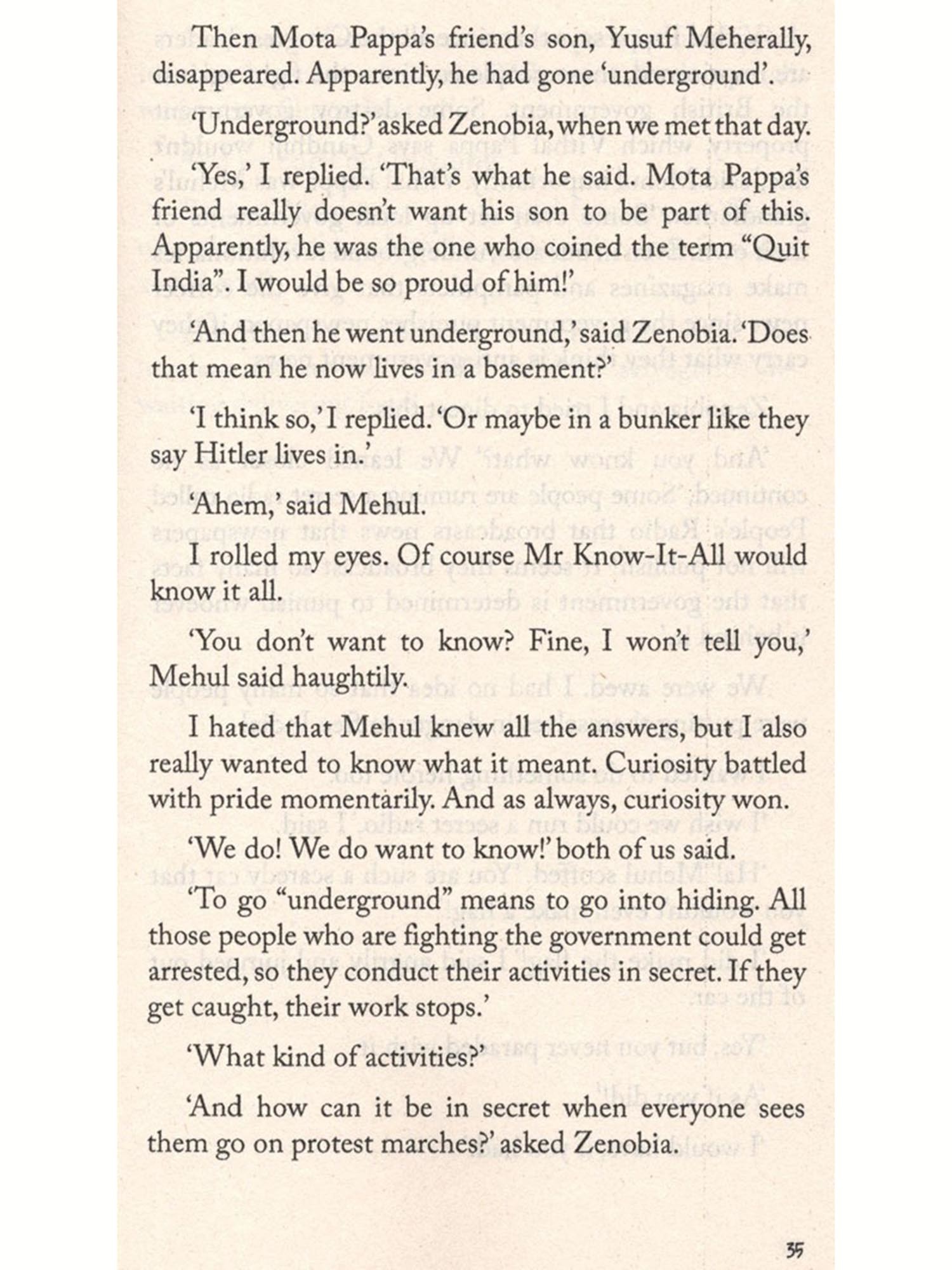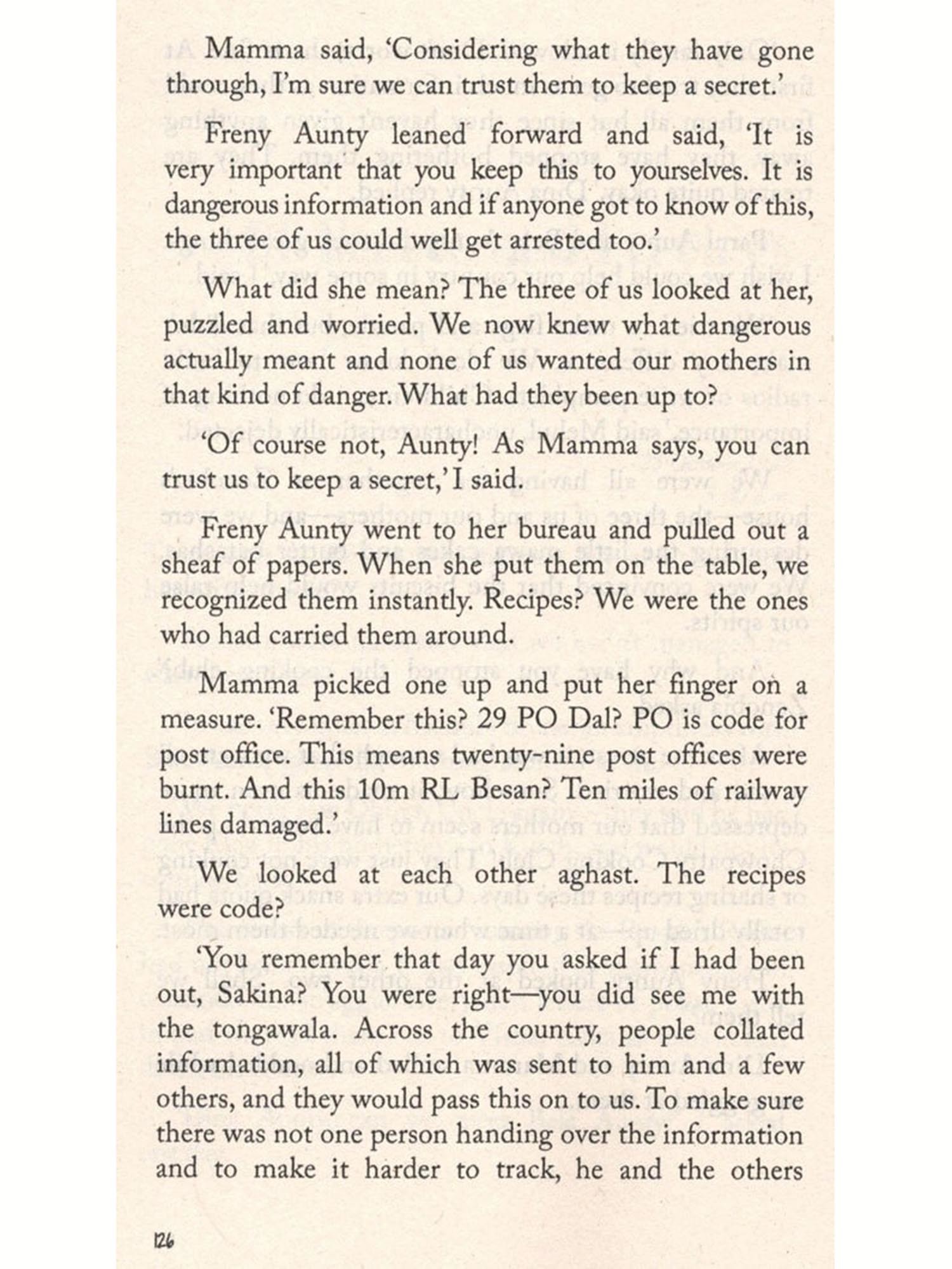 With Mahatma Gandhi's call to the British to Quit India, the city has become a hotbed of revolutionary activity-student protests, secret magazines and even an underground People's Radio, which broadcasts news that the British want concealed. Sakina and her friends Zenobia and Mehul desperately want to be part of this struggle for freedom-even when there is little that they are permitted to do. But at least, they are trying to do something useful, while their mothers are only running a cooking club.
