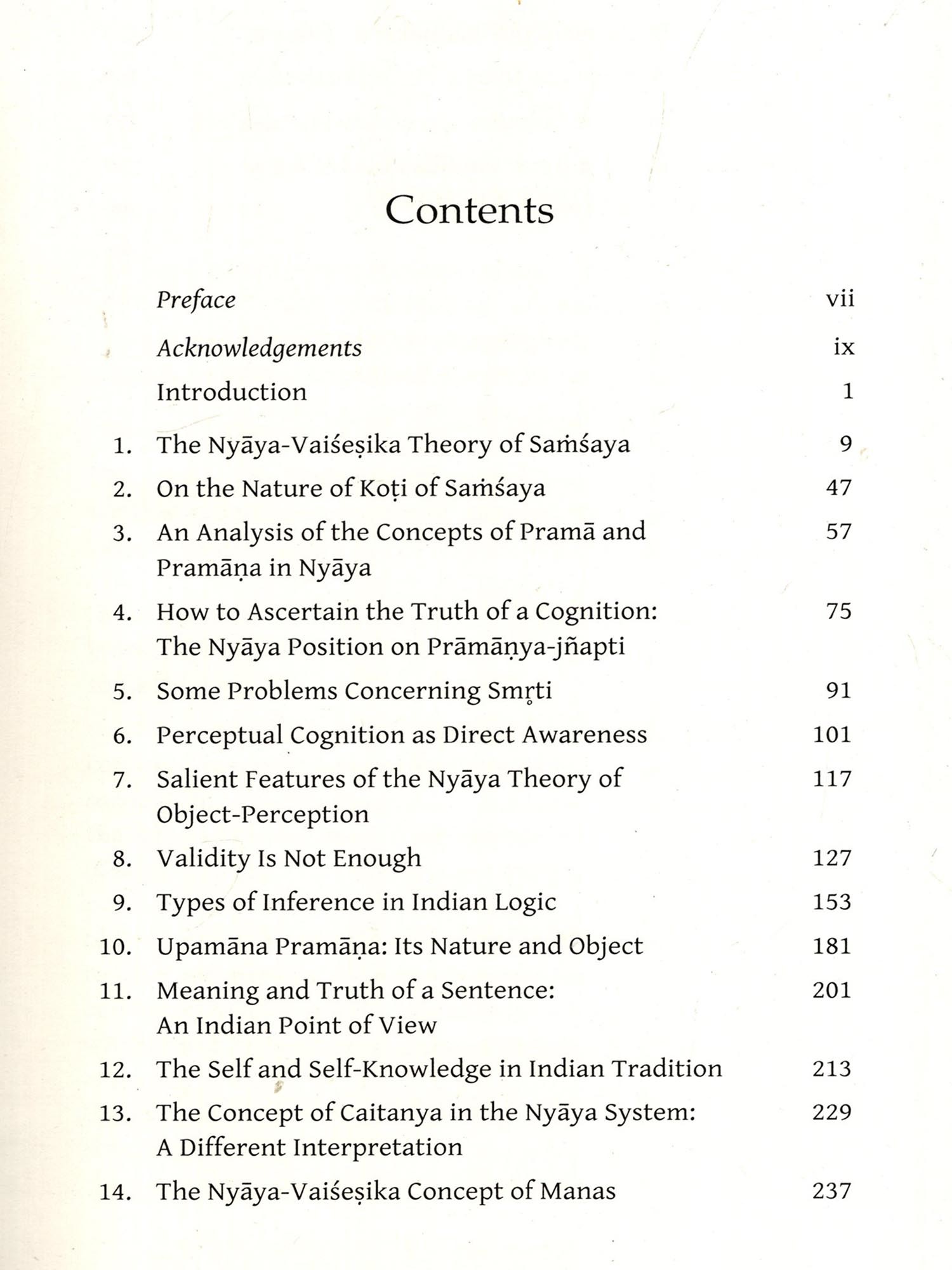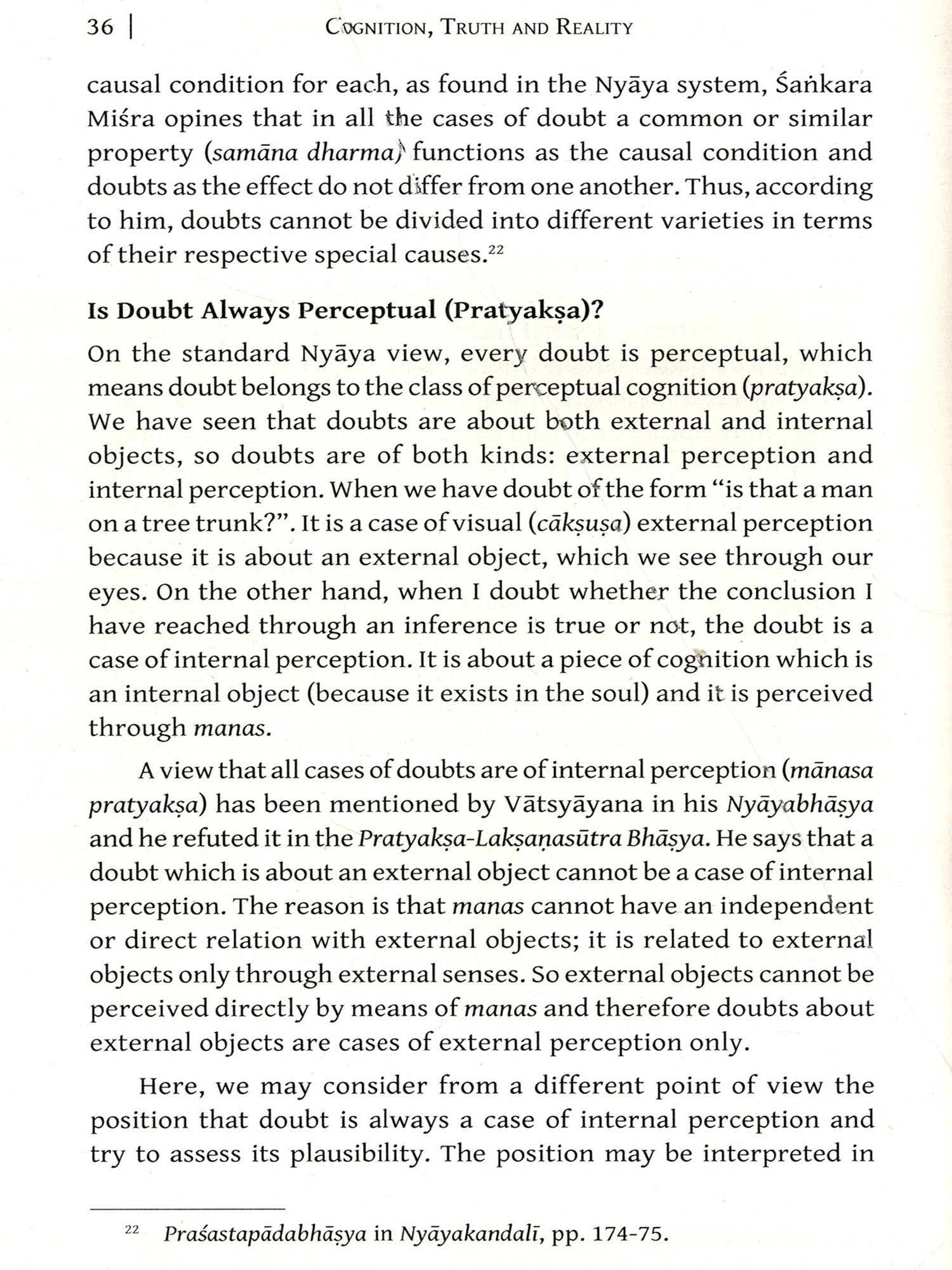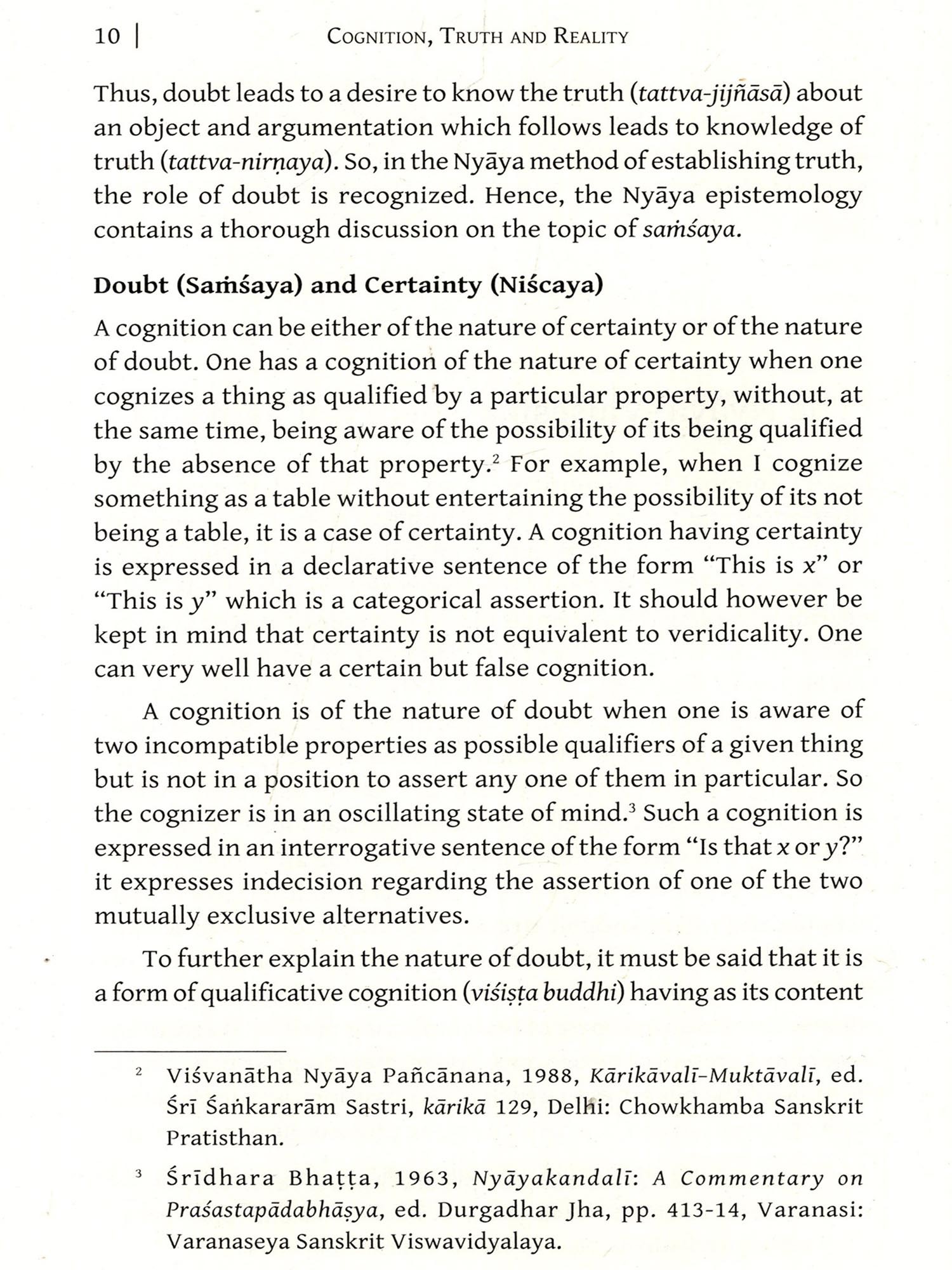 THIS book is a collection of essays on some basic concepts and issues discussed in Indian epistemology and metaphysics. First eleven essays deal with various epistemological topics. Chapter 1 is on samsaya (doubtful cognition). Doubt has an important position in philosophical enquiry. Specially the Nyaya school of philosophy, which is well known for its theory of logical debate (vicara), holds that logical debate starts with samsaya (doubt). So, in Nyaya texts, we find a detailed account of samsaya. This essay represents a comprehensive study of the Nyaya-Vaisesika position regarding samsaya. Definitions, causes and types of saisaya - all have been discussed here. It contains also a critical analysis of some important issues relating to samsaya and suggests some plausible answers to some relevant questions.