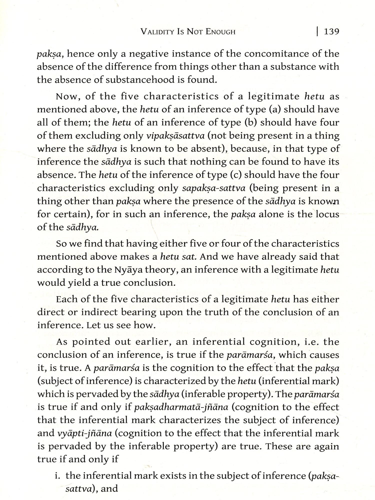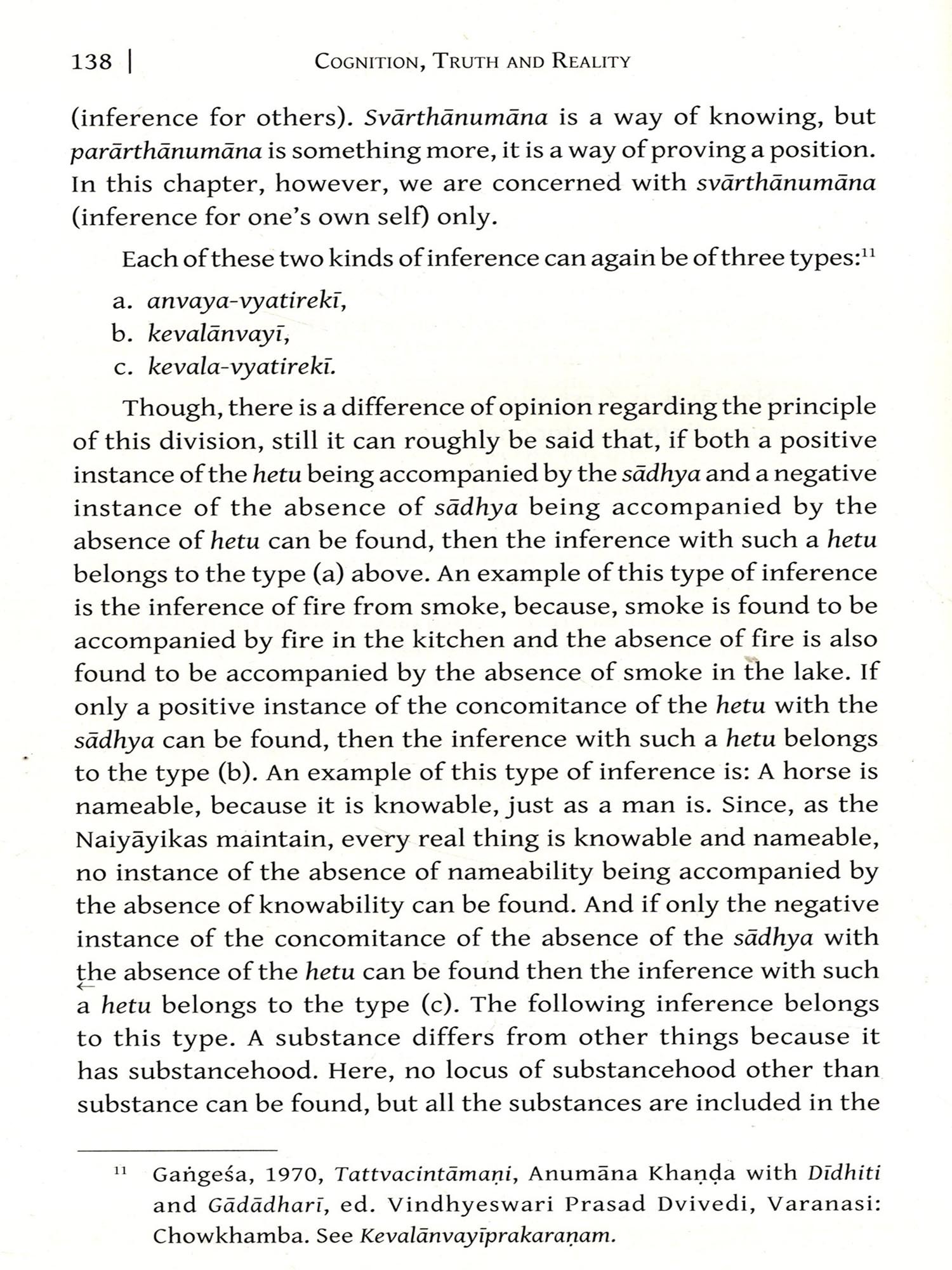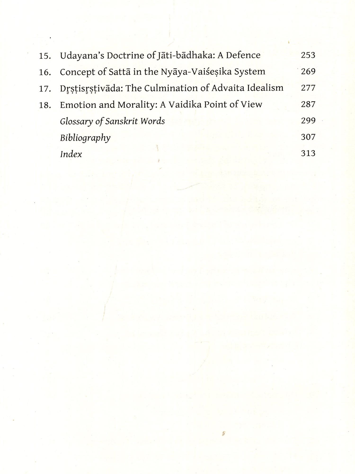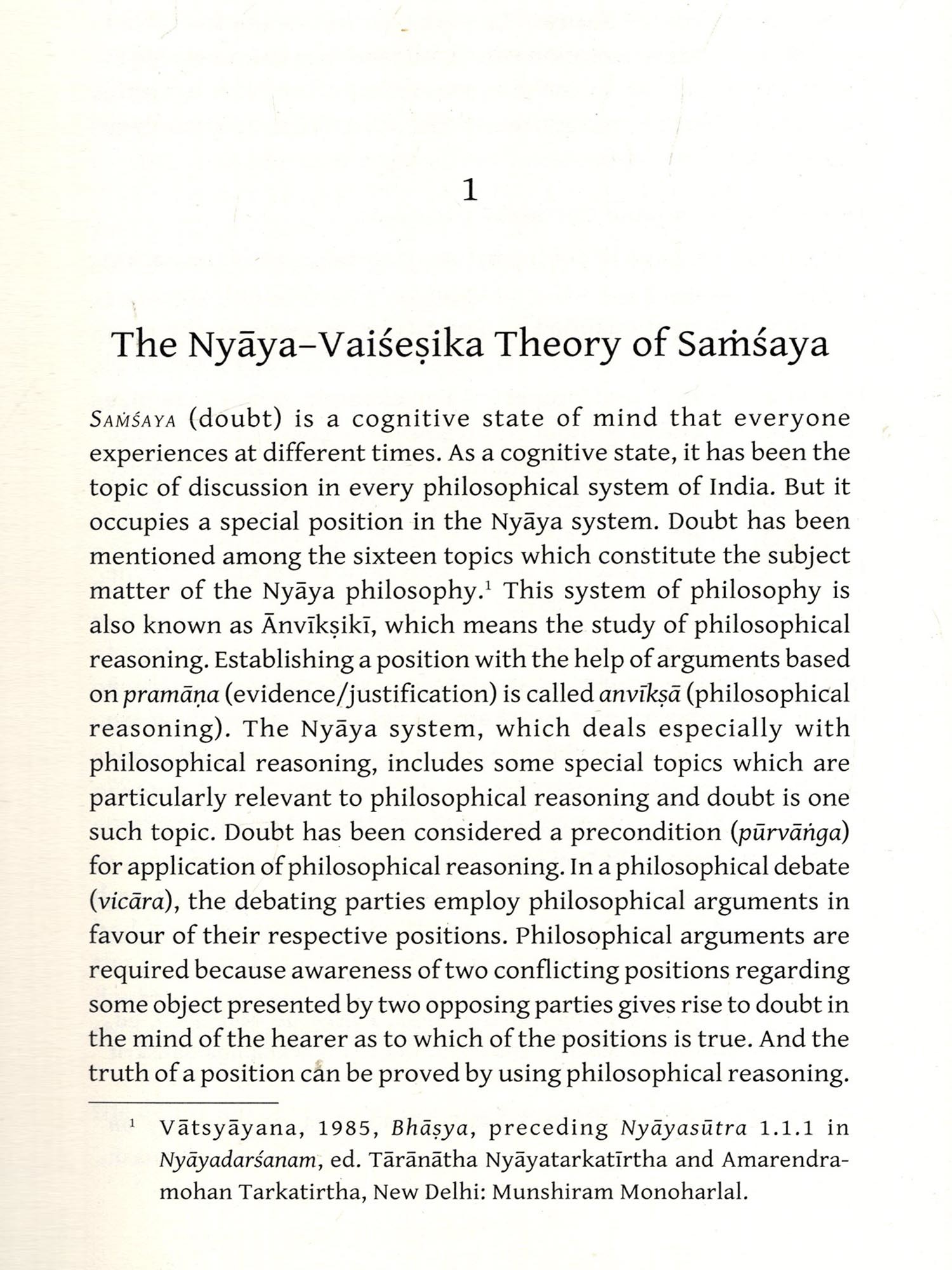 THIS book is a collection of essays on some basic concepts and issues discussed in Indian epistemology and metaphysics. First eleven essays deal with various epistemological topics. Chapter 1 is on samsaya (doubtful cognition). Doubt has an important position in philosophical enquiry. Specially the Nyaya school of philosophy, which is well known for its theory of logical debate (vicara), holds that logical debate starts with samsaya (doubt). So, in Nyaya texts, we find a detailed account of samsaya. This essay represents a comprehensive study of the Nyaya-Vaisesika position regarding samsaya. Definitions, causes and types of saisaya - all have been discussed here. It contains also a critical analysis of some important issues relating to samsaya and suggests some plausible answers to some relevant questions.
