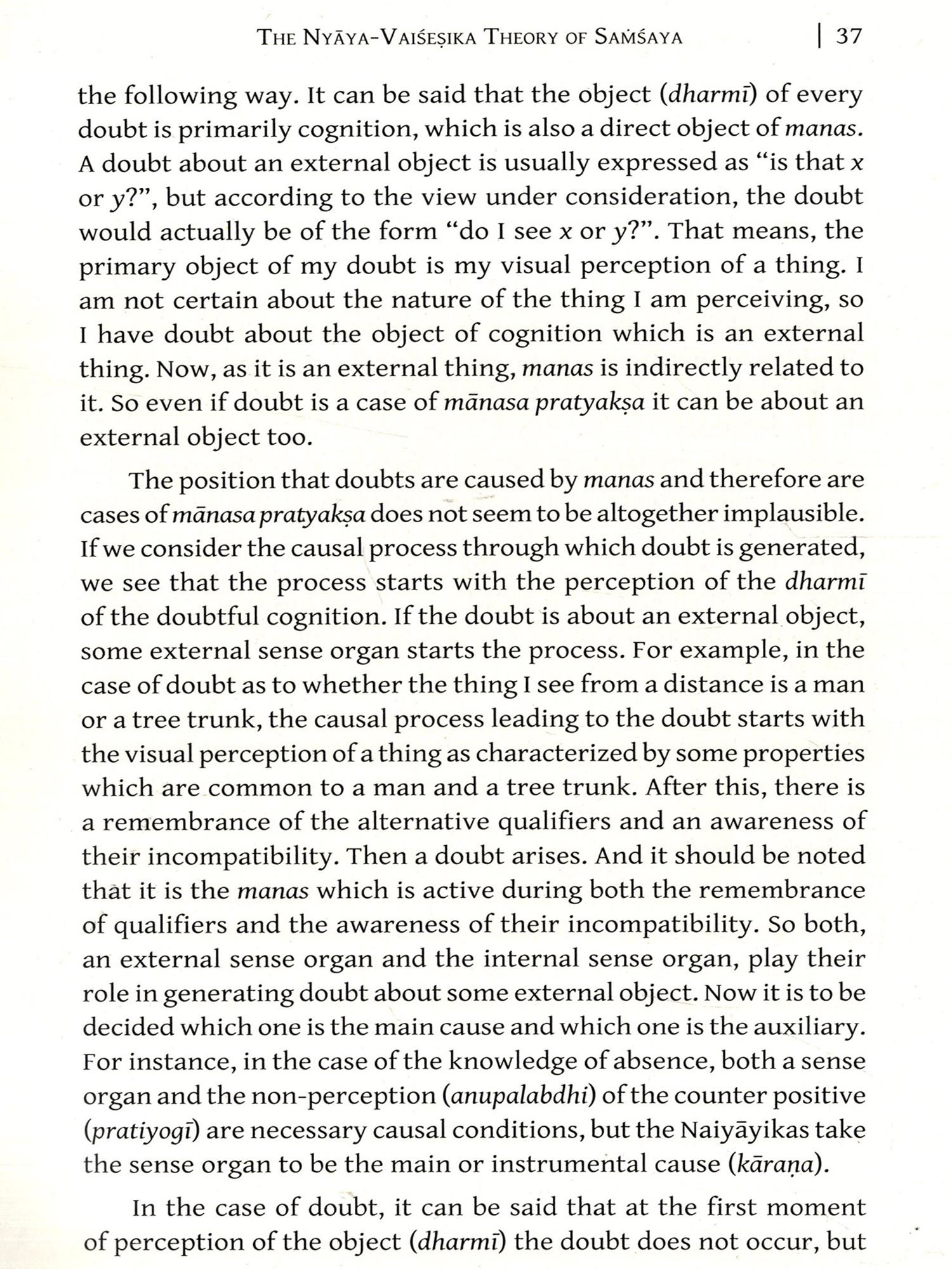 The second chapter is on the same topic, samsaya, but it concentrates on one single issue. It is about the nature of the kotis of samsaya. In a doubtful cognition, there is no uncertainty regarding the subject (dharmi) itself, doubt pertains only to the predicate part (dharma or koti), where alternative properties appear as possible predicates to the subject. There is difference of opinion between the old and new schools of Nyaya regarding the nature of the kotis, as to whether there can be more than two kotis and whether all kotis can be positive or whether should there be two kotis only, one of which must be positive and the other negative. These points are discussed in the essay, and the position held by the old school of Nyaya has been defended. According to it, there can be all positive kotis in a samsaya, therefore, it is not necessary that there should be a positive and a negative koti in all cases of doubt as maintained by the Navya-Naiyayikas.