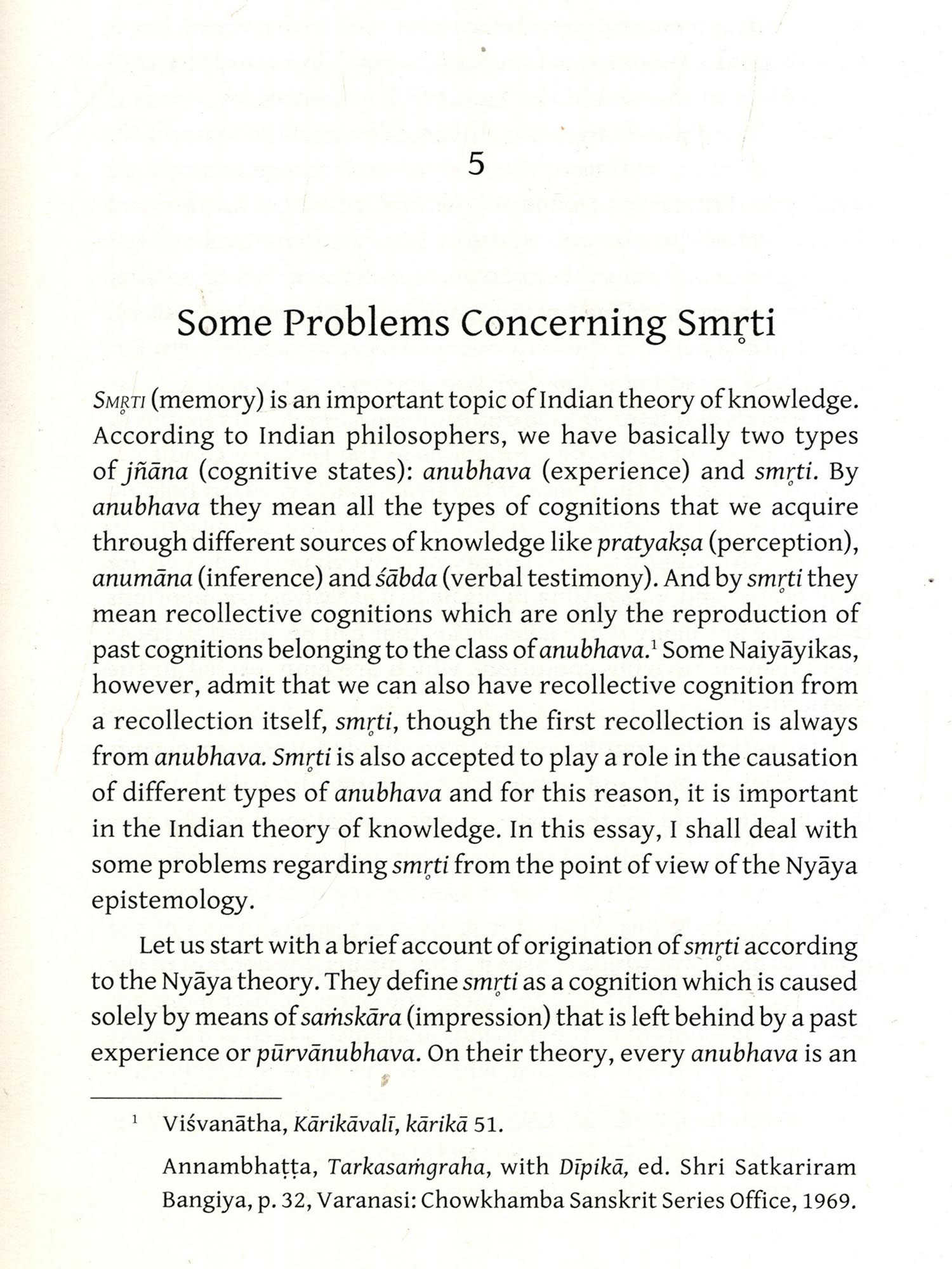 Chapter five is on smrti (memory). Smrti and anubhava are two basic types of cognition accepted by Indian philosophers. Smrti is recollective awareness, which is caused by the previous experience of its object, through impression (samskara). According to the Nyaya-Vaisesika philosophers, smrti cannot be regarded as prama (true cognition). This part of the topic has been discussed in the third essay of this collection. The present essay concentrates on two other questions. First, in the Nyaya epistemology smrti (recollective cognition) is considered to play a role in causing different types of cognition like pratyaksa, anumiti, upamiti and sabda-jnana; but if smrti is not prama (true), then how can the cognitions which are causally dependent on it be true? Second question is: what exactly is the object of smrti? Is it only a thing which was previously experienced? Or, does the thing along with the previous experience as well as the experiencer become the object of smrti (recollective awareness)? These questions and their answers from the Nyaya point of view have been elaborated in this chapter.