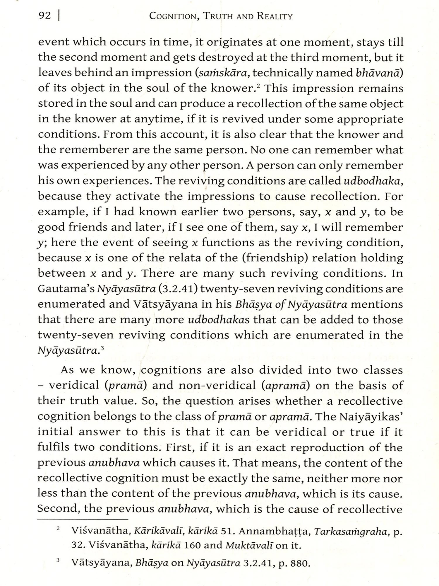 The next chapter deals with two basic concepts of Indian epistemology, viz. prama and pramana. Besides clarifying these concepts from the Nyaya point of view, another problem has been addressed. The Naiyayikas face a dilemma as to whether the status of prama can be given to certain pieces of cognition which are true (yathartha) only by accident but are not derived through pramana (proper means). In Nyaya texts, some problematic cases are considered where the cognition, though not caused by pramana, turns out to be true (yathartha).