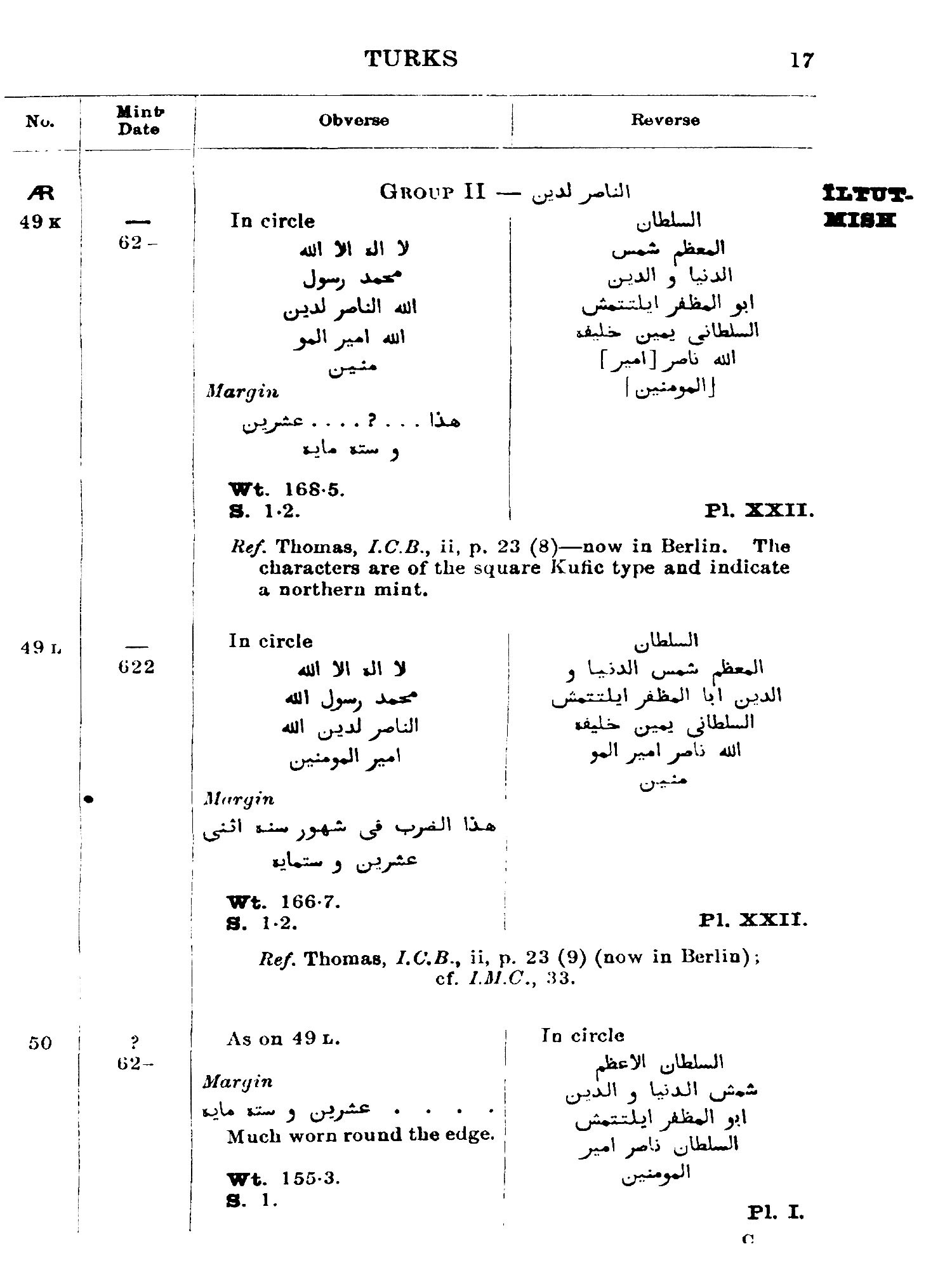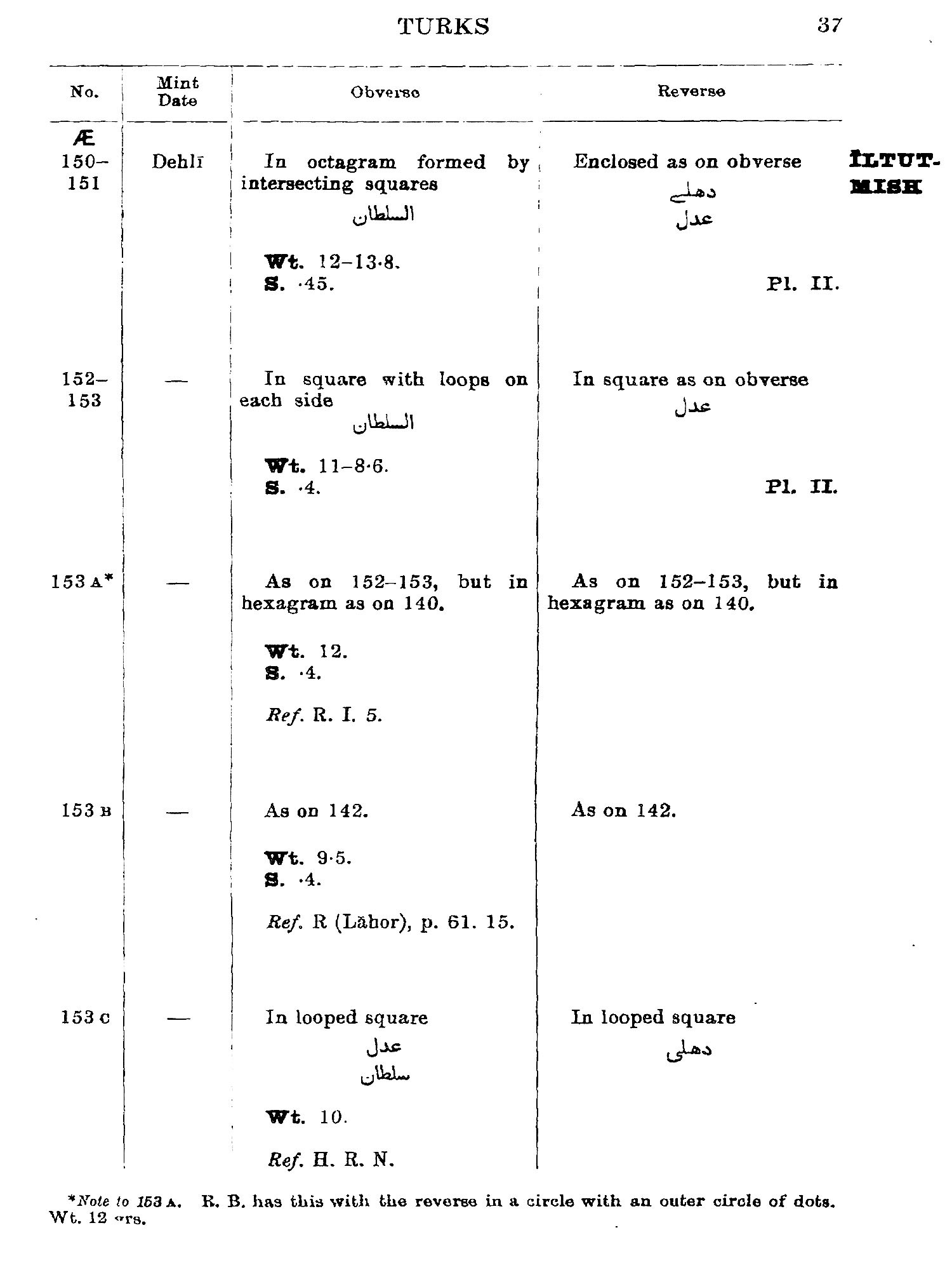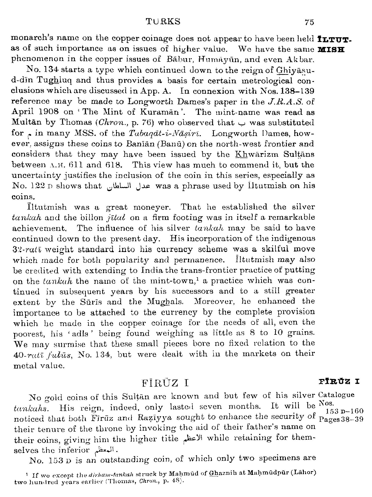 No one can embark on a study of the coins of the Sultans of Dehli without being conscious of the great debt that he owes to Edward Thomas, the distinguished author of The Chronicles of the Puthan Kings of Dehli. The fact that subsequent discovery of coins, unknown to and unsuspected by him, makes it impossible to accept many of his conclusions on the metrology of the series, cannot detract from the credit of his achievement. To Edward Thomas, then, I desire to record my respectful acknowledgement.