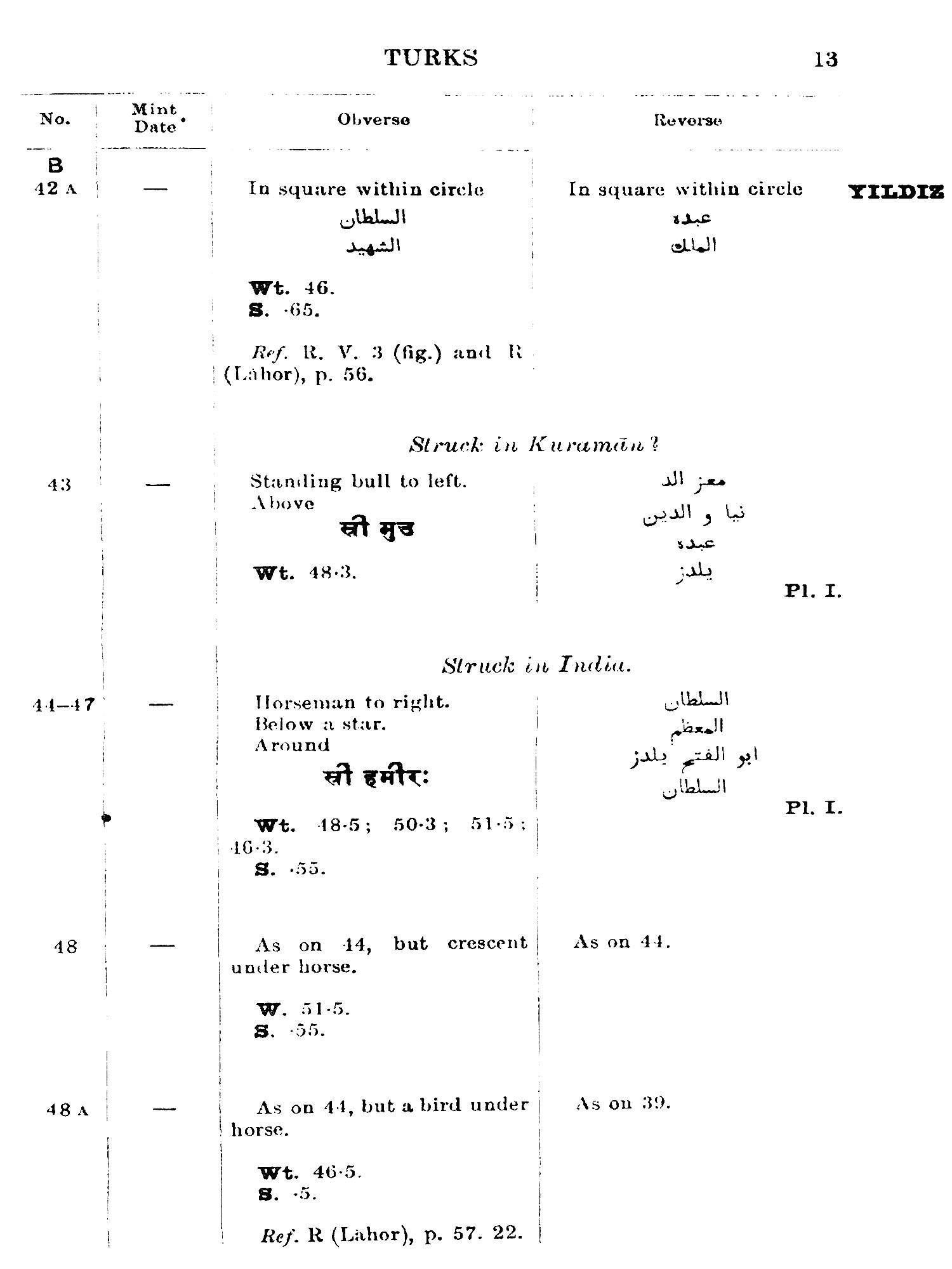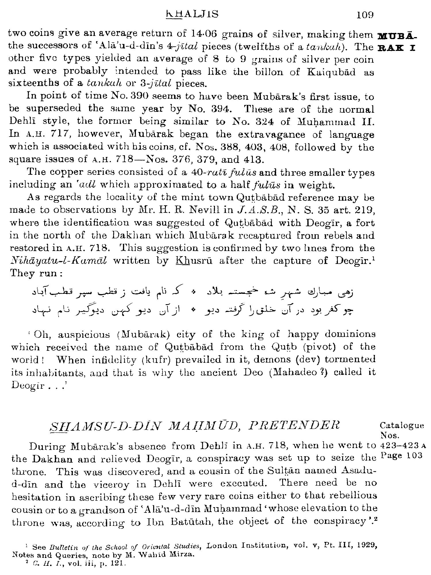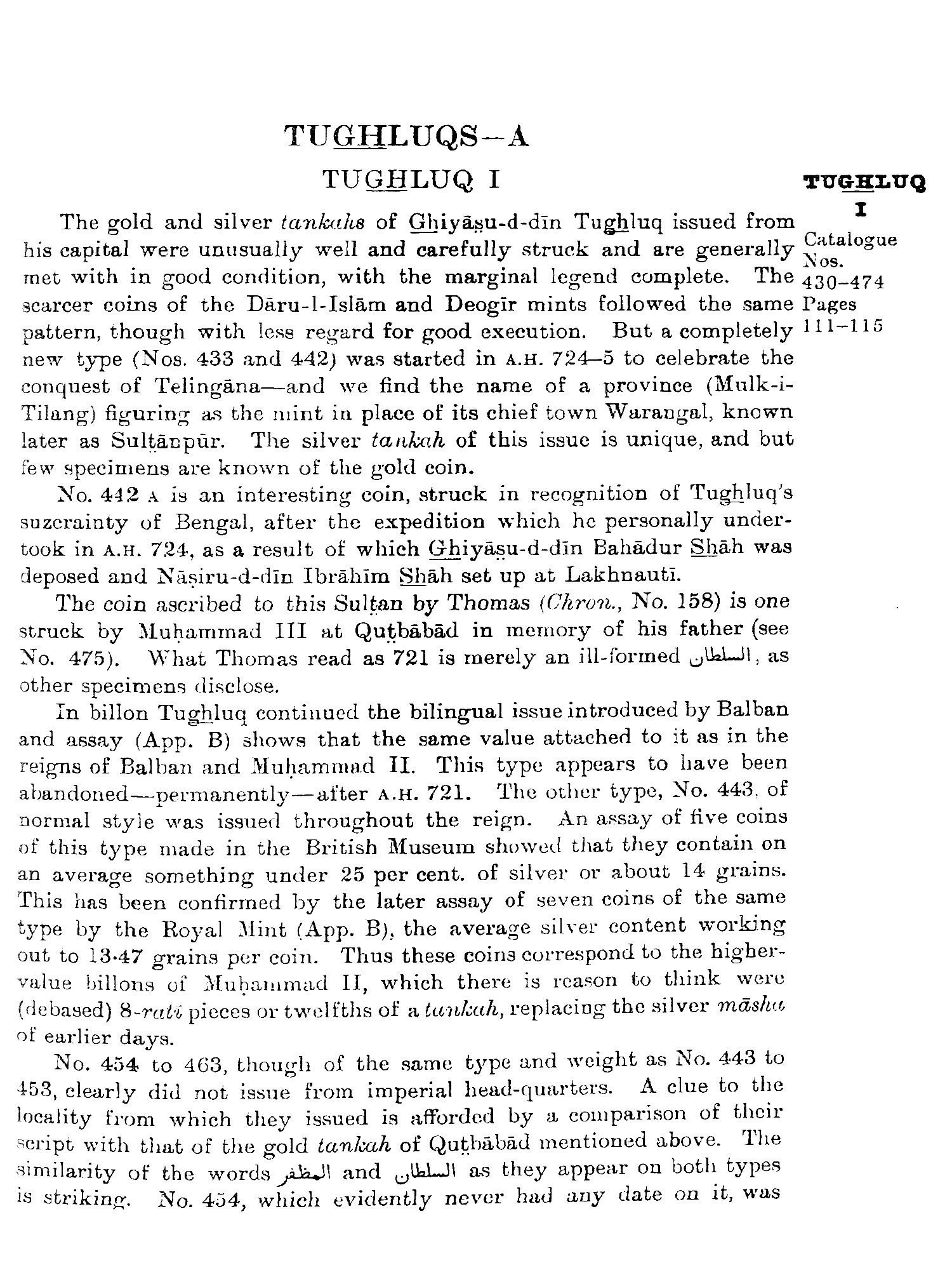 THE nucleus of this Catalogue is a collection formed by the author in the United Provinces of Agra and Oudh between the years 1894 and 1924. It seemed fitting that the coins should find a permanent home in Delhi, of whose Sultans they are a numismatic record. An offer was accordingly made and accepted. The gold and silver coins (53 A-223 At) were acquired by the Director-General of Archaeology in India for the Delhi Museum. The billon and copper coins (over 1,200) were presented on the understanding that the collection should be preserved intact, and a printed catalogue of it published on the lines of the coin catalogues issued by the principal museums in India. This I undertook to prepare.