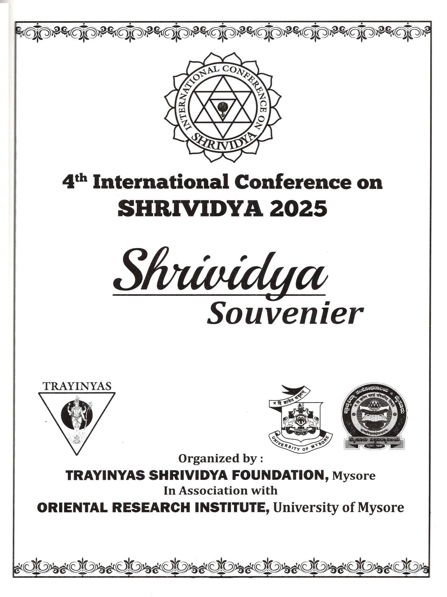 With deep reverence to Sri Lalita Mahātripurasundari, we present the Preface to the 4th International Conference on Shrividya held on 24th and 25th of December at Senate Bhavan, University of Mysore Manasagangotri, Organized by Trayinyas Shrividya Foundation in association with the Oriental Research Institute, Mysuru Guided by the vision of integrating Knowledge (Jnana), Science (Vijnana), and Philosophy (Darsana), the conference adopts the thematic focus "Srividya: Yantra, Mantra, Tantra," acknowledging the sacred triad that constitutes the heart of this tradition.