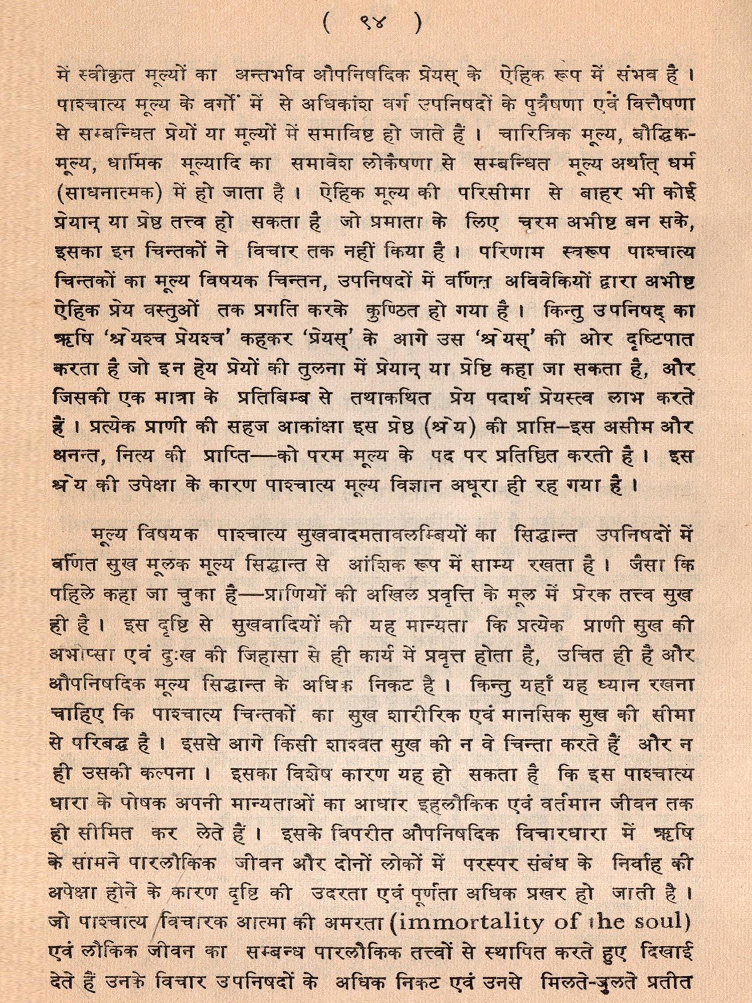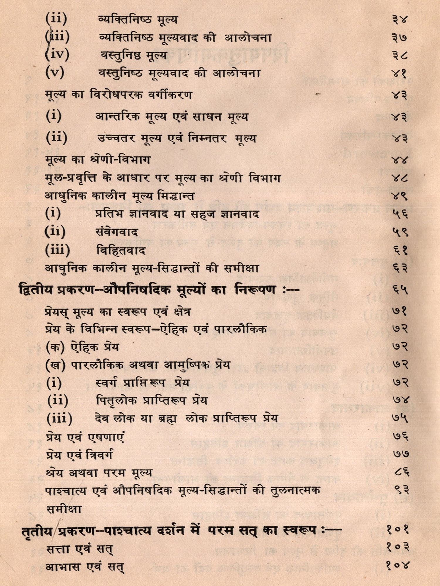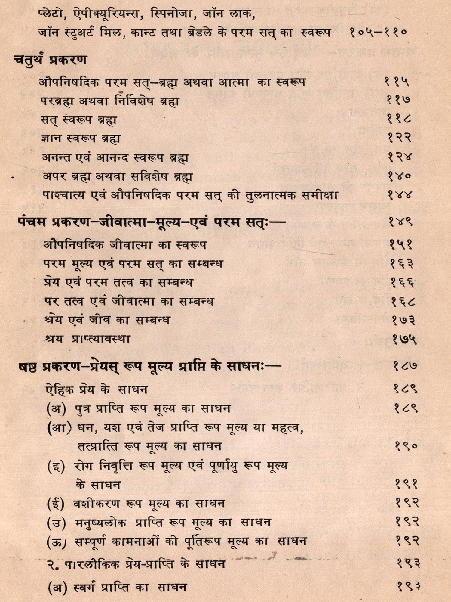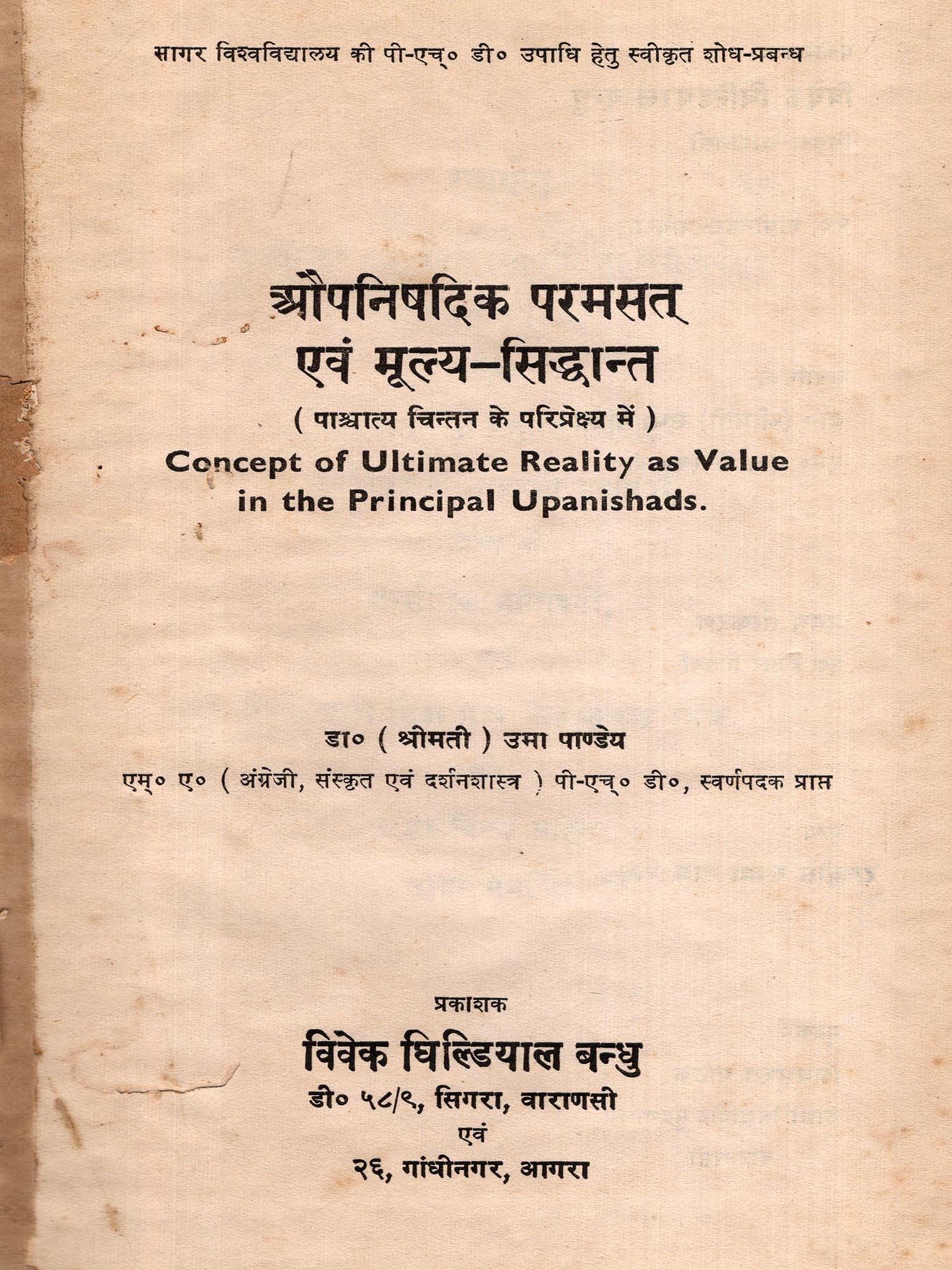 It was a pleasure for me to have a look at the work of Dr. Mrs. Uma Pandeya. I am happy to say that she has made a very commendable effort to sustain and substantiate her thesis concerning ultimate reality as the highest value in the principal upanishads. Her presentation is very lucid and well documented. I am of the opinion that the work is a definite contribution to the study of the Upanishads and is sure to interest all those who are keen about understanding the philosophy of the Upanishads. References to western thinkers are very appropriate and undoubtedly enhance the value of the work. I think this is the only work of its kind in Hindi so far. Others like Dr. R. P. Singh and Dr. Javadekar have made an axiological approach to Advaita Vedanta but the present work is not so much a study of Advaita Vedanta as a study of the Upanishads.