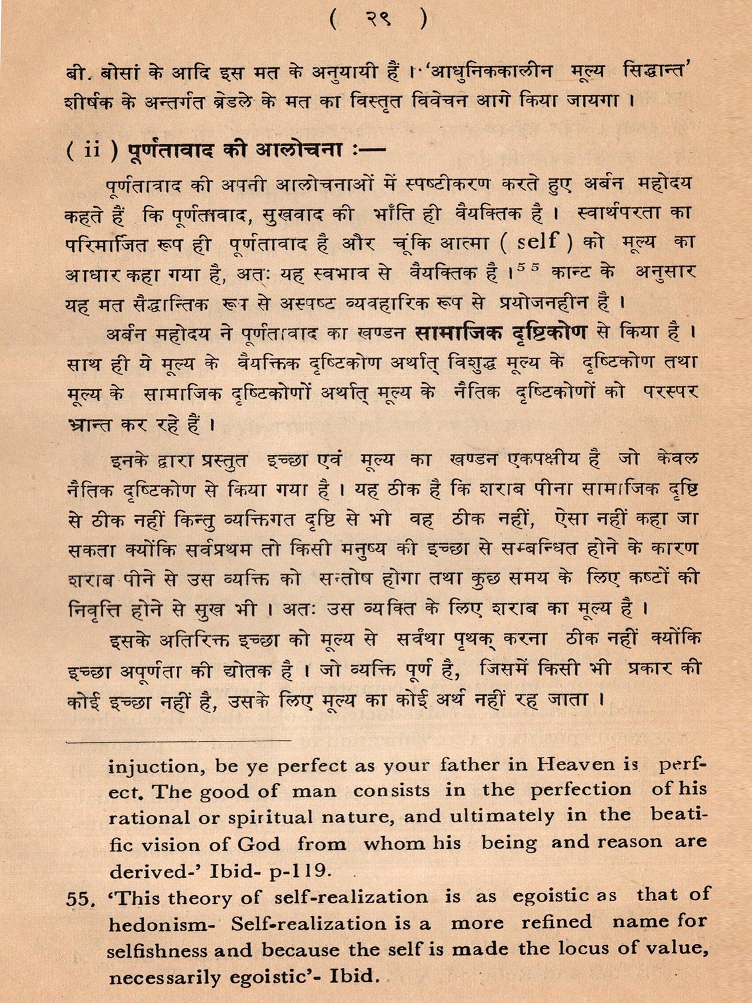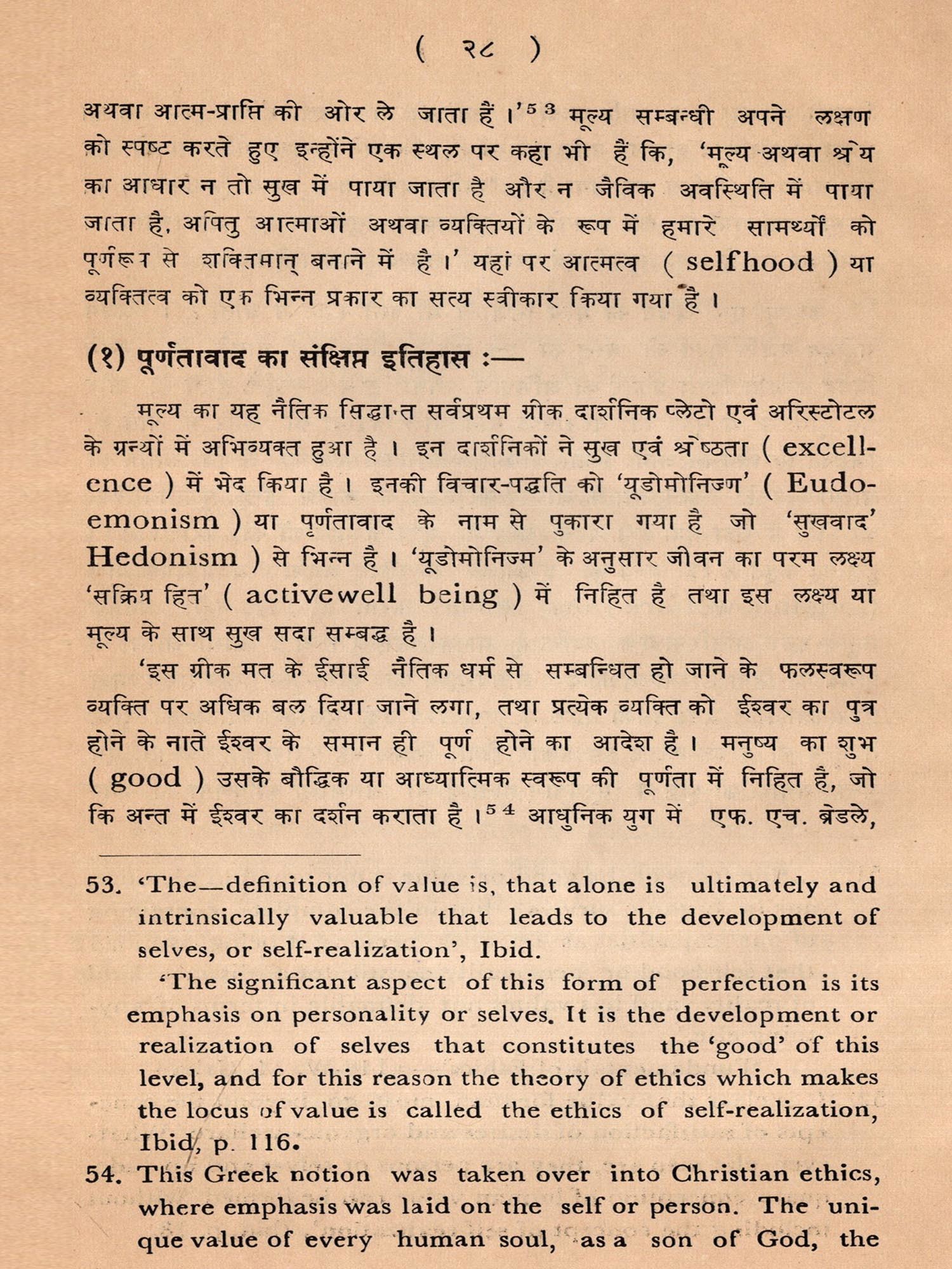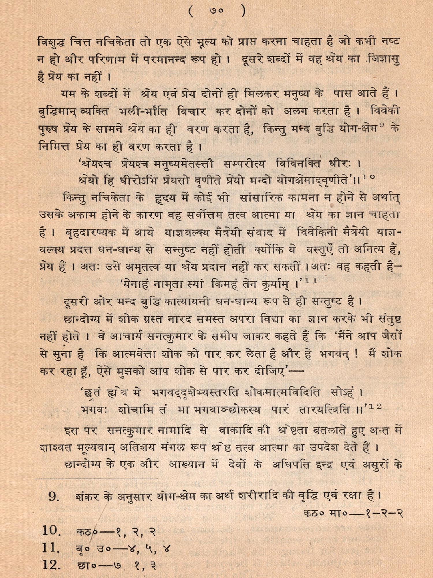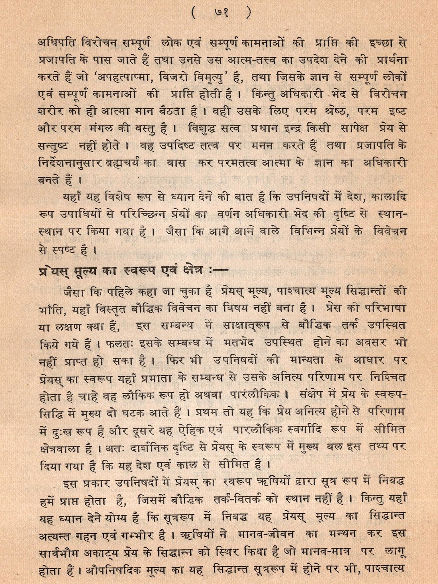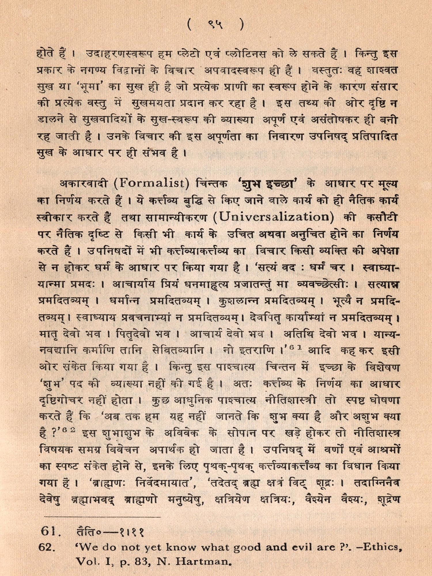 It was a pleasure for me to have a look at the work of Dr. Mrs. Uma Pandeya. I am happy to say that she has made a very commendable effort to sustain and substantiate her thesis concerning ultimate reality as the highest value in the principal upanishads. Her presentation is very lucid and well documented. I am of the opinion that the work is a definite contribution to the study of the Upanishads and is sure to interest all those who are keen about understanding the philosophy of the Upanishads. References to western thinkers are very appropriate and undoubtedly enhance the value of the work. I think this is the only work of its kind in Hindi so far. Others like Dr. R. P. Singh and Dr. Javadekar have made an axiological approach to Advaita Vedanta but the present work is not so much a study of Advaita Vedanta as a study of the Upanishads.