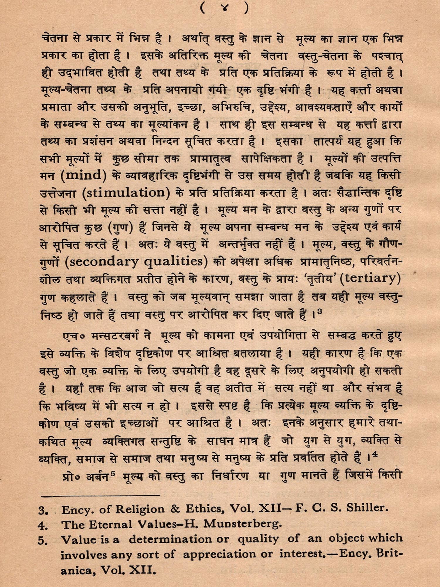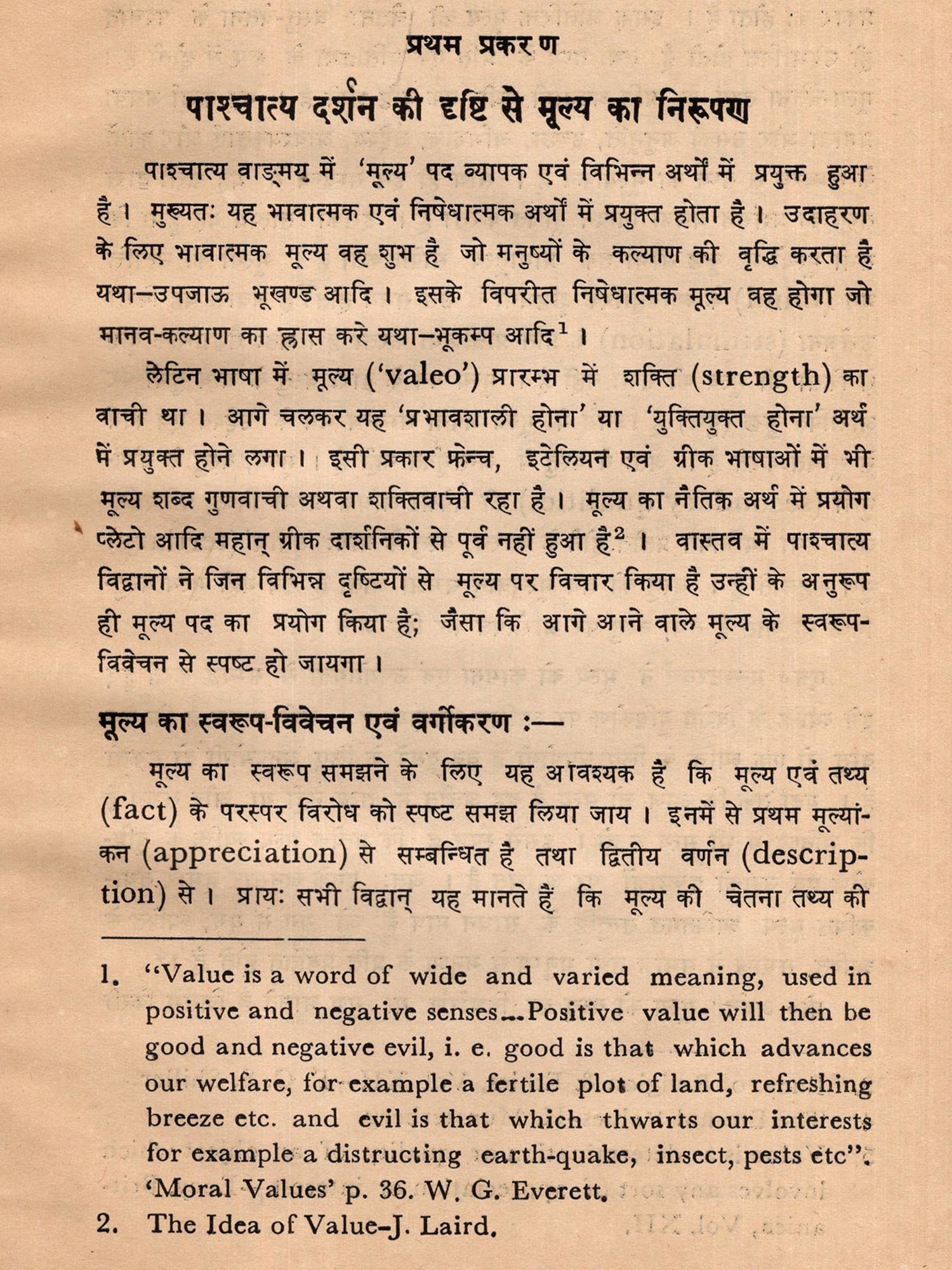 विश्व के समग्र पदार्थ मूल्यवान् होने पर ही उपयोगिता और उपादेयता की कोटि में प्रवेश लाभ करते हैं। परन्तु मूल्य का स्वरूप एवं लक्षण क्या है. मूल्य सापेक्ष्य होता है या निरपेक्ष, यह वस्तुनिष्ठ है या व्यक्तिनिष्ठ इत्यादि ऐसे जटिल प्रश्न हैं जिनका समाधान करने के लिए पाश्चात्य दार्शनिक-विद्वानों ने अपने ग्रन्थों में स्तुत्य प्रयास किया है और अपने-अपने मतों की स्थापना की है।