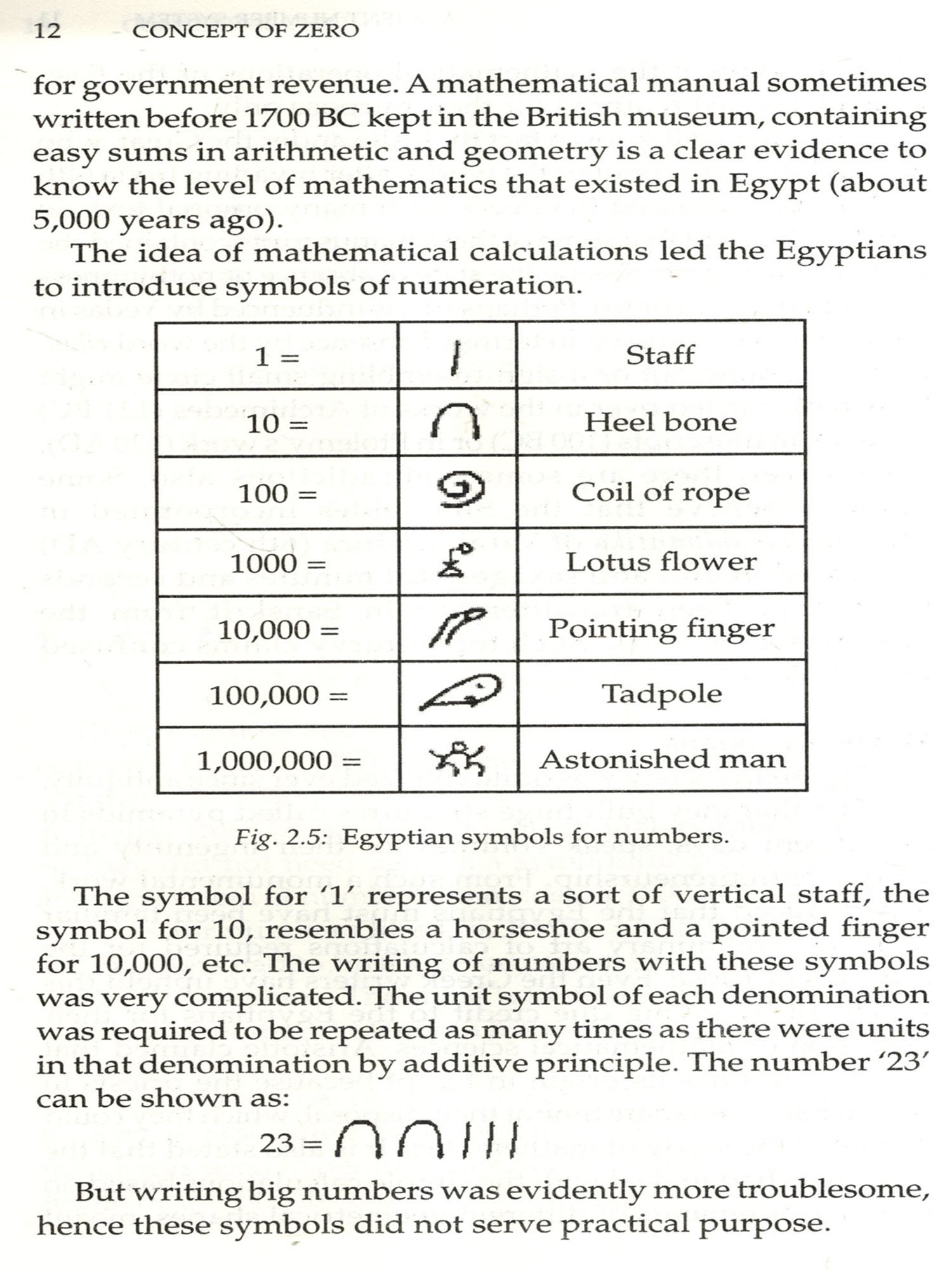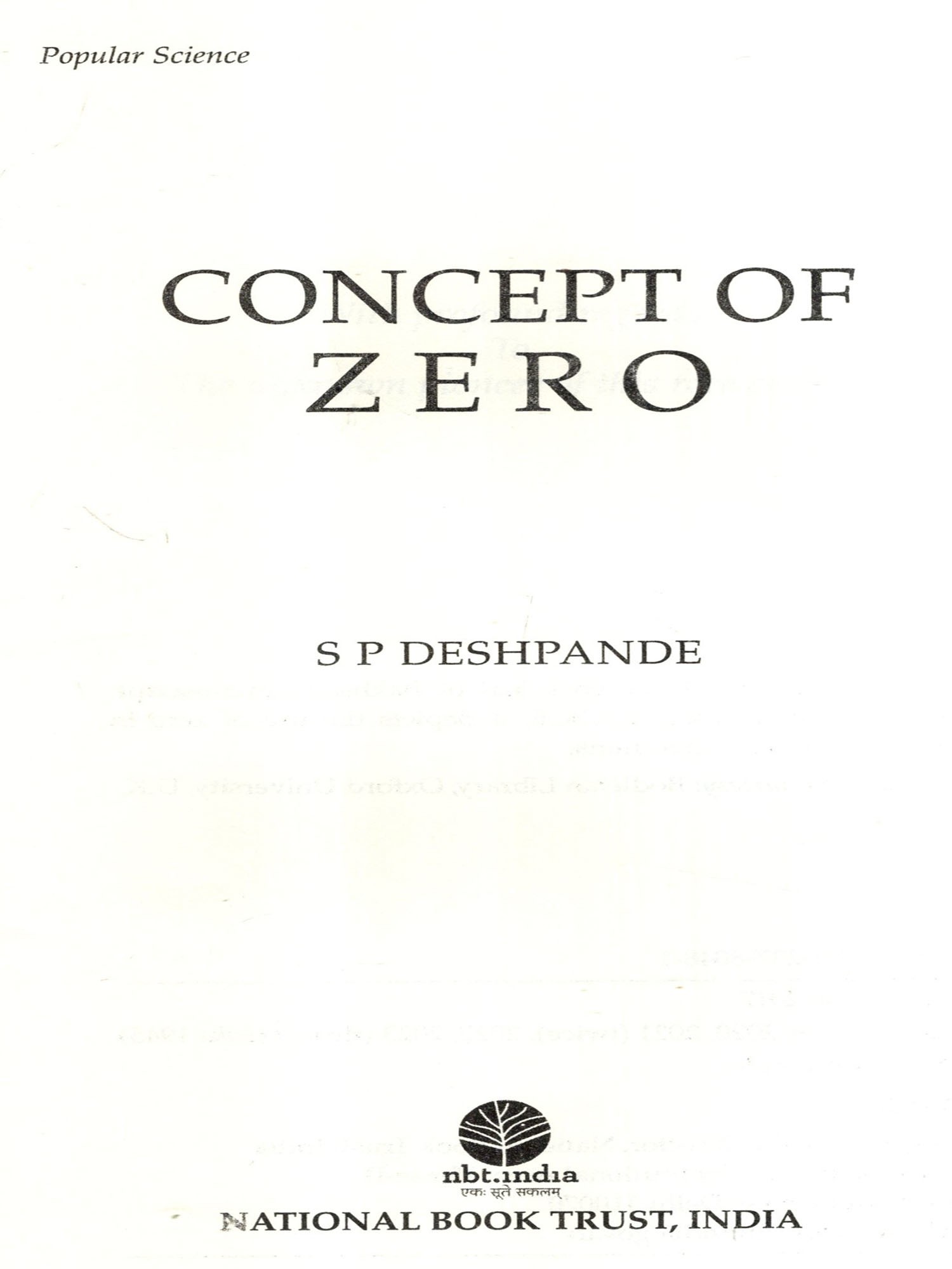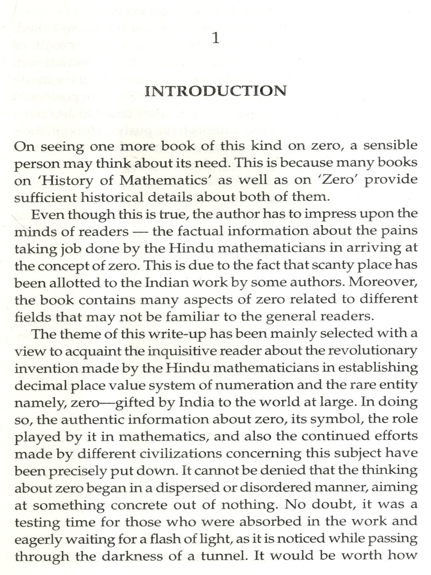 The author is pleased to handover this book, Concept of Zero to general readers who are curious to know more about zero. In fact, this book is an outcome of an offer made by the National Book Trust, India to the author. While writing the book, the author has taken a thorough survey of the deep historical efforts made by different ancient civilizations all over the world. Especially their primitive efforts of introducing various symbols for numbers, choice of the base number for a numeral system, aboriginal signs for zero, word numerals, expressions of large numbers in power of 10, all are neatly recorded by providing the evidences, wherever possible, to support the claims.