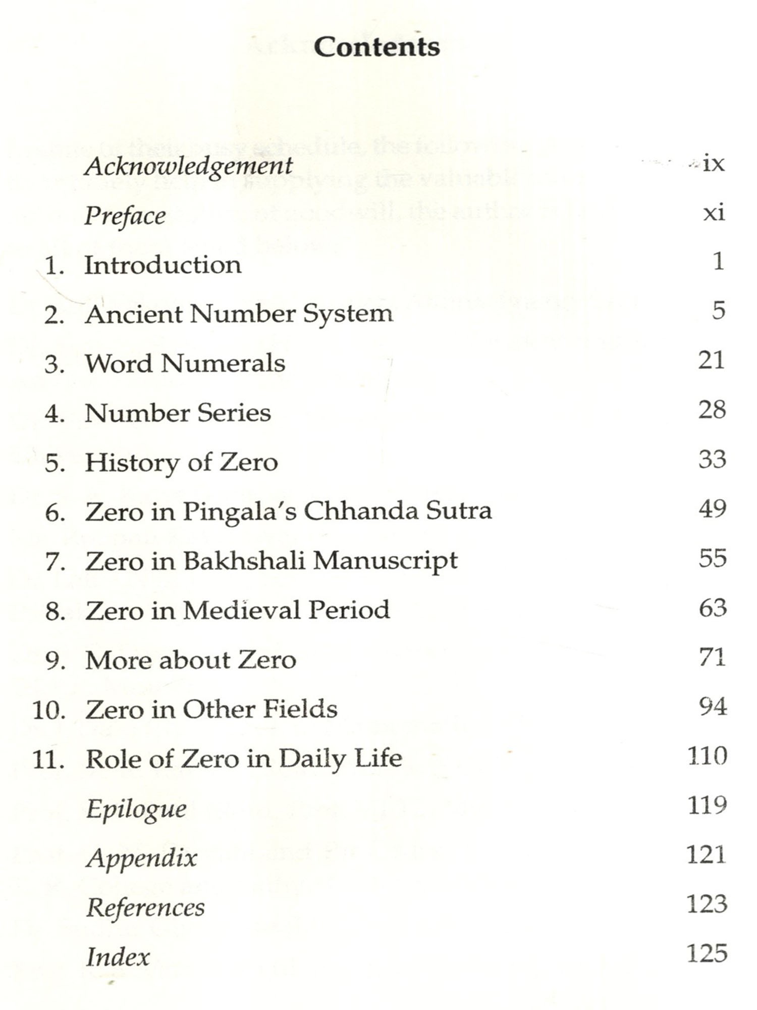 The author has taken care to include fields other than mathematics in which zero has prominently appeared in philosophic and mystic areas like Buddhist Shunyavada, Nyayavishesika's abhava, zero in Dnyaneshwari, Patanjali Yog Darshan, Indian music, Shunya Kumbhaka, zero budget and so on. In short, all possible aspects of zero are mostly incorporated here.