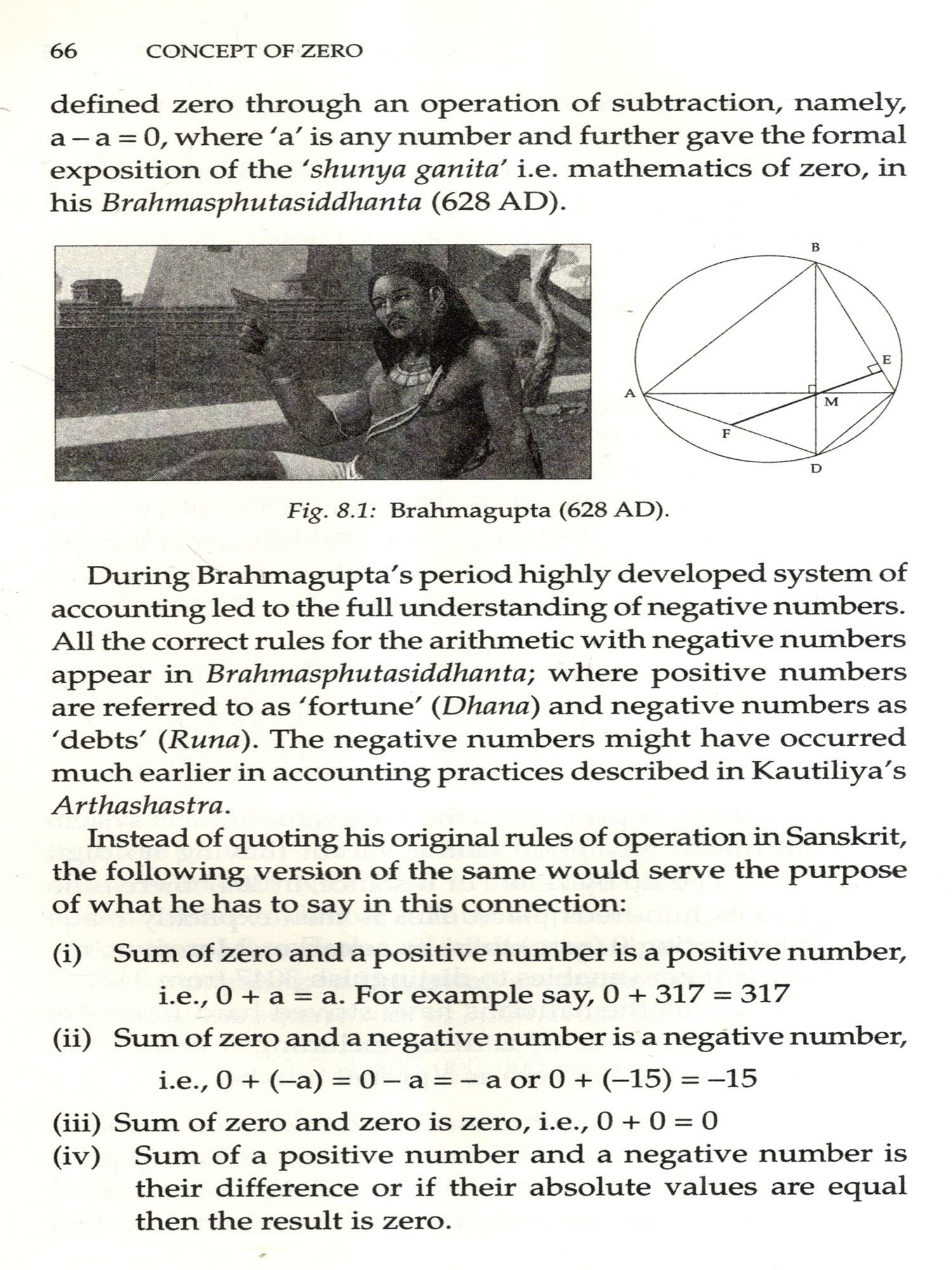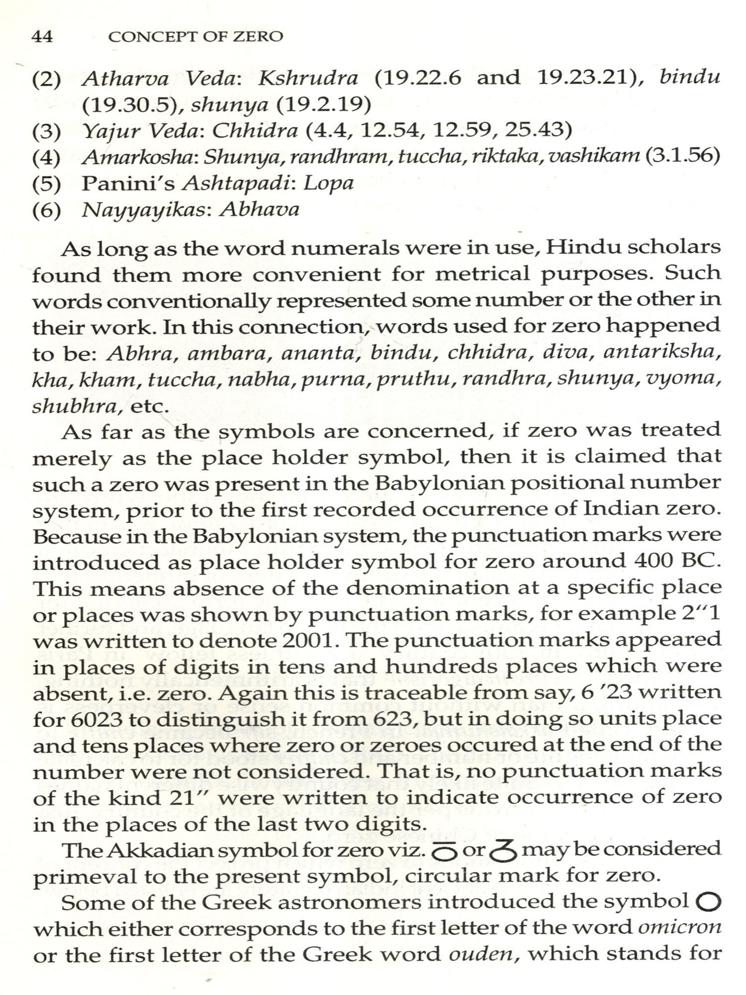 The achievement of the ancient Indians in the field of mathematics with special reference to the 'concept of zero,' forms the most astonishing event in the history of civilization. It is hoped that the present work would suffice to pinpoint in brief, the important features of the bright contribution made by the unknown Hindu scholar to whom, in fact, we must be ever grateful and politely bow before his extraordinary scholarship. While arriving at the 'concept of zero,' he might not have been aware that his invaluable piece of work is going to be revolutionary and that in future, it would be inevitable for tremendous development in the field of mathematics.