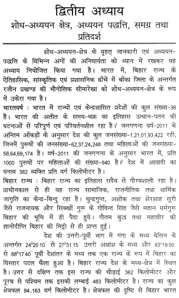 द्वितीय अध्याय में "शोध अध्ययन-क्षेत्र, अध्ययन पद्धत्ति, समग्र तथा प्रतिदर्श का चयन" को दर्शाया गया है। भारतीय मानचित्र में बिहार राज्य के भौगोलिक क्षेत्र के अन्तर्गत बाँका जिला के ऐतिहासिक धरोहर, सांस्कृतिक पहचान, पर्यटन स्थल, विभिन्न सम्प्रदायों के धार्मिक आस्था की विरासत एवं प्रशासनिक ढ़ाँचे को सन्दर्भित किया गया है तथा शोध-अध्ययन हेतु अपनायी गयी अध्ययन-पद्धत्ति के विभिन्न अंगों को रेखांकित किया गया है।