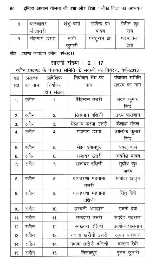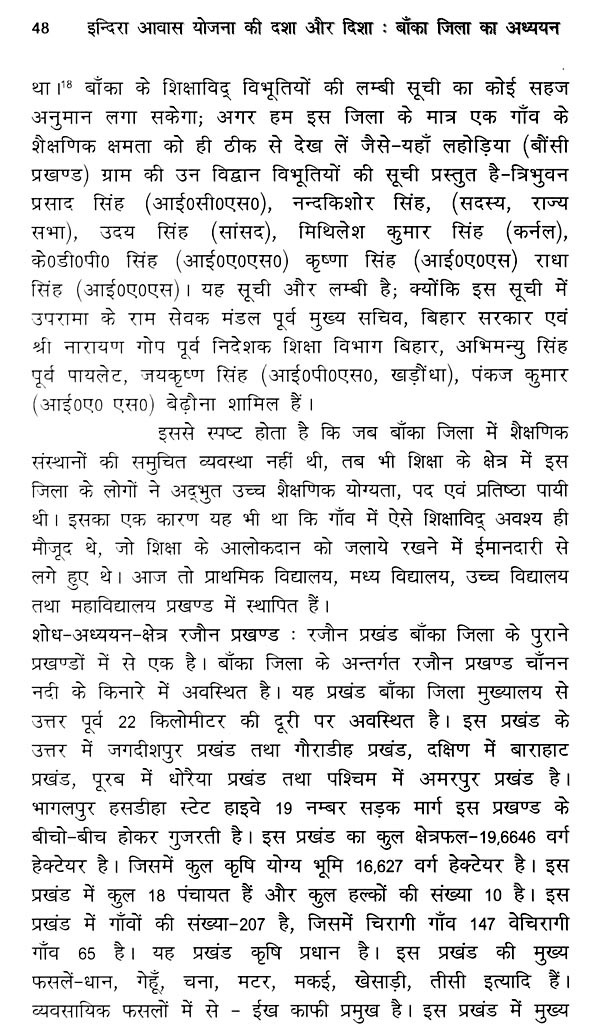 पंचम अध्याय में "रजौन प्रखण्ड के अन्तर्गत इन्दिरा आवास योजना के क्रियान्वयन का आंकलन एवं मूल्यांकन" को रेखांकित किया गया है। विभिन्न पंचवर्षीय योजनाओं के अन्तर्गत बाँका जिला के रजीन प्रखण्ड में "इन्दिरा आवास कार्यक्रम" चलाया जा रहा हैं। दूरगामी आर्थिक नीतियों के अन्तर्गत इन्दिरा आवास योजना के क्रियान्वयन की वजह से केन्द्रीय सरकार के ग्रामीण विकास मंत्रालय का आर्थिक बजट सबसे भारी-भरकम बजट वाला मंत्रालय बन गया।