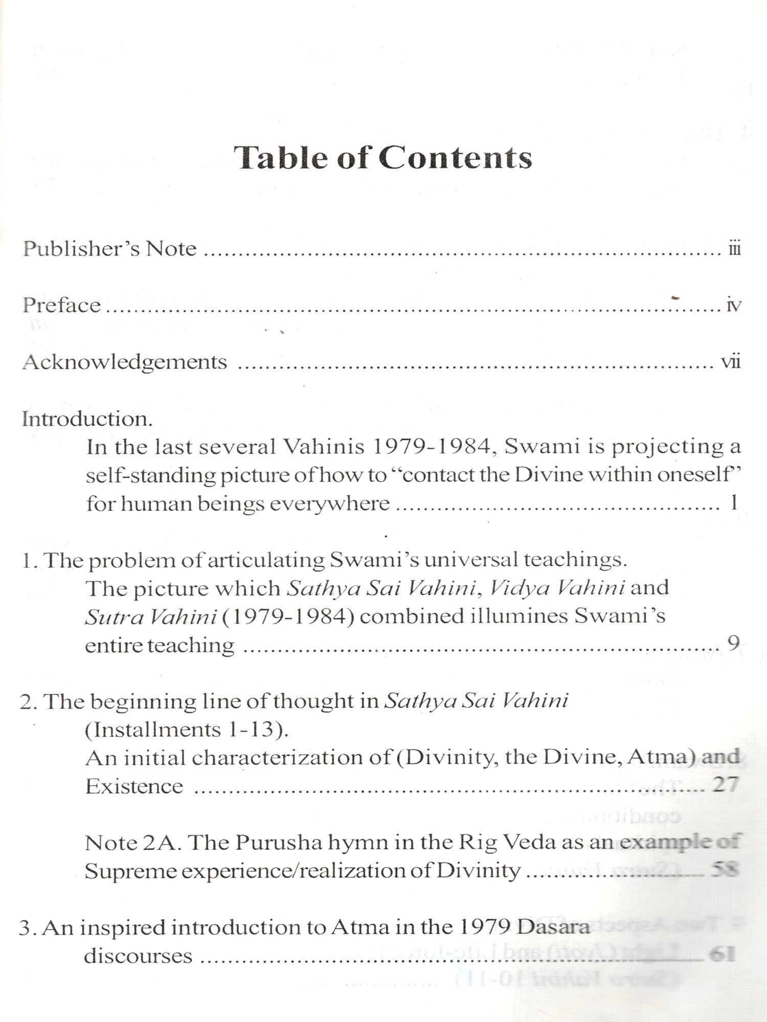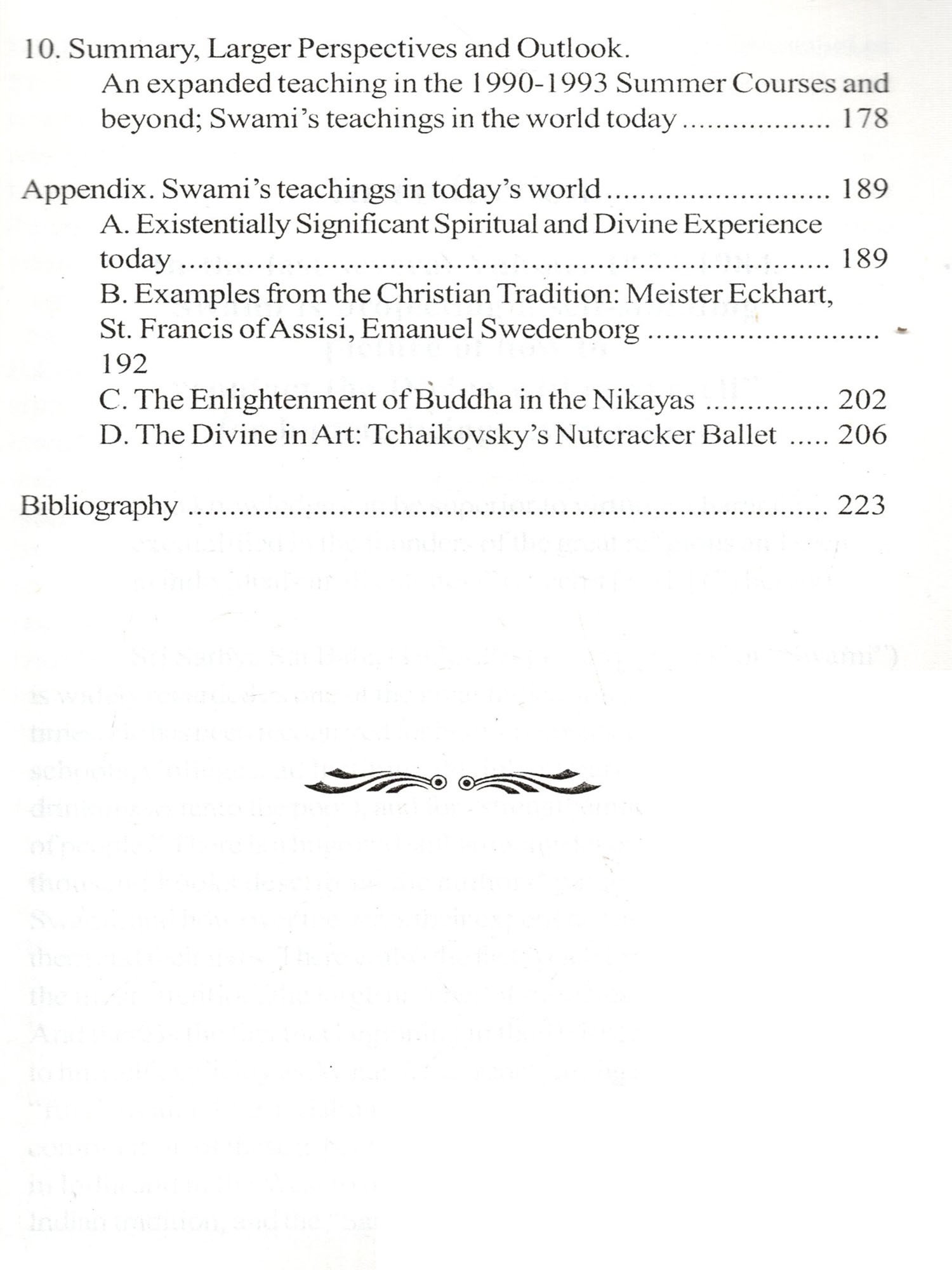 The workshop was lively, there was tremendous shared good will and many expressions of heartfelt feelings. Thinking about this experience, I began to feel that there was a need for a presentation of "Swami's universal teachings" that was less elaborate than several hundred pages, which would speak to readers from all countries and cultures, particularly readers from the West, and that would also be useful to Indian readers and devotees of Swami. The result is the present book. The book aims to give an initial understanding of Swami's universal teachings as he expounded them in his last four Vahinis (1979-1984), corresponding to Chapters 1-3 of the C-D Manuscript. I have tried to write informally, using Swami's words as much as possible, but with sufficient detail so that a reader can connect connect what Swami is saying with his own life and experience and with issues and current developments in his own culture and society. These kinds of things are pursued much more fully in the C-D Manuscript.