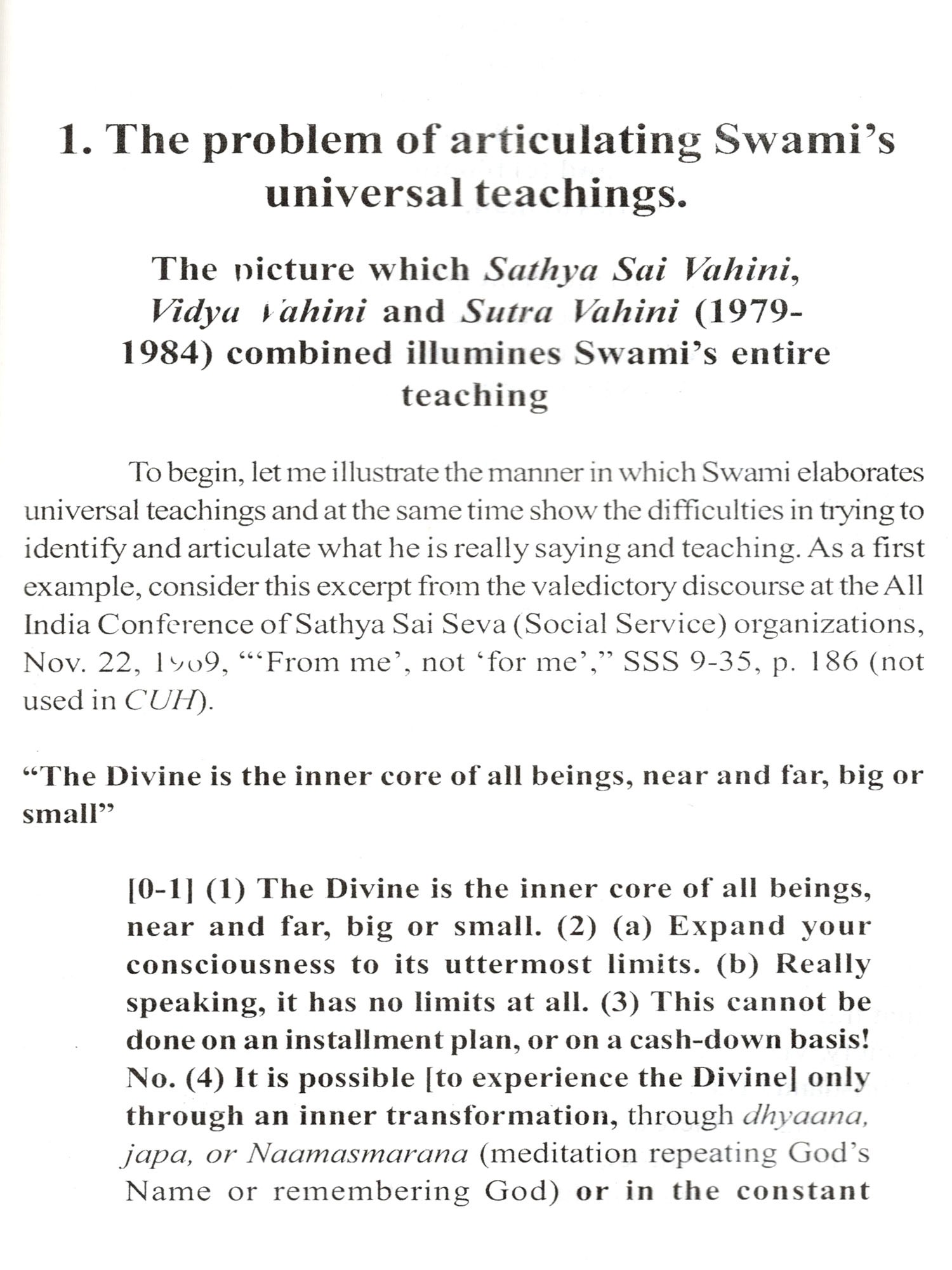 Sri Sathya Sai Baba (1926-2011) (here, "Baba" or "Swami") is widely regarded as one of the great Indian spiritual figures of modem times. He has been recognized for his numerous social projects (hospitals, schools, Colleges, an Institute of Higher Learning, projects to bring drinking water to the poor), and "strengthening the faith of millions of people." There is a huge and still growing devotee literature of several thousand books describing the authors' personal experiences with Swami, and how over the years their experience as a whole transformed them and their lives. There is also the fact which in the media has aroused the most attention, the large number of miracles associated with him. And there is the fact that beginning in the 1960s, Swami often referred to himself explicitly as Avatar, ie, as representing a "Divine Descent," a "full" Avatar like Krishna. In any case (maybe as a result of the combination of these aspects), Swami's teachings are considered both in India and in the West to be largely "traditional," i.e. in the ambit of Indian tradition, and the "Sai Baba Movement" is regarded as basically an Indian religious movement which, like several others, has spread all over the world.
